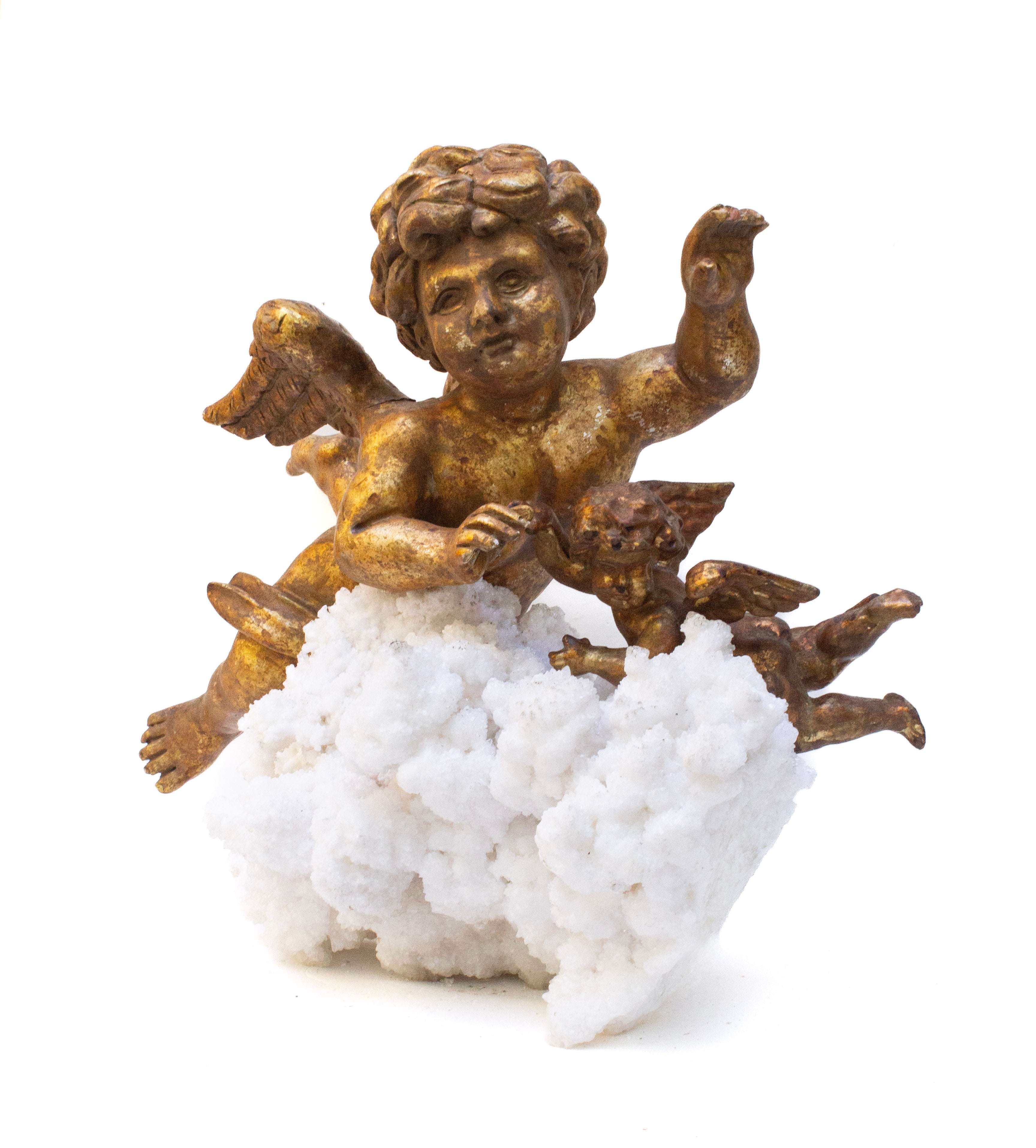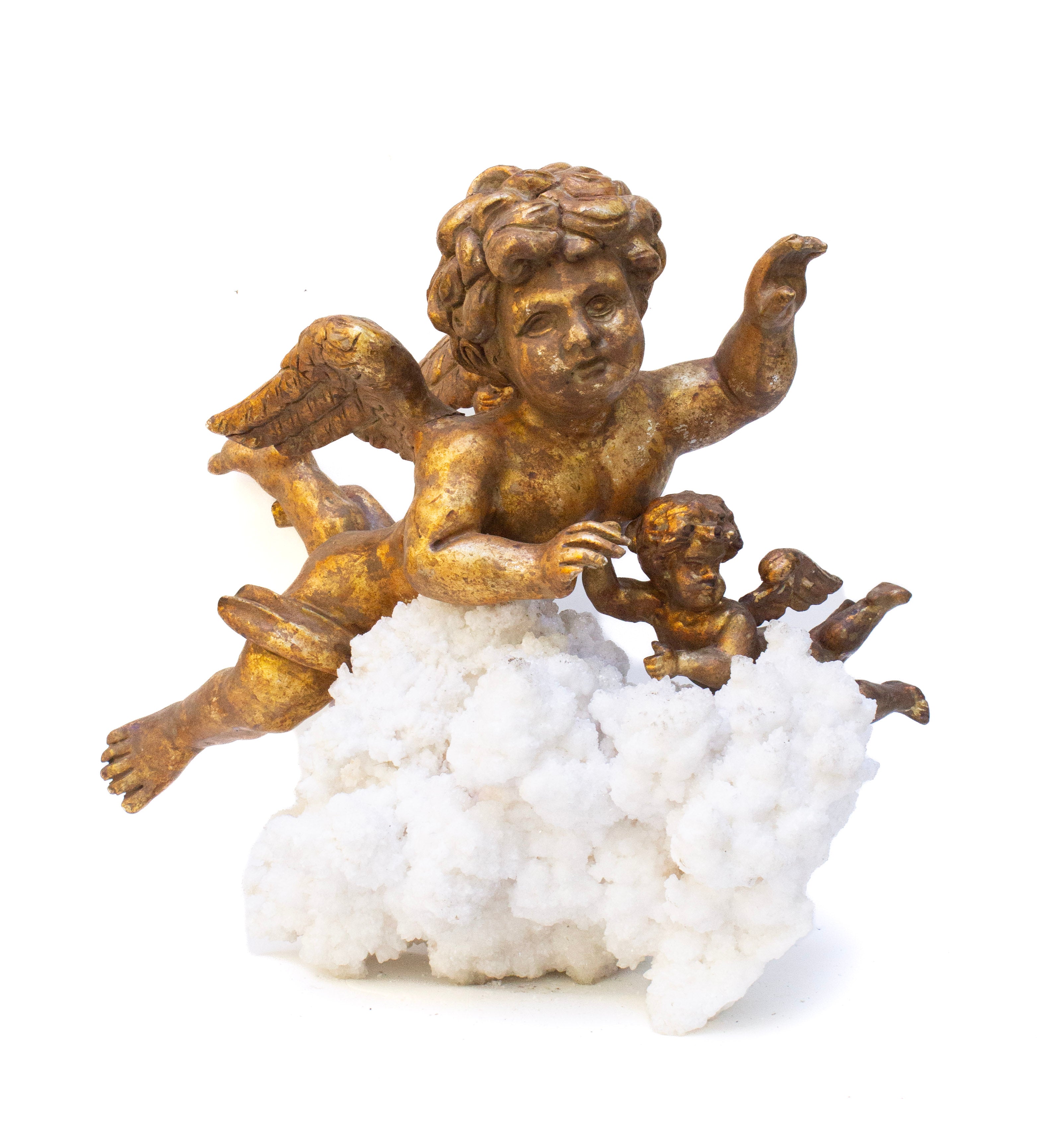 The Italian angels have been joined with the natural specimen to create a sculptural work of art. The figurative sculpture incorporates the historical ecclesiastical artifacts from the past with the organic to preserve the importance of the pieces while creating a contemporary work of art.