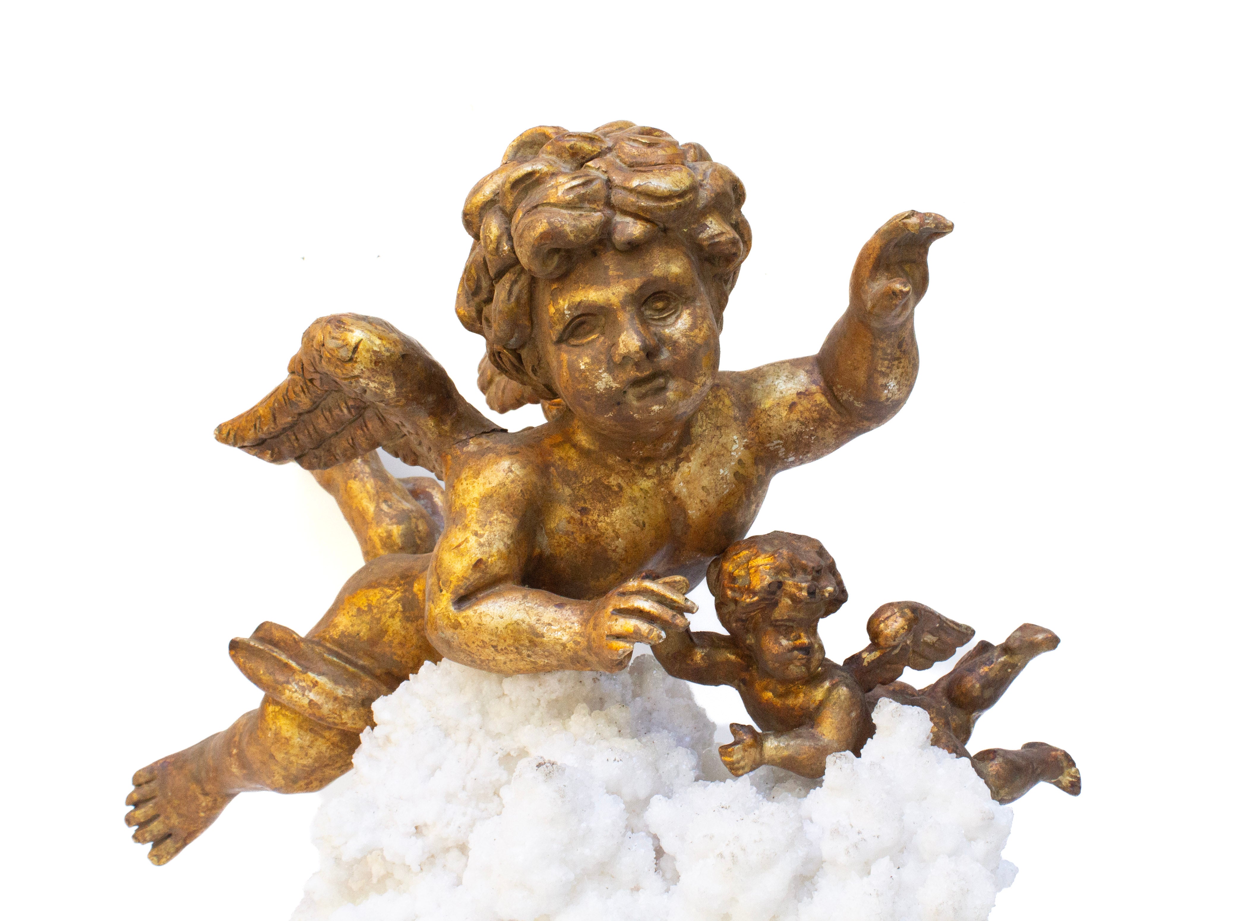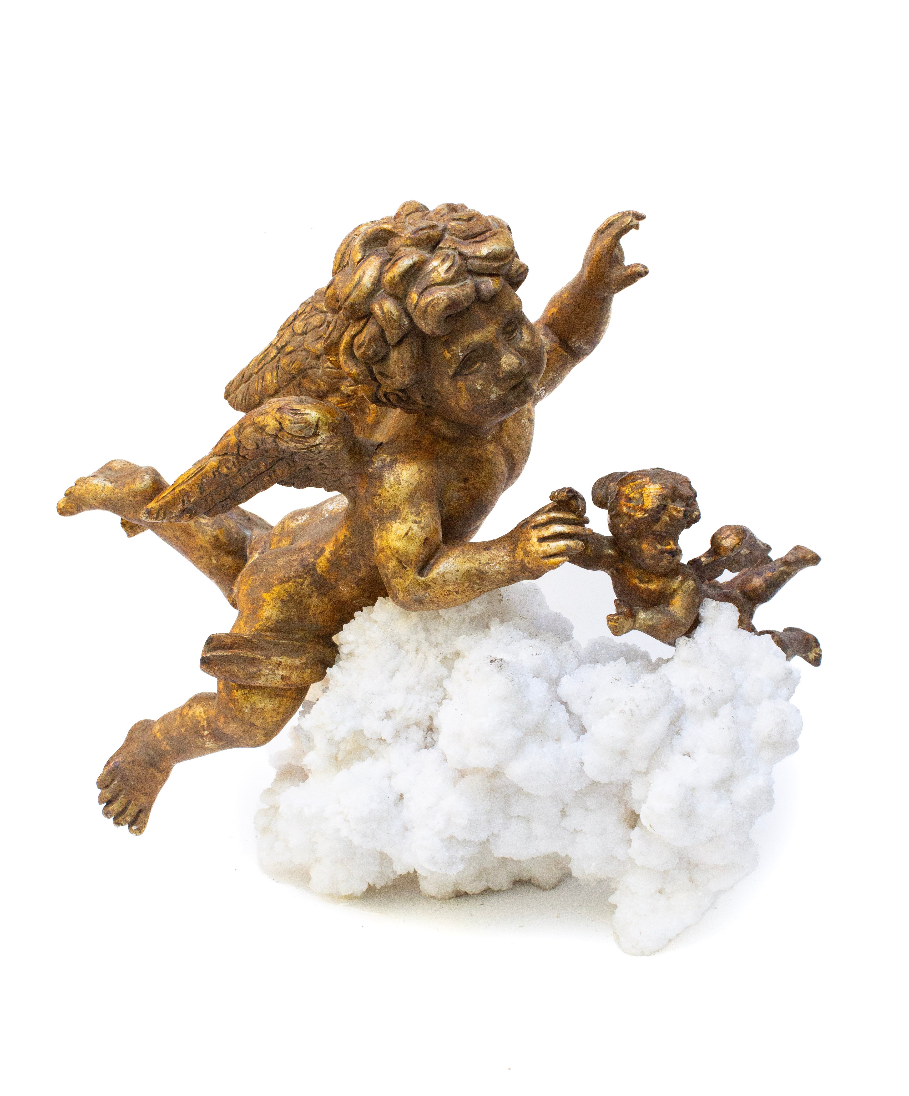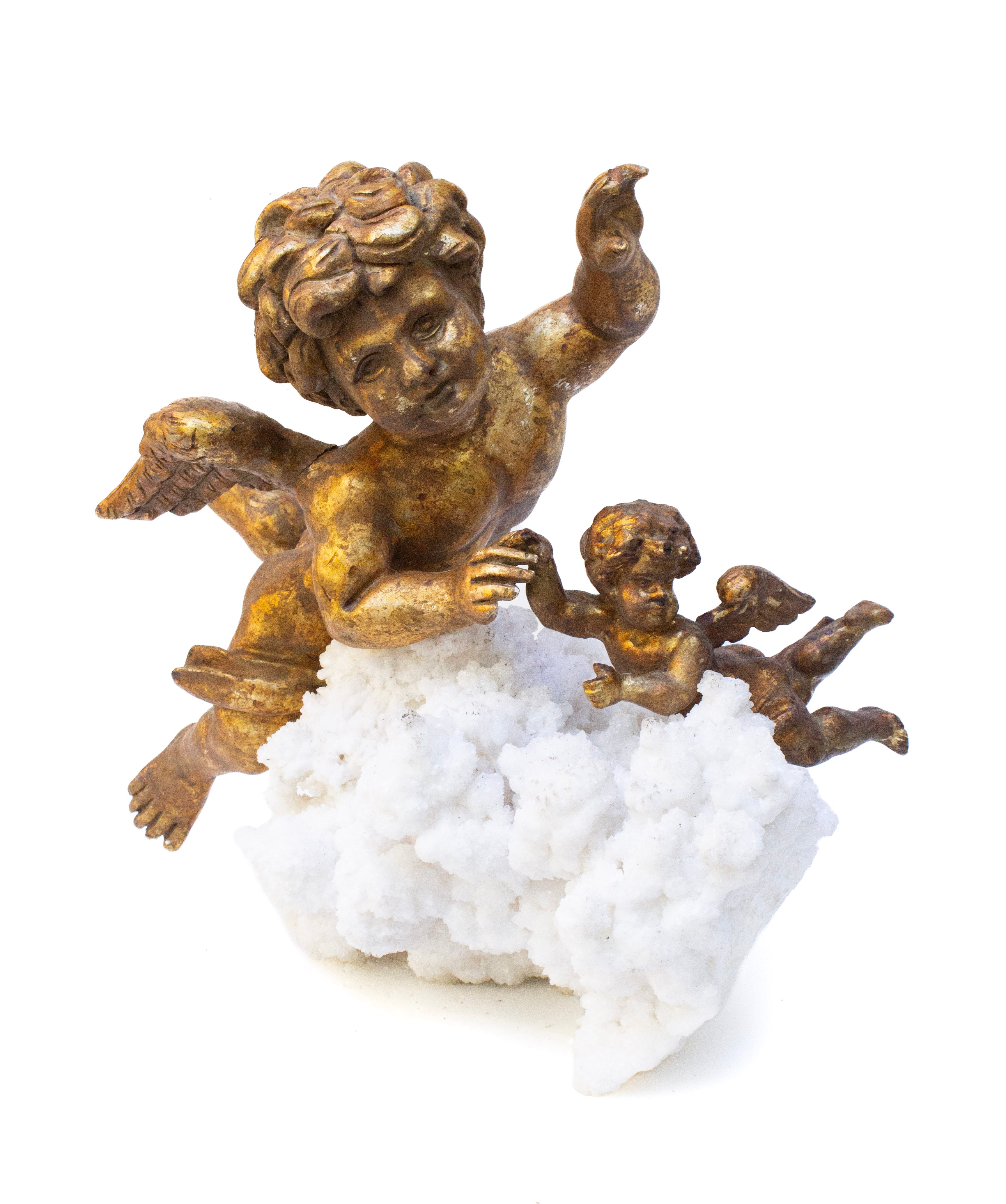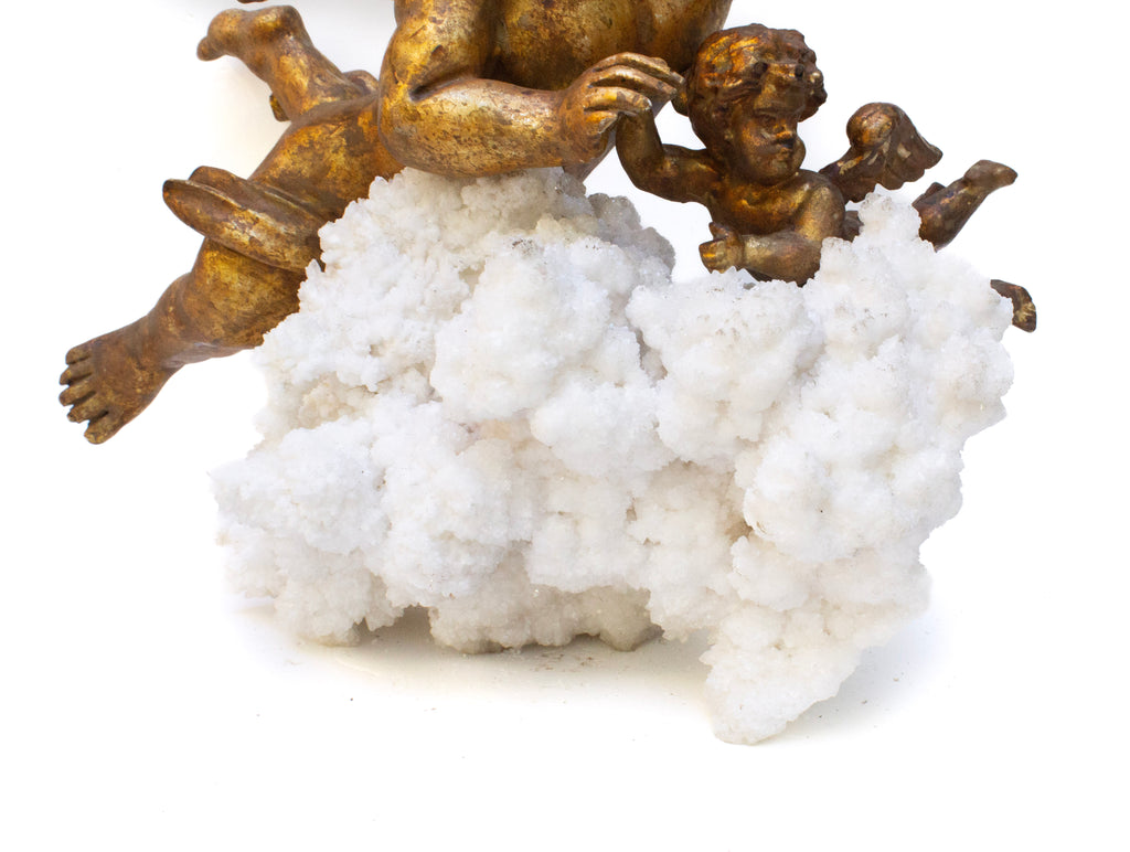 The hand-carved angels were once part of a heavenly, angelic depiction in a historic church in Tuscany. The aragonite is from Morocco and has many different formations. This one in particular emulates a cloud which compliments the 18th century Italian gilded angels.
