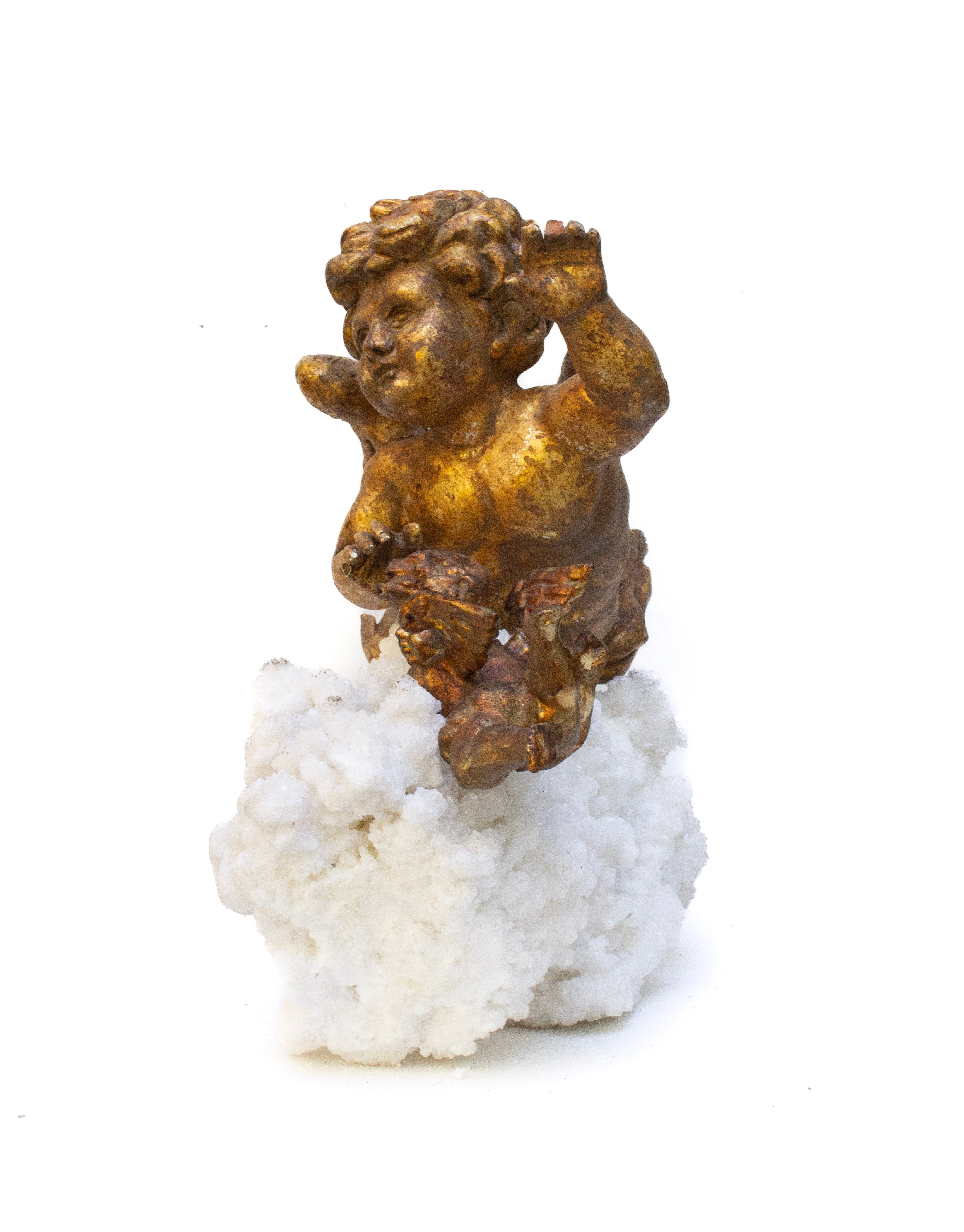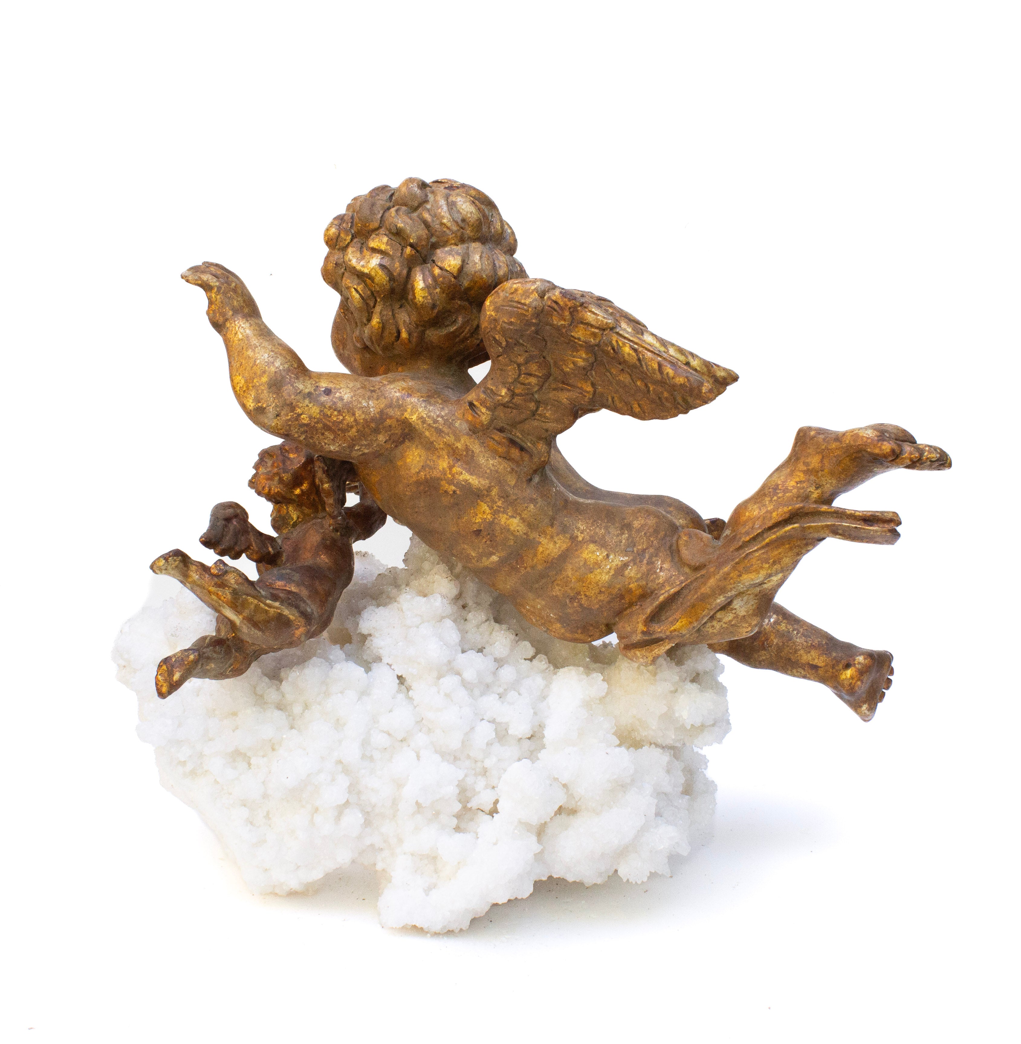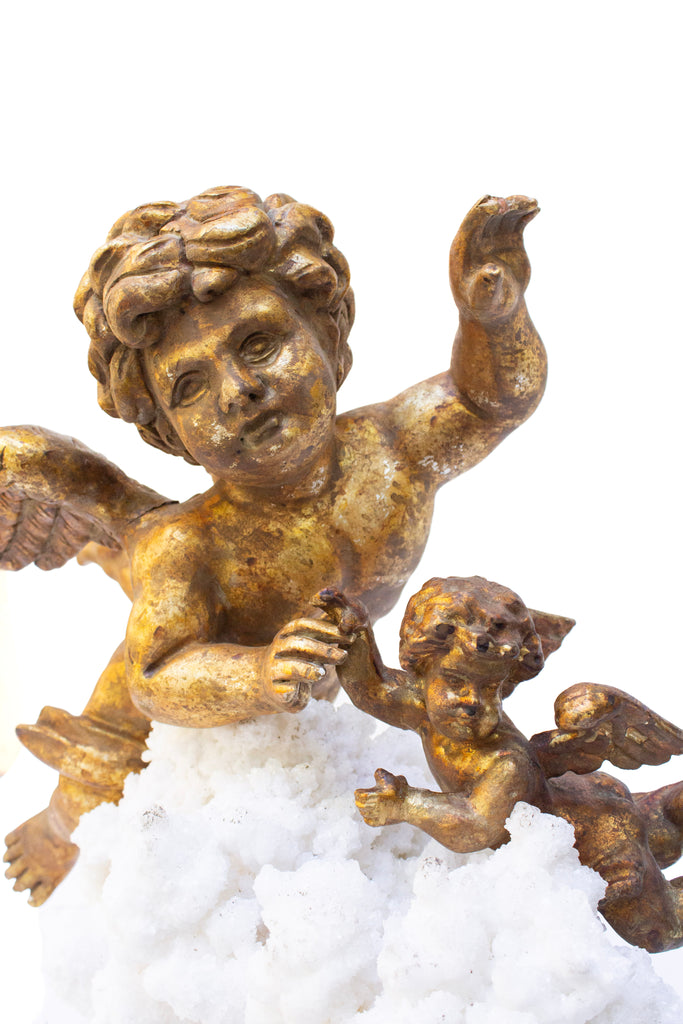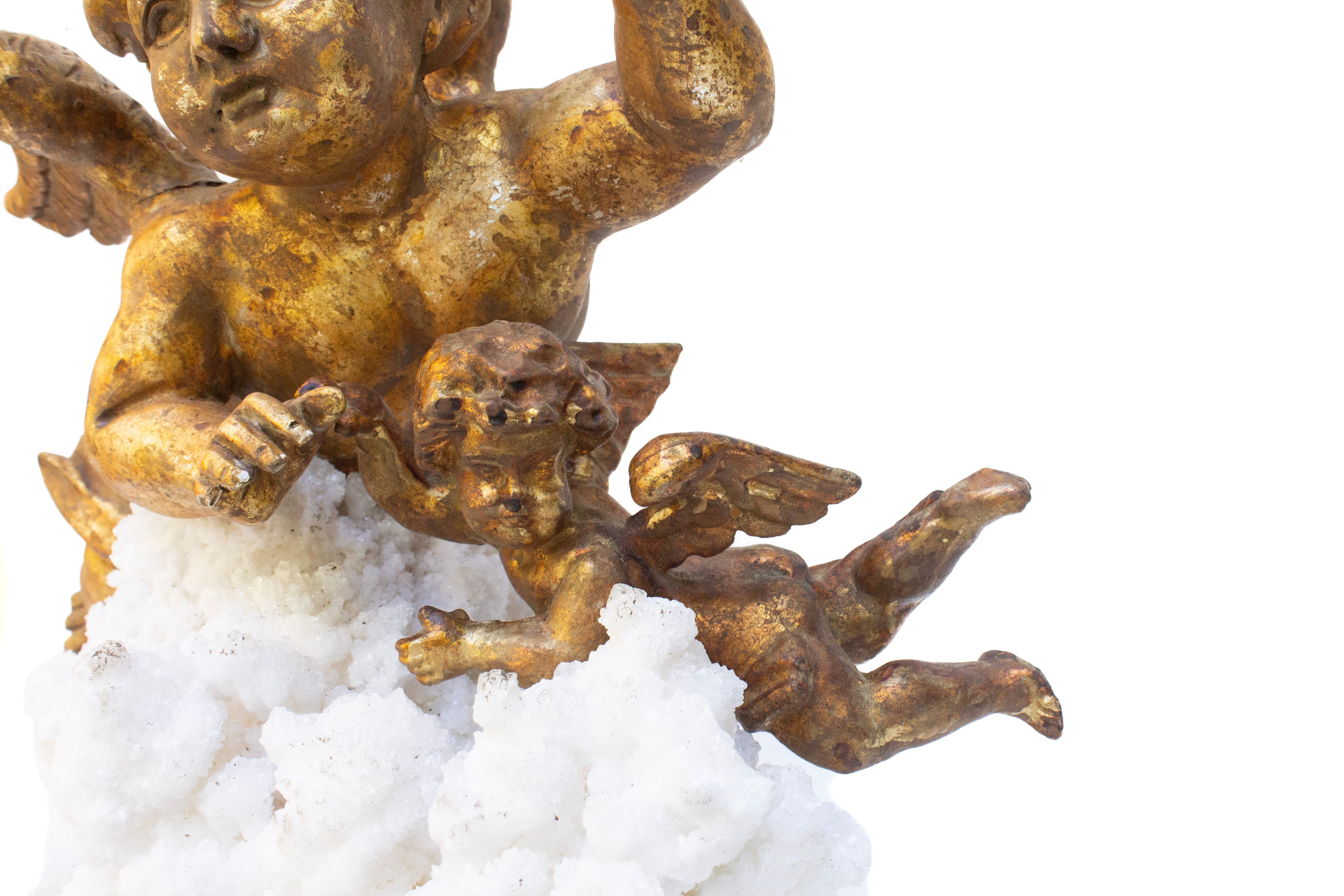 The hand-carved angels were once part of a heavenly, angelic depiction in a historic church in Tuscany. The aragonite is from Morocco and has many different formations. This one in particular emulates a cloud which compliments the 18th century Italian gilded angels.
