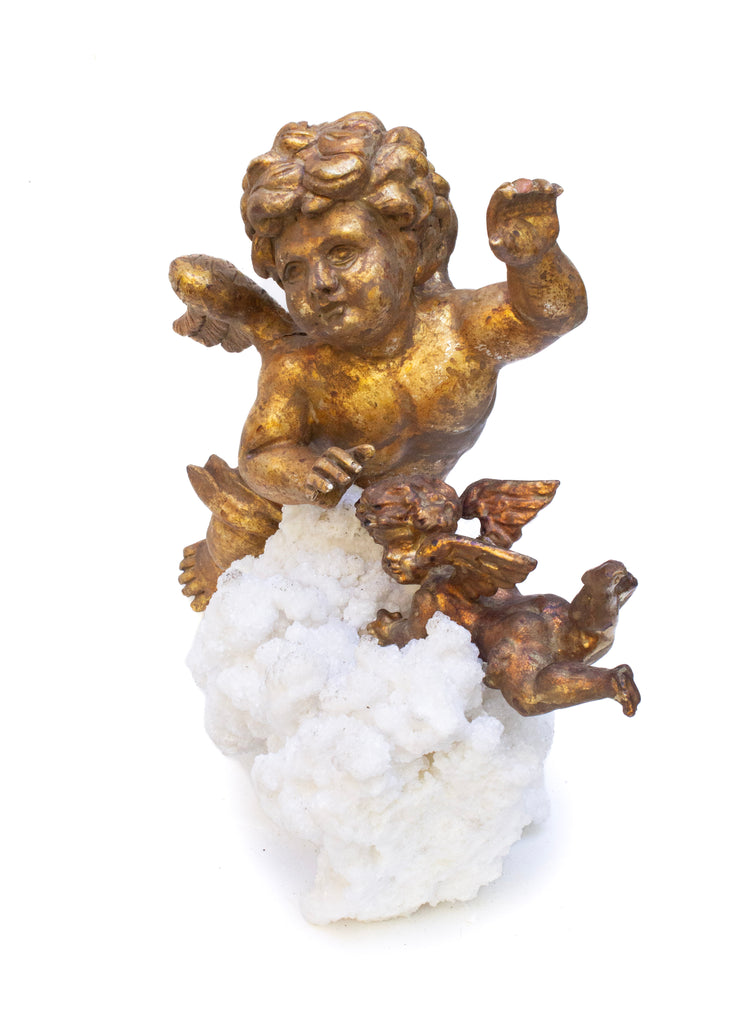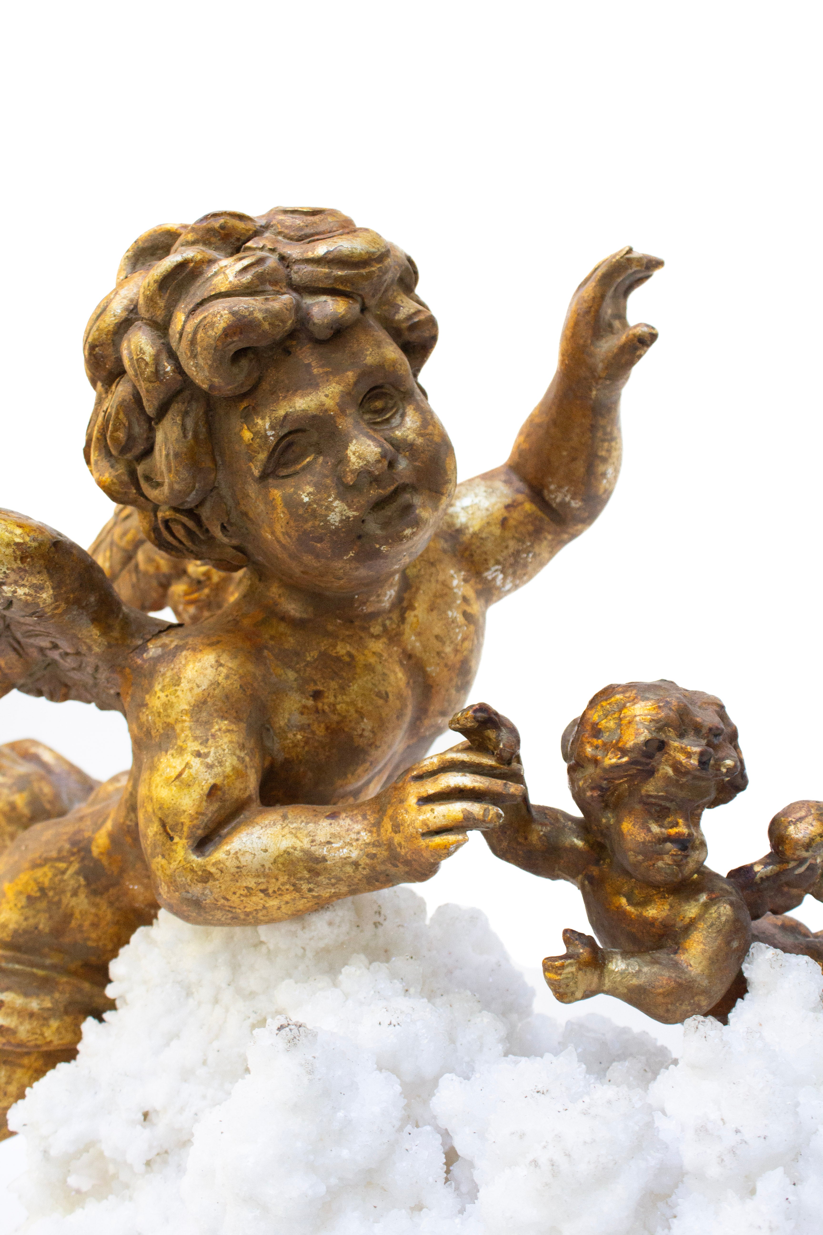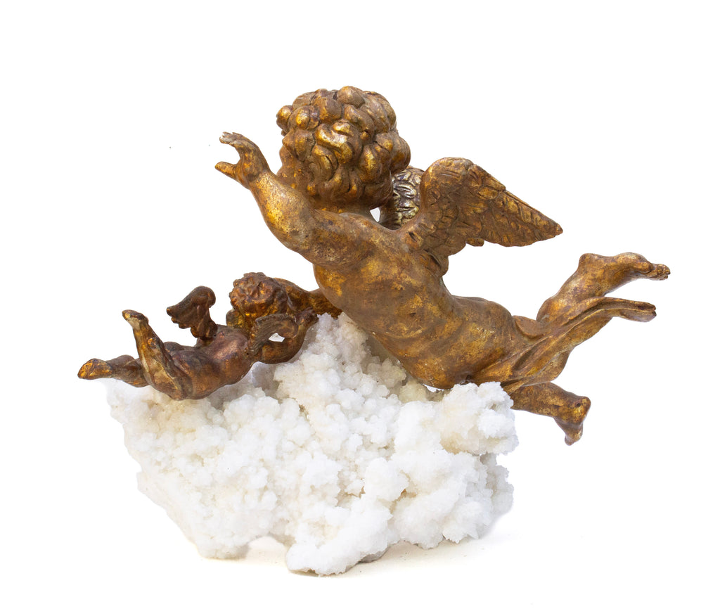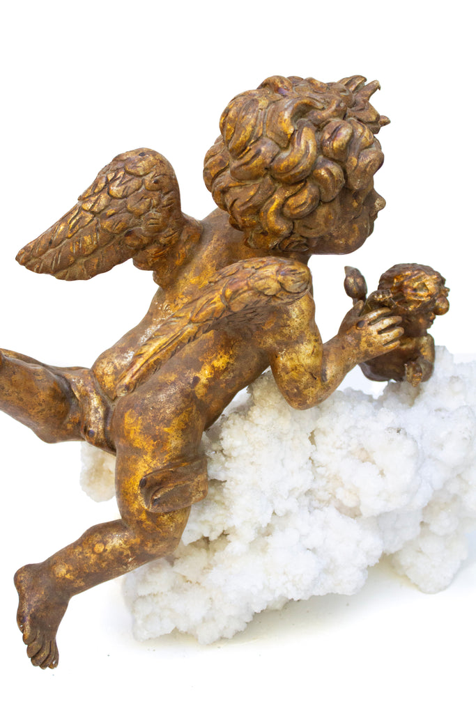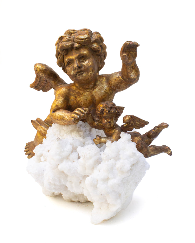 The hand-carved angels were once part of a heavenly, angelic depiction in a historic church in Tuscany. The aragonite is from Morocco and has many different formations. This one in particular emulates a cloud which compliments the 18th century Italian gilded angels.