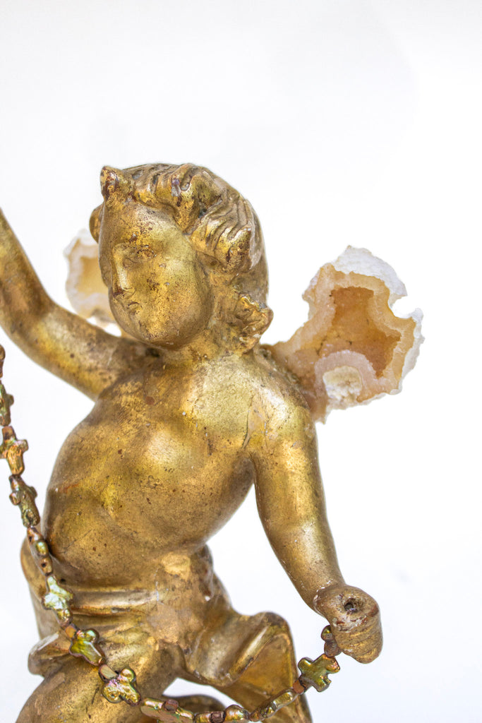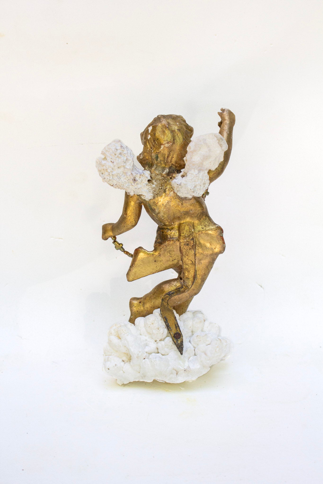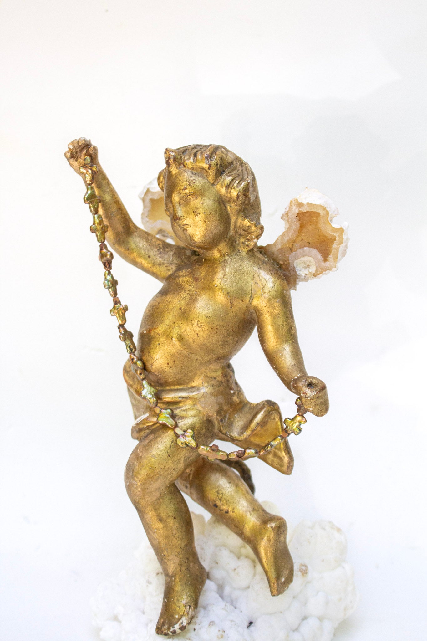 18th century Italian hand-carved gold leaf angel with fossil agate coral wings and mounted on natural aragonite. The antique angel was once part of a heavenly, angelic depiction in a historic church in Tuscany. Beginning as one piece, the agate coral has been cut and polished to become the wings. The angel holds in its hands a string of coordinating cross-shaped baroque pearls and floats on a naturally formed aragonite mineral perfectly emulating a cloud.