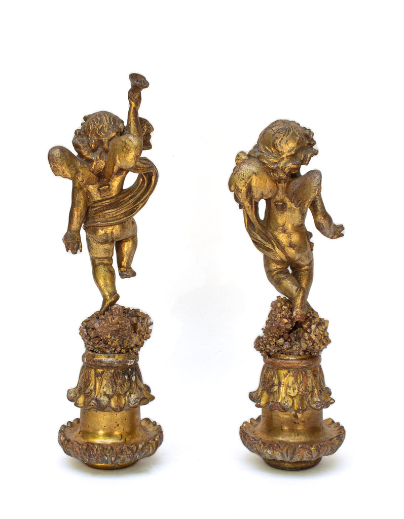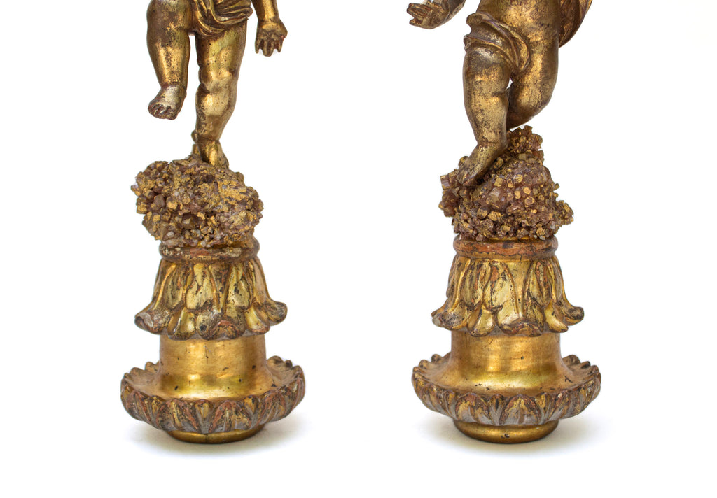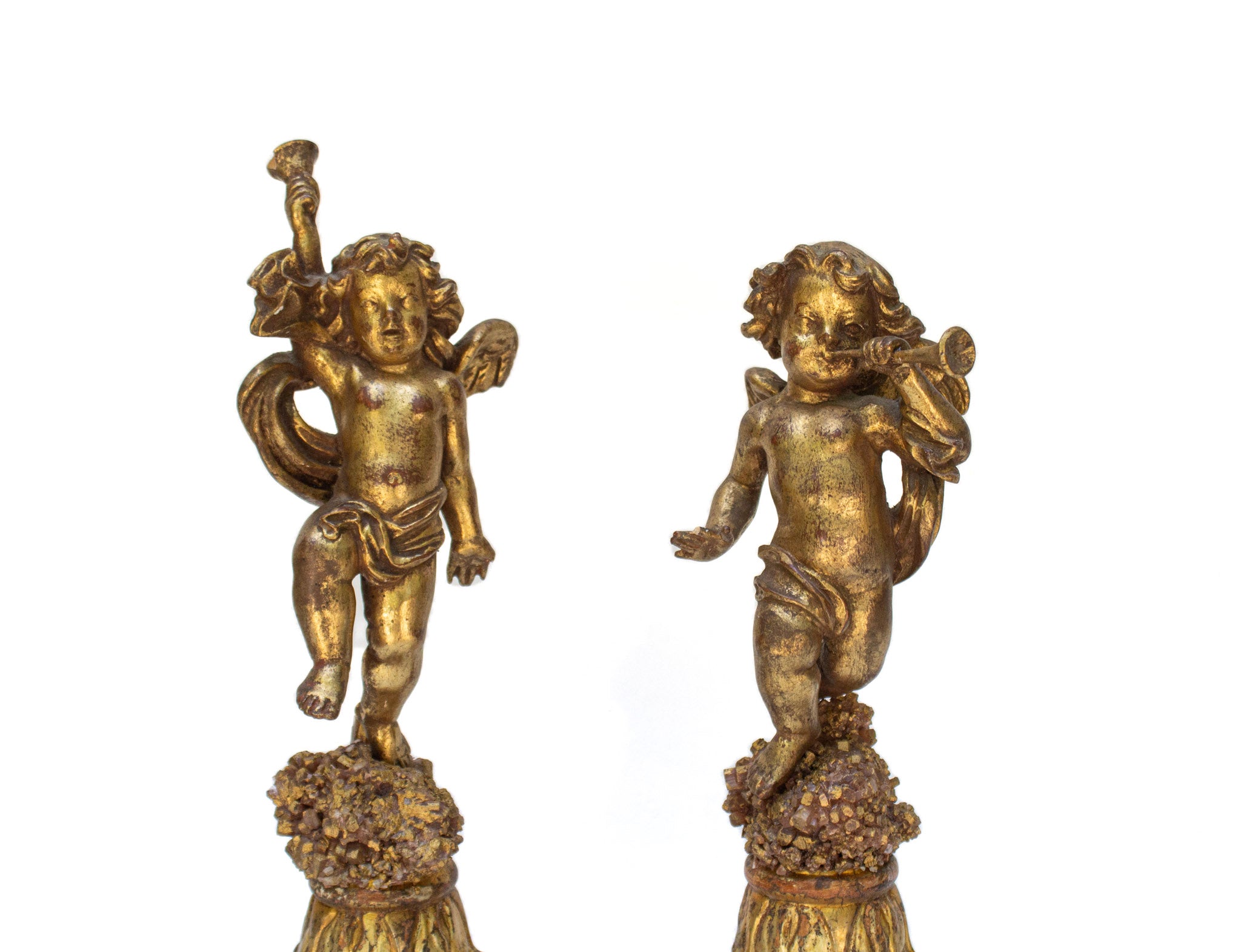 Pair of late 18th century Italian hand-carved, gilded angels with instruments on aragonite clusters with coordinating Italian hand-carved wood fragment bases.