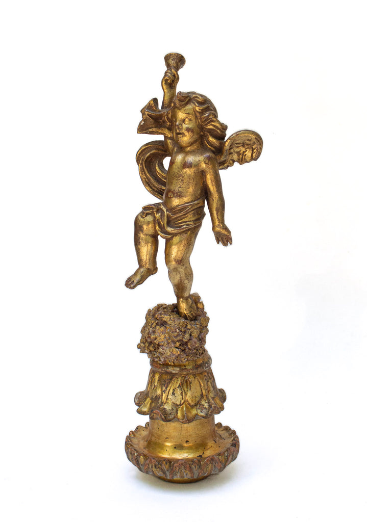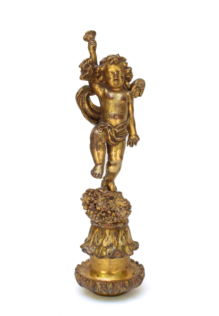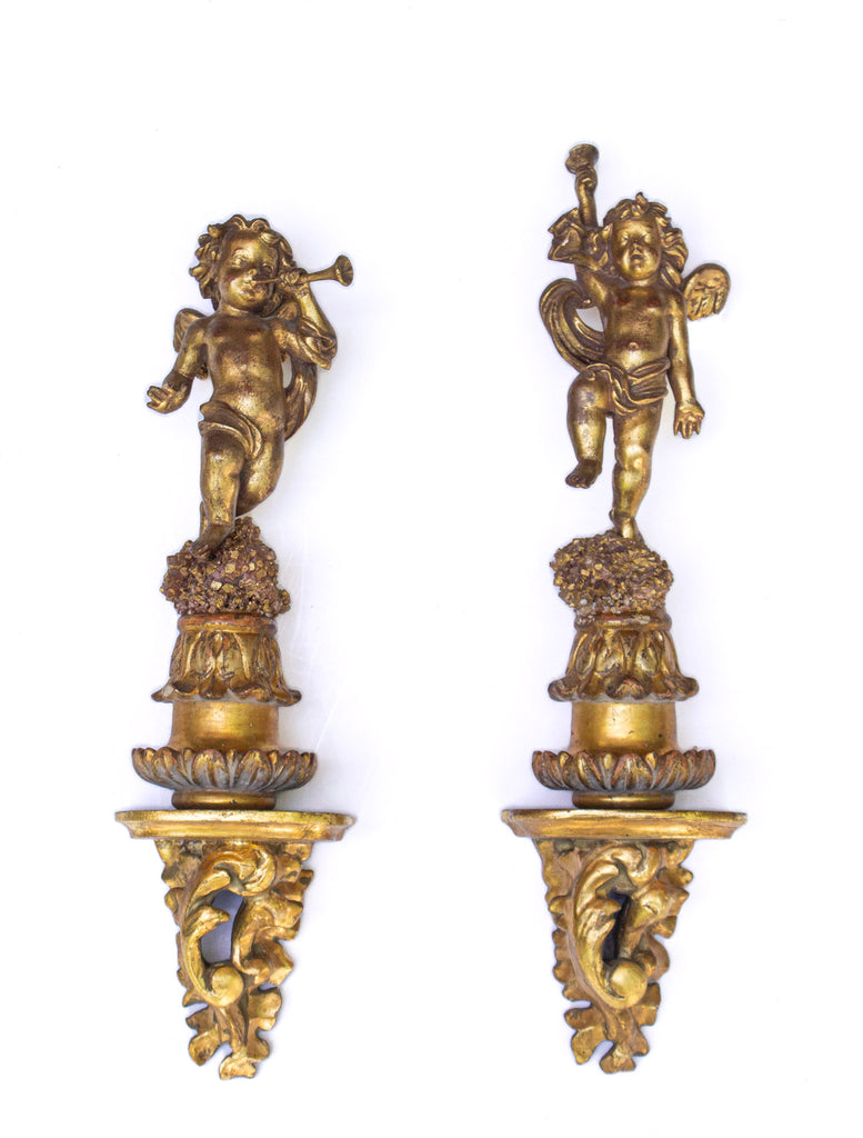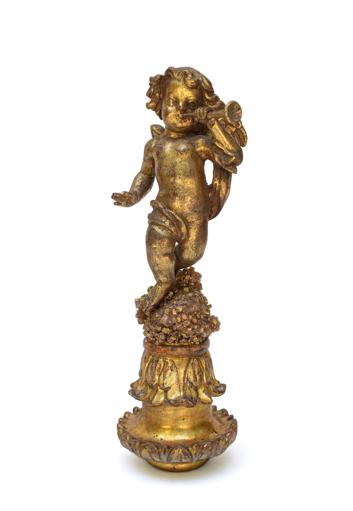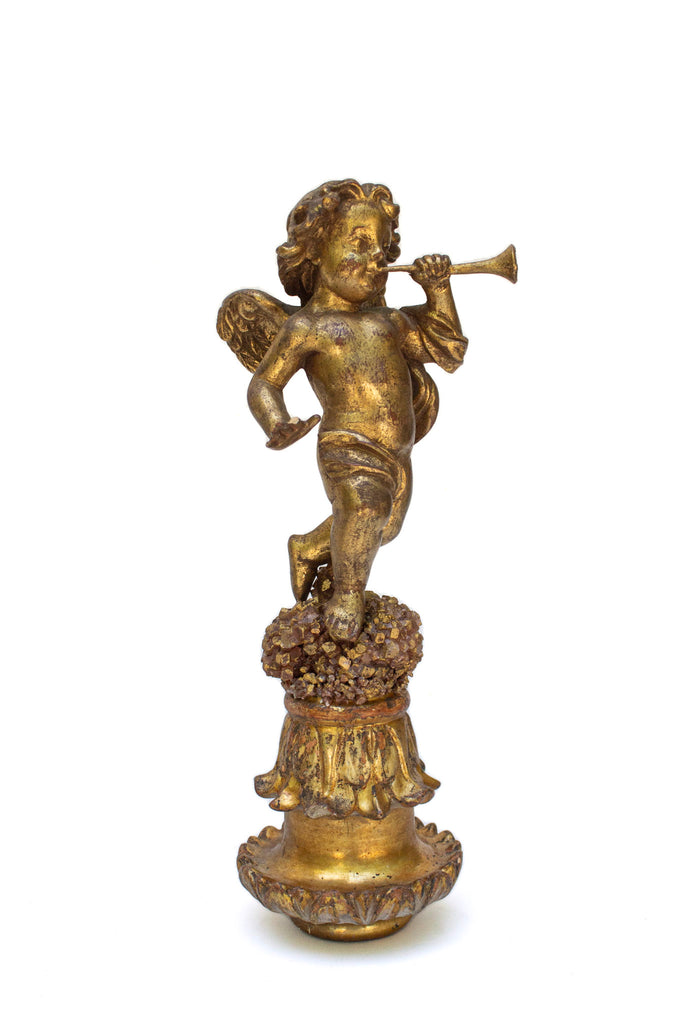 The carved angels and bases are originally from a church in Tuscany and have been naturally distressed with age. The aragonite crystal clusters have applied highlights of gold and coordinate with the distressed layered pigments of the artifacts.