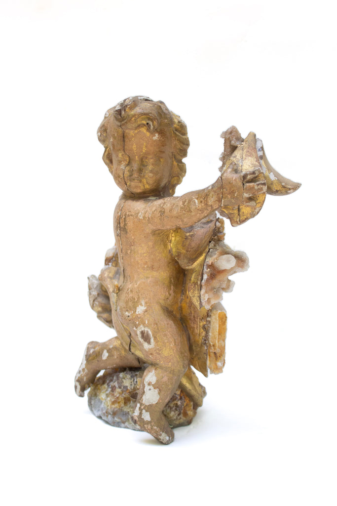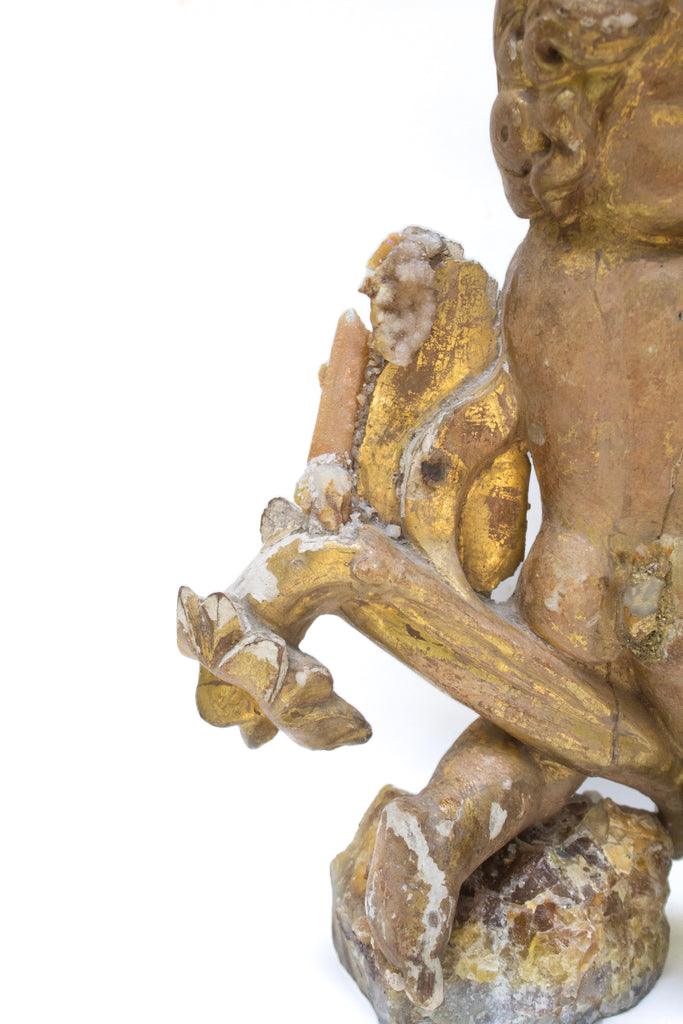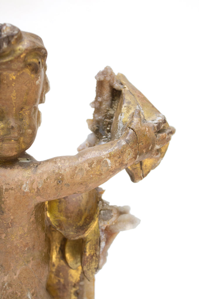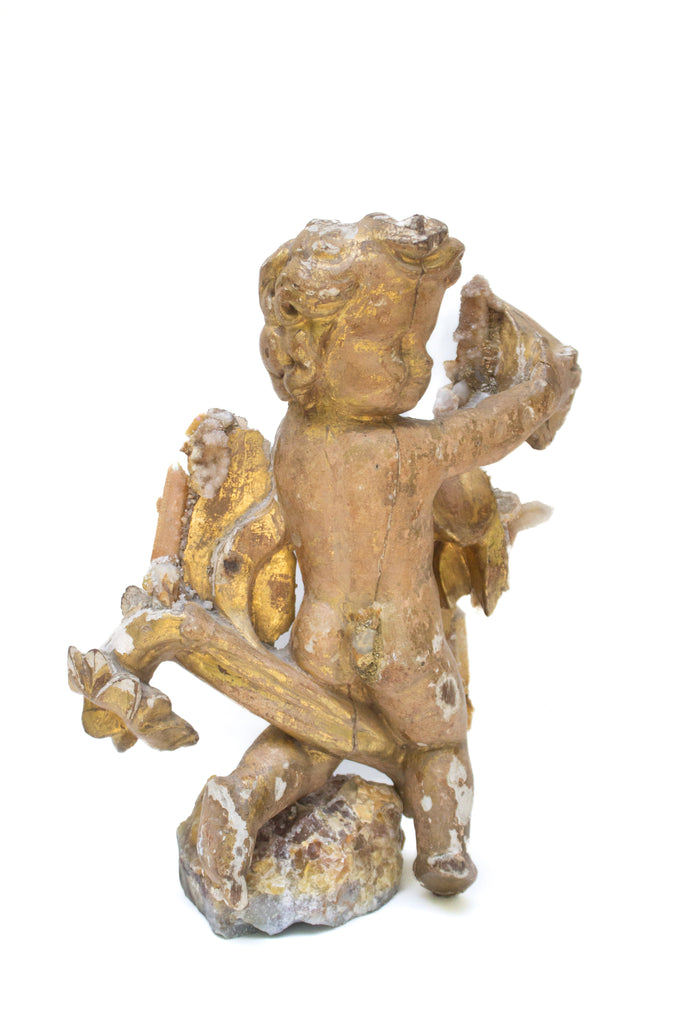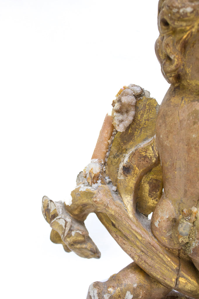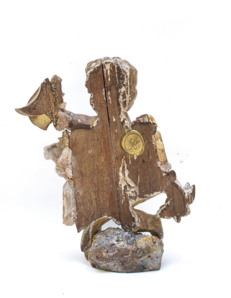 17th century Italian hand-carved angel with applied cactus quartz crystals resting on  coordinating calcite crystals in matrix.