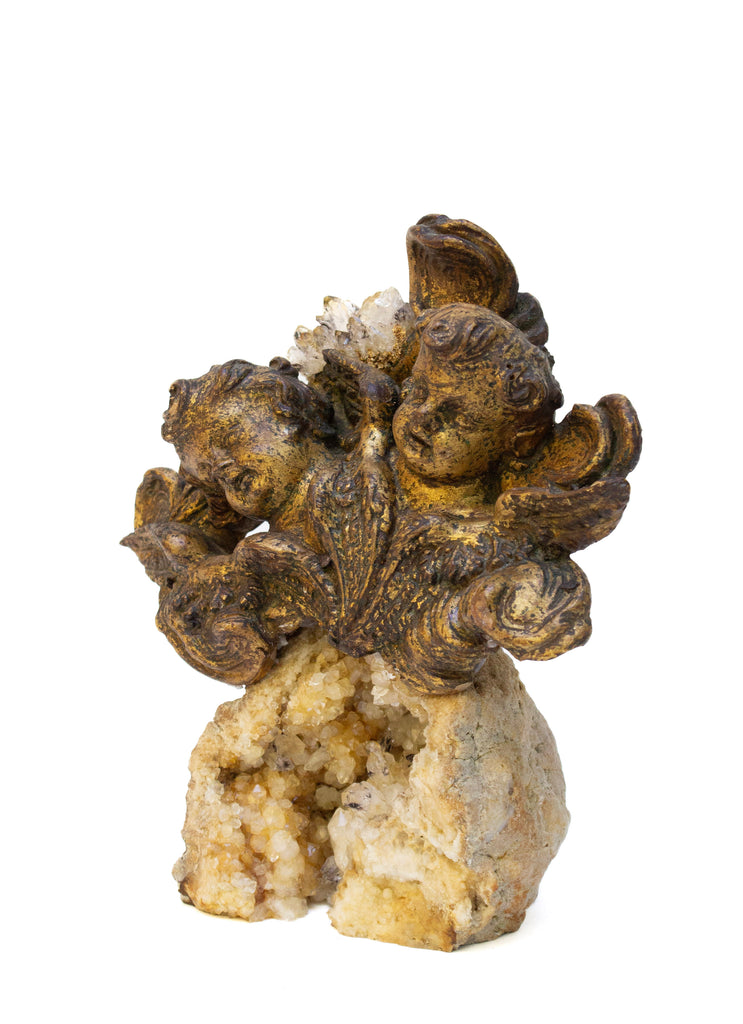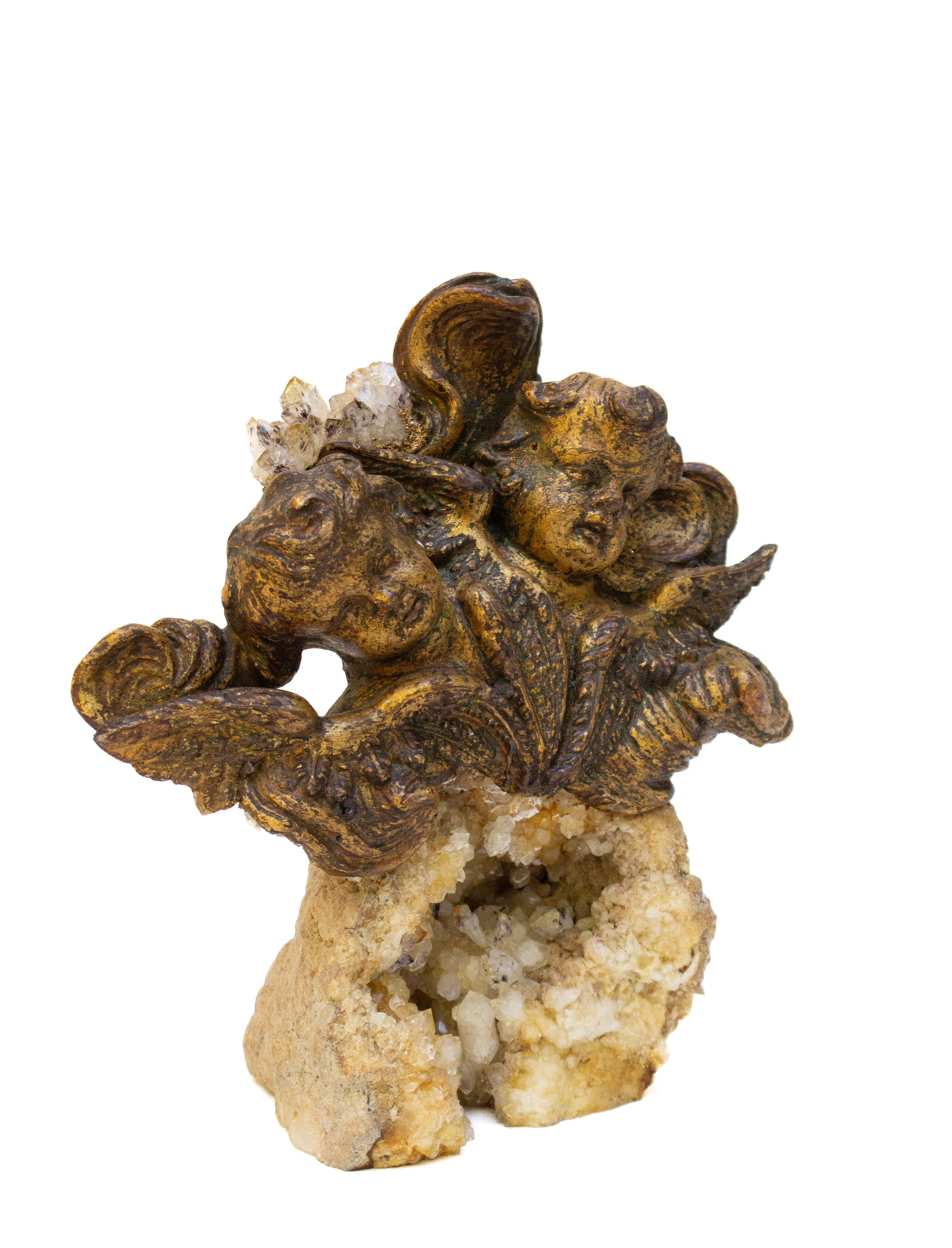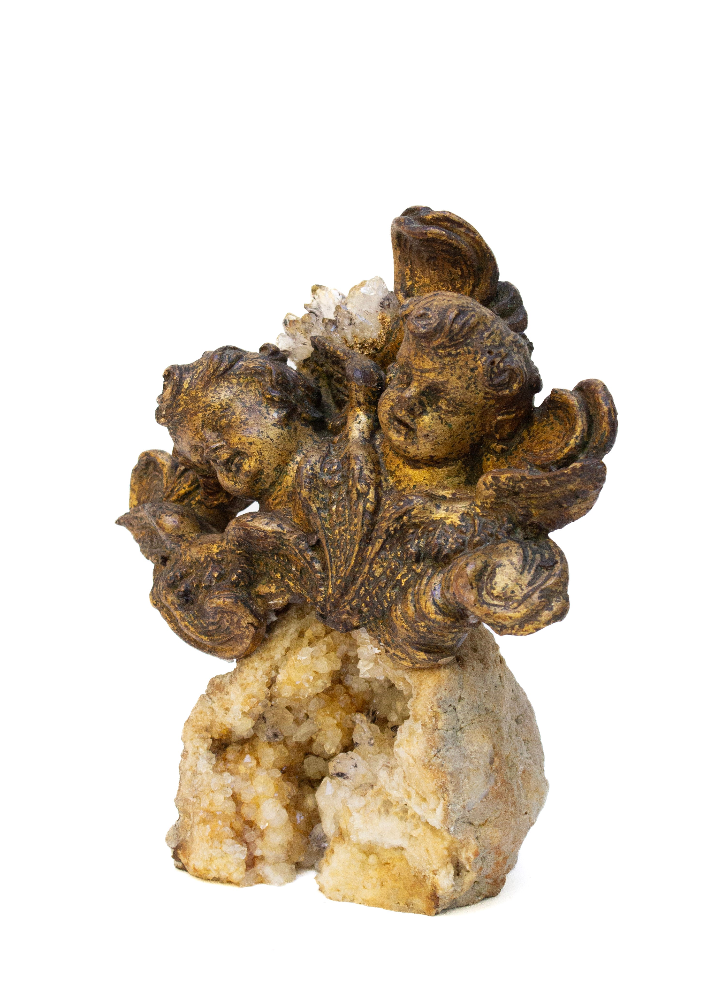 18th century Italian hand-carved angel heads on a coordinating crystal geode.
