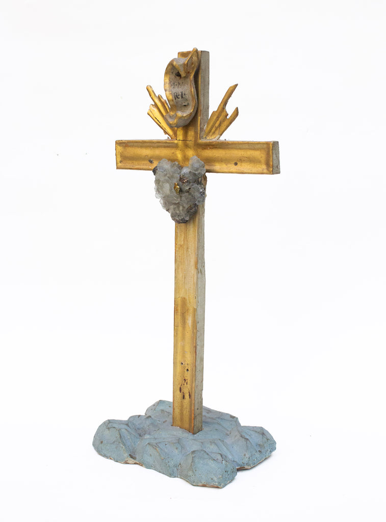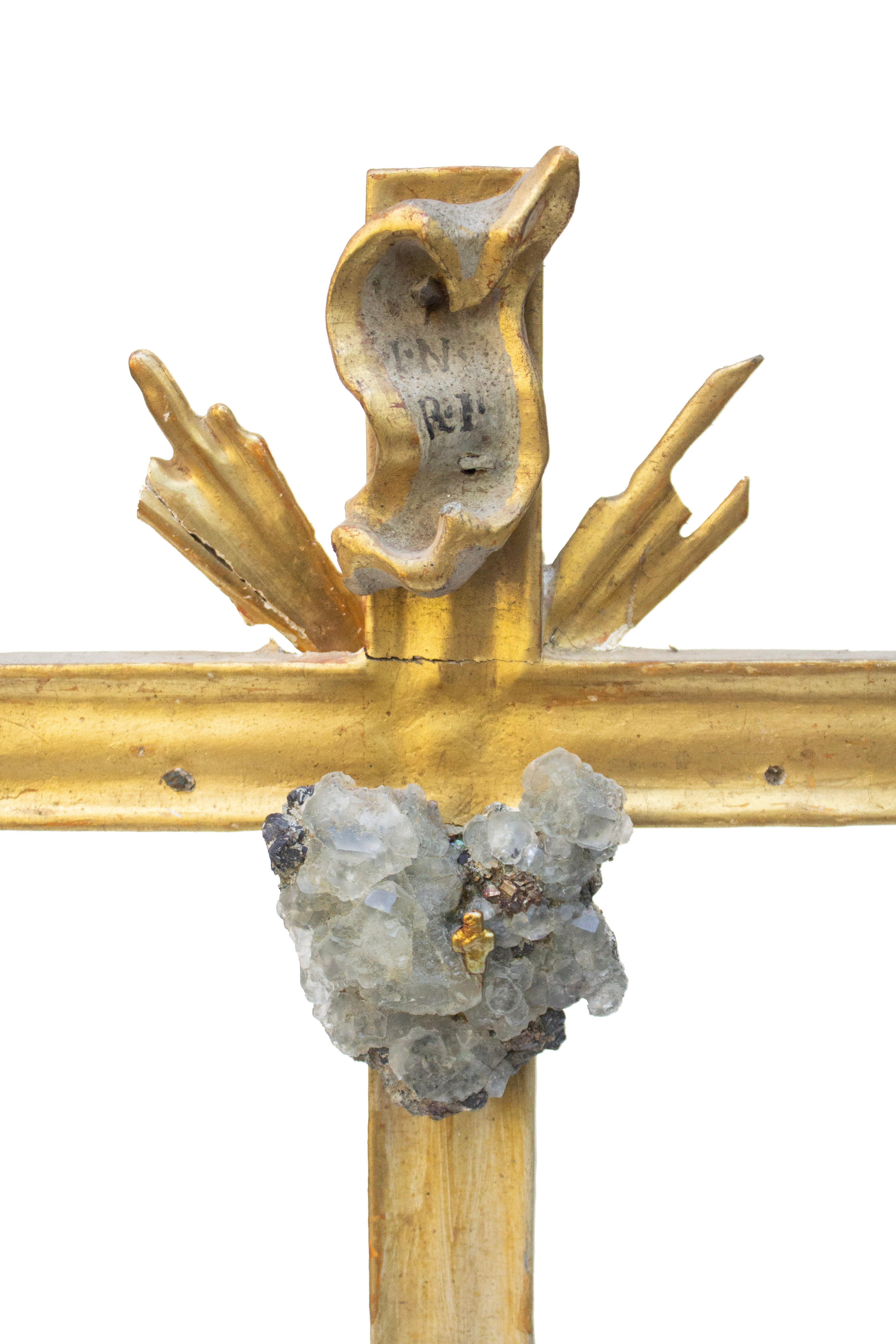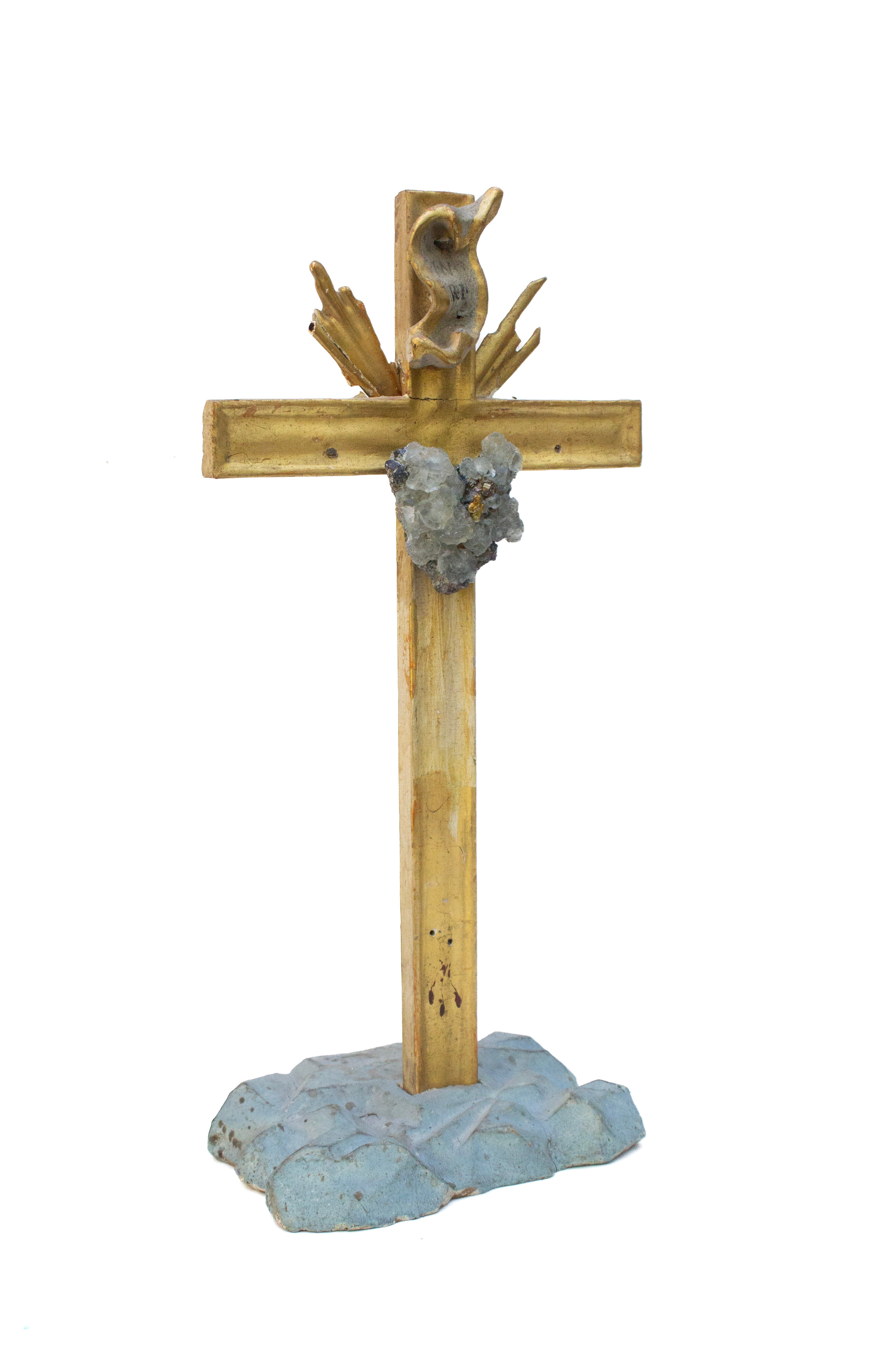 The cross originally came from a historical church in Venice. The hand-carved aquamarine-painted base is the original base of the cross. It is adorned with the fluorite heart and baroque pearl to symbolize the love of God. Together, the natural specimens transforms the cross into a figurative work of art.