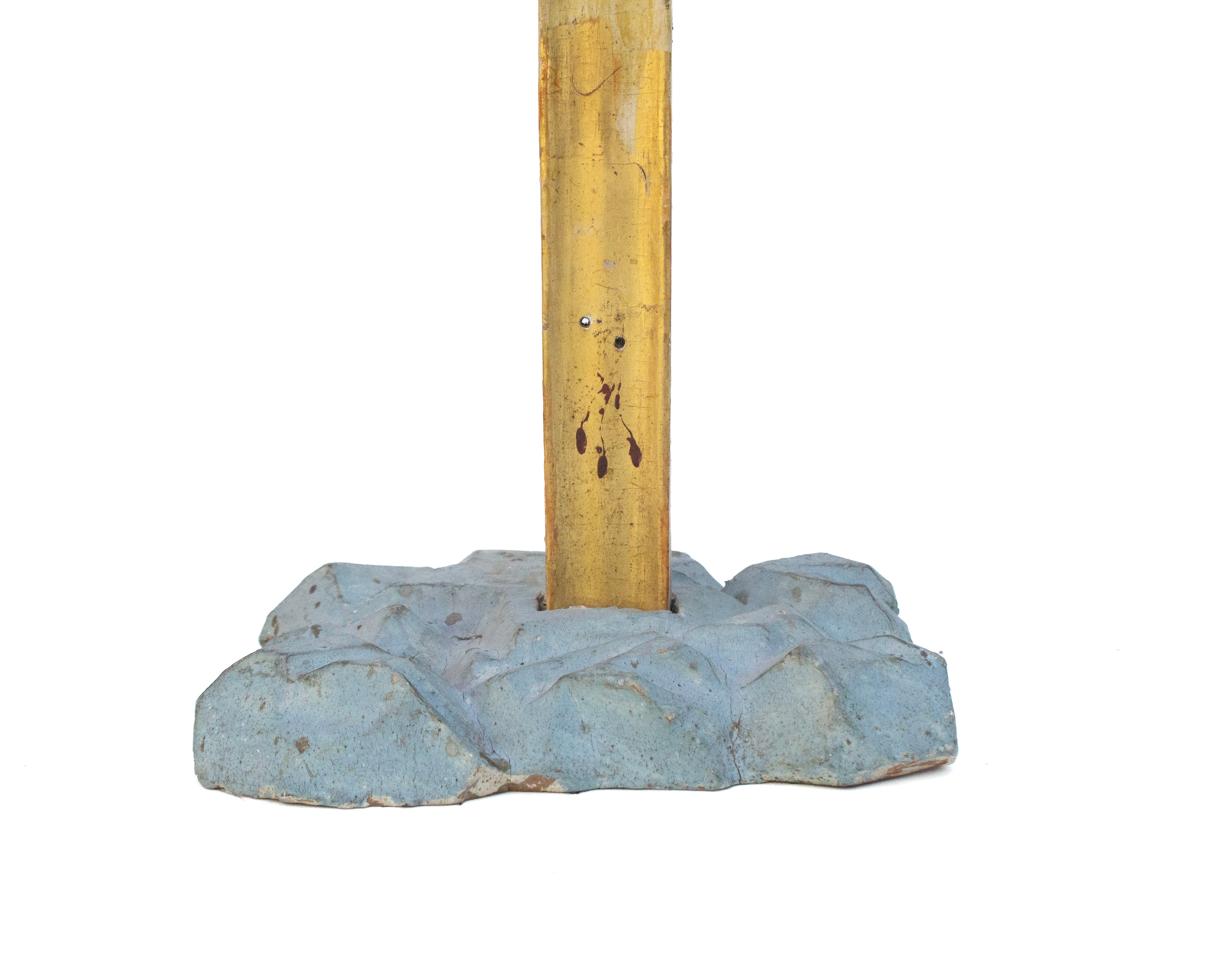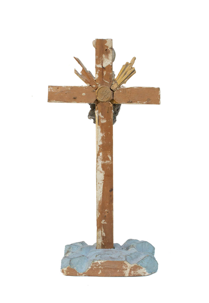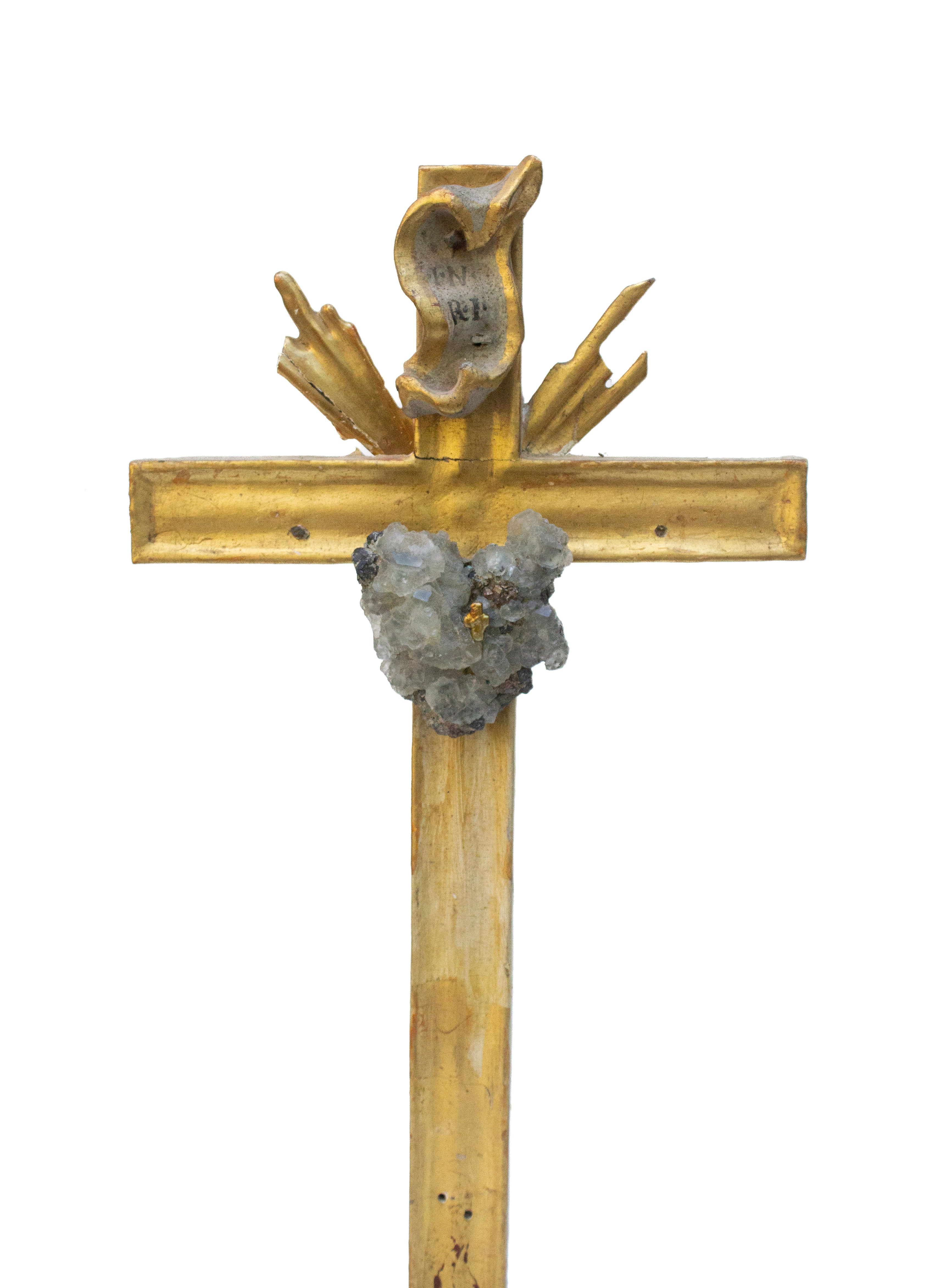 The cross originally came from a historical church in Venice. The hand-carved aquamarine-painted base is the original base of the cross. It is adorned with the fluorite heart and baroque pearl to symbolize the love of God. Together, the natural specimens transforms the cross into a figurative work of art.