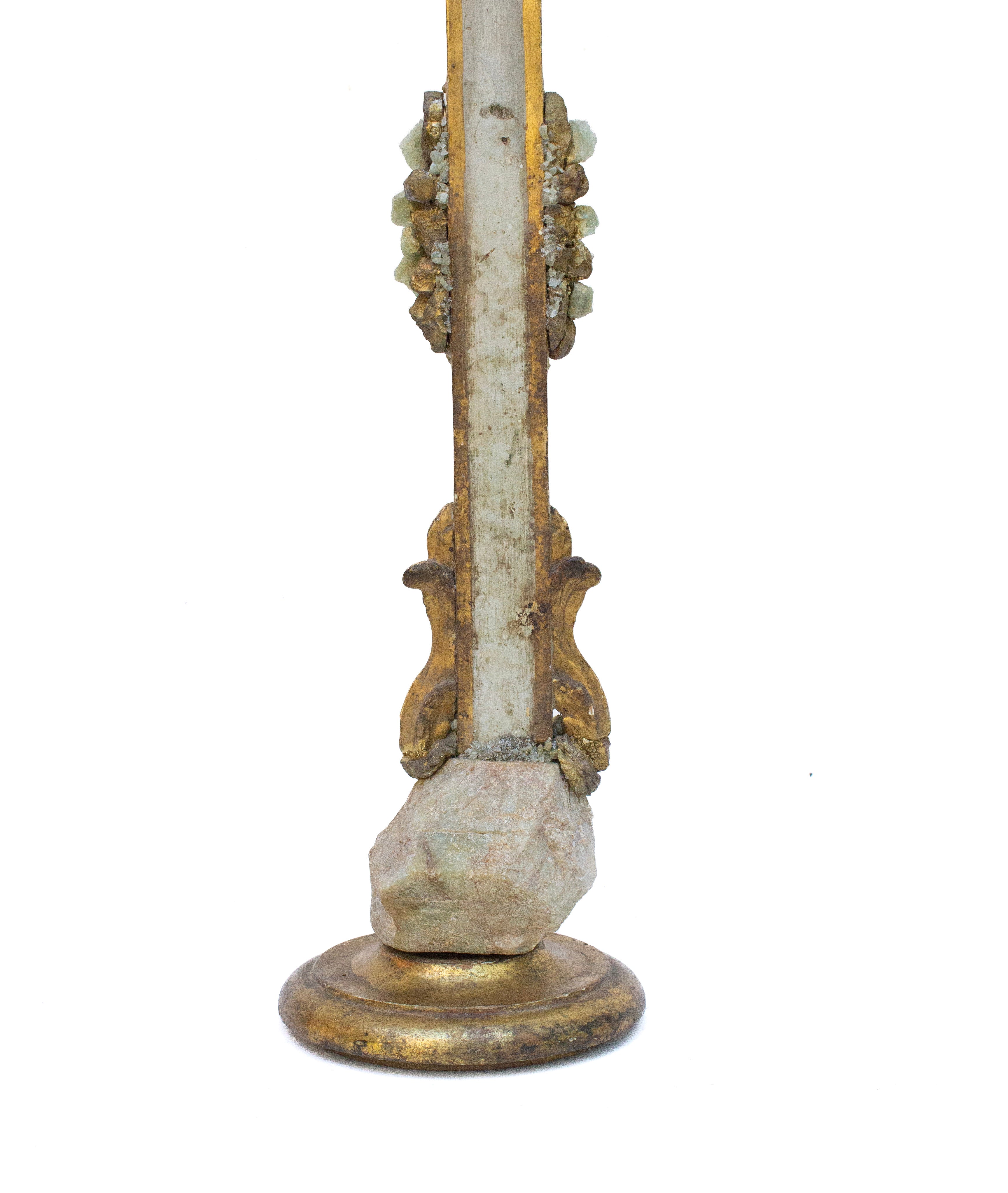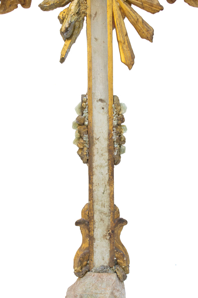 18th century Italian gilded cross with 18th century arms of Christ, aquamarine, and gold-plated crystal points and mounted on a gilded, hand-carved base.