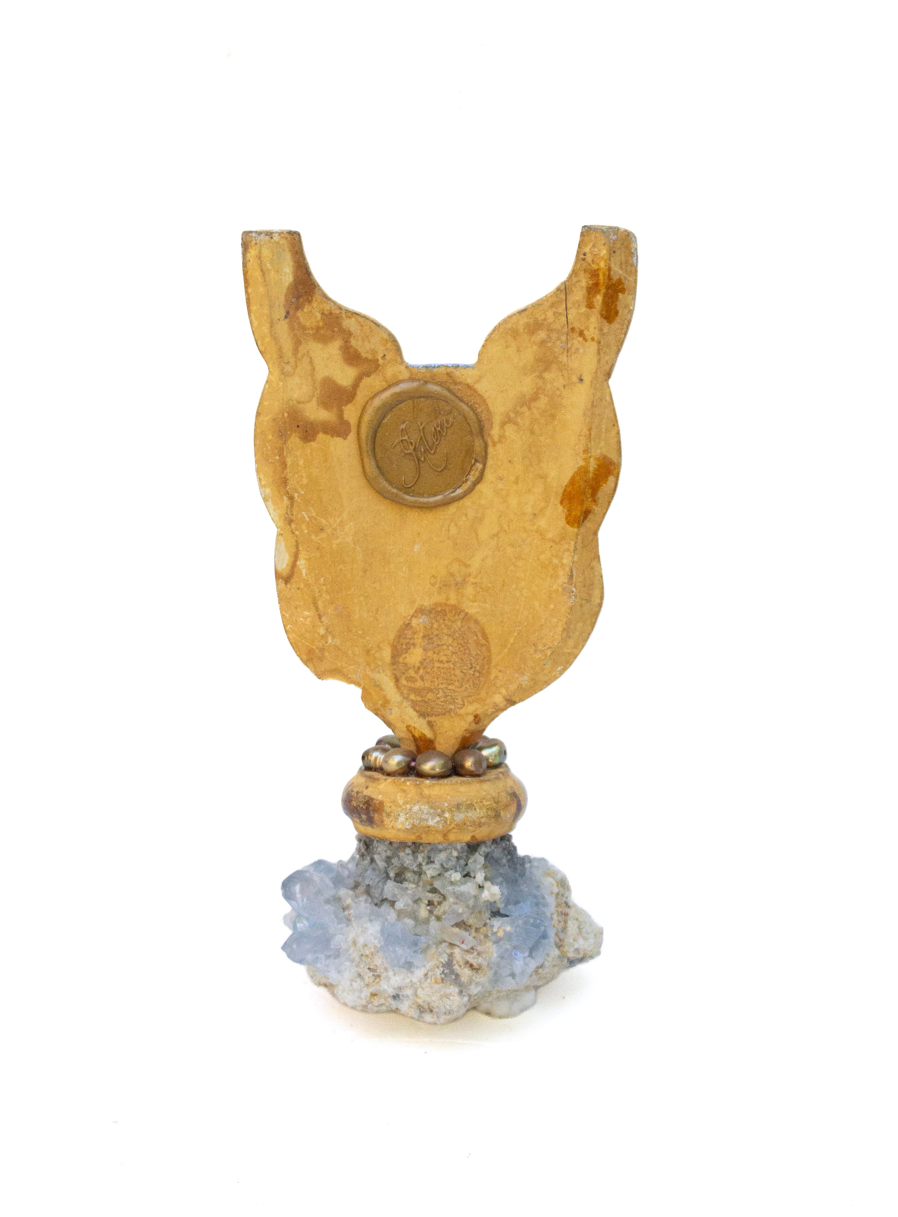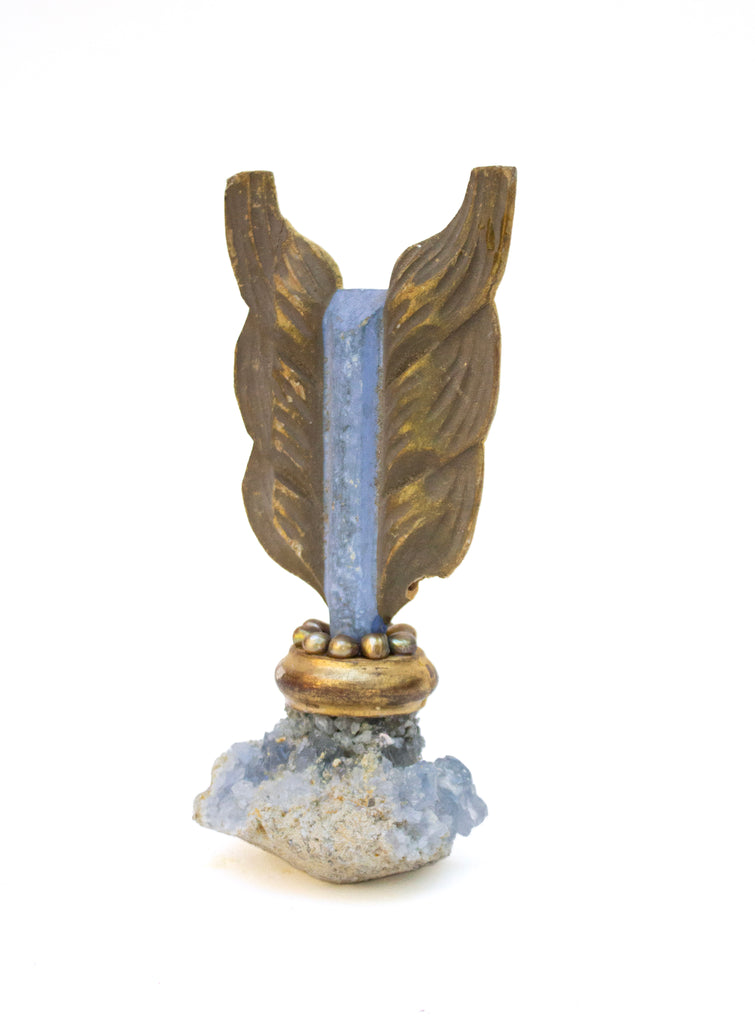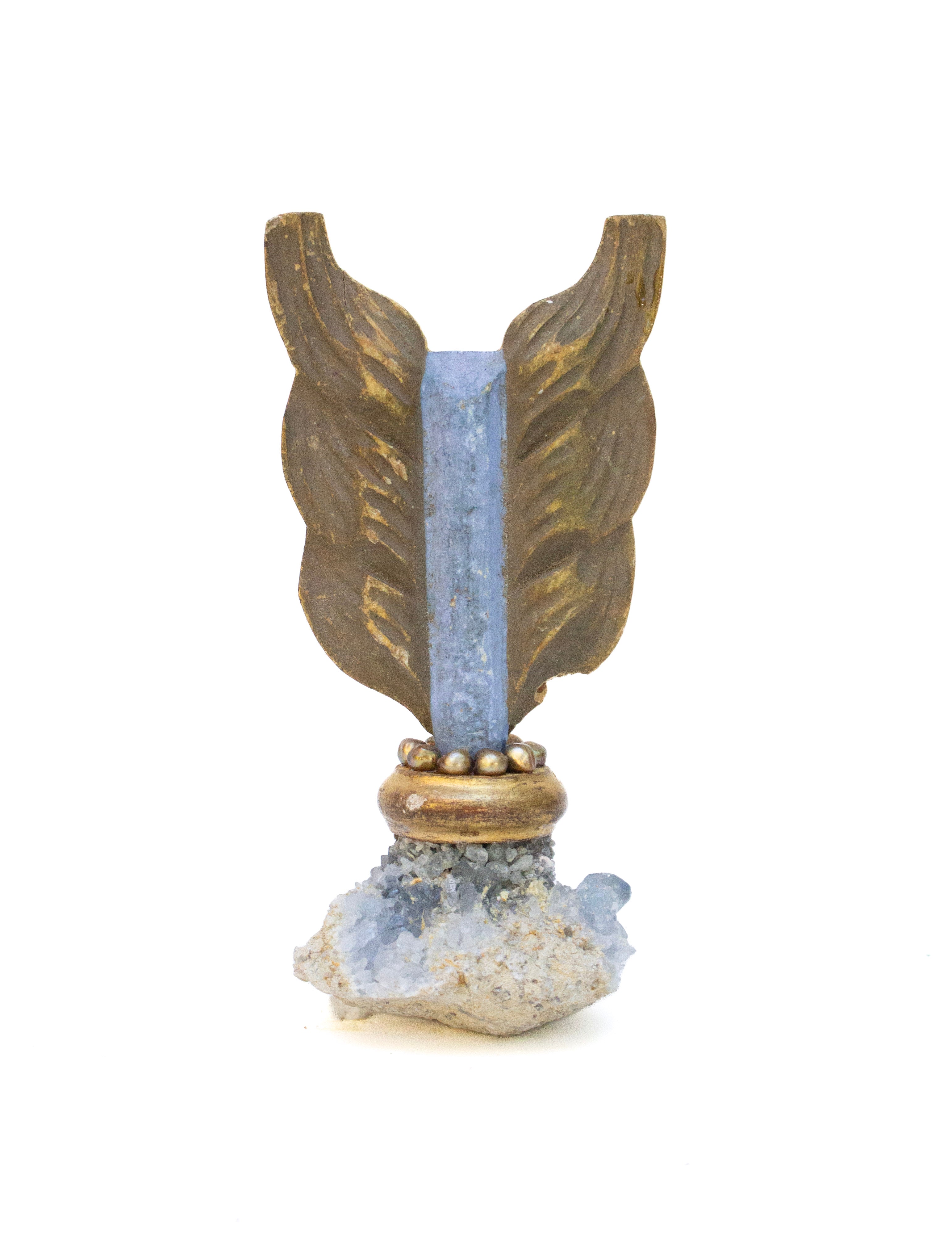 The ecclesiastical artifact was hand-carved, hand-gilded, and hand-painted blue. It has been combined with the coordinating minerals to create a historically significant yet contemporary work of organic and old.