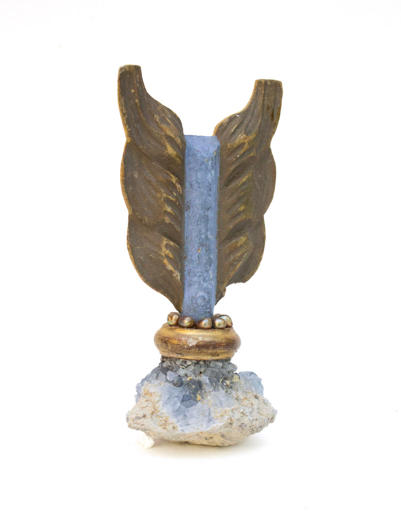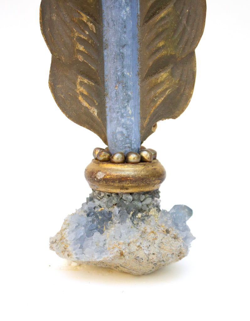 18th-century Italian blue and gilded arrow mounted on a celestite crystal cluster and adorned with baroque pearls.