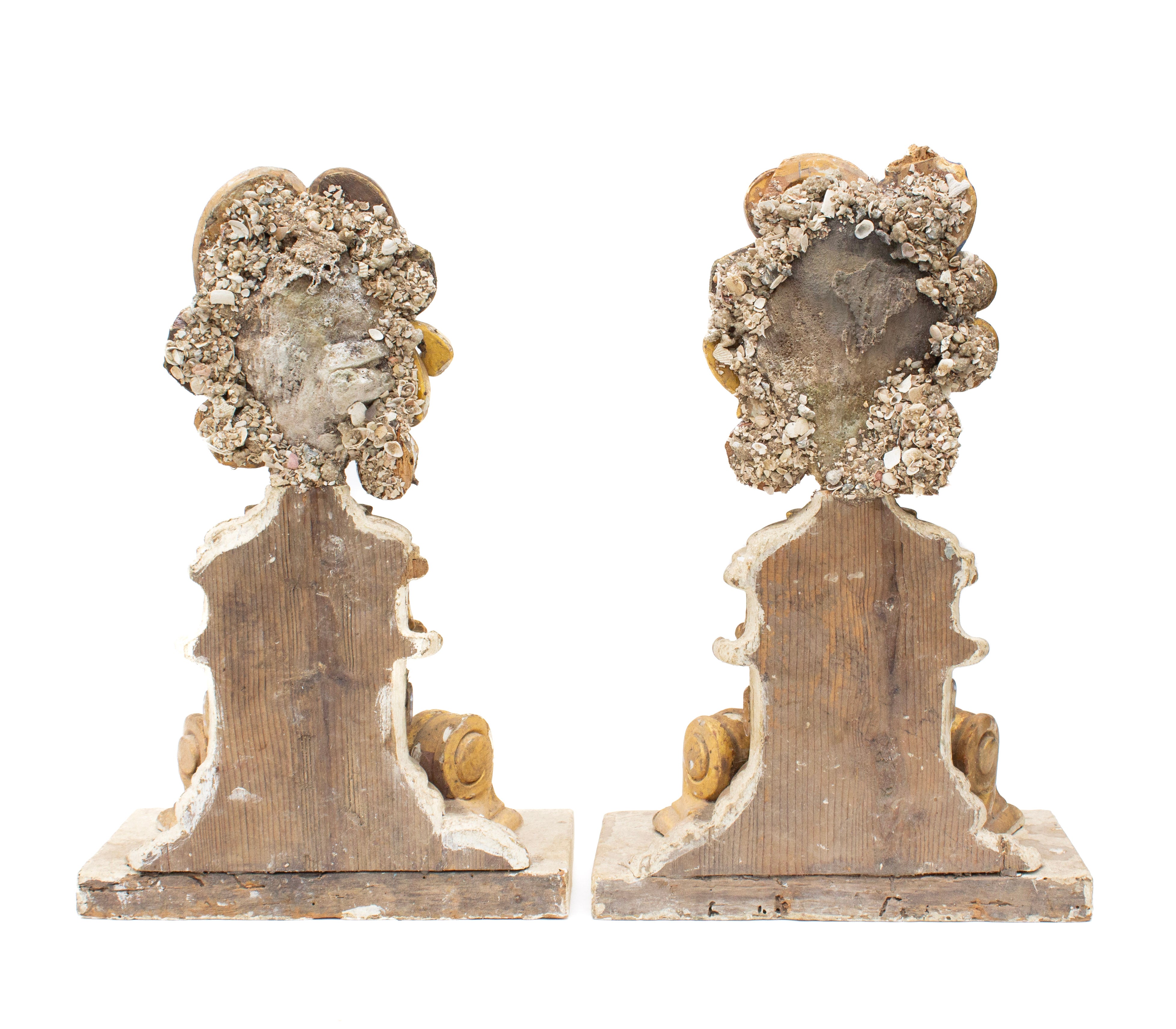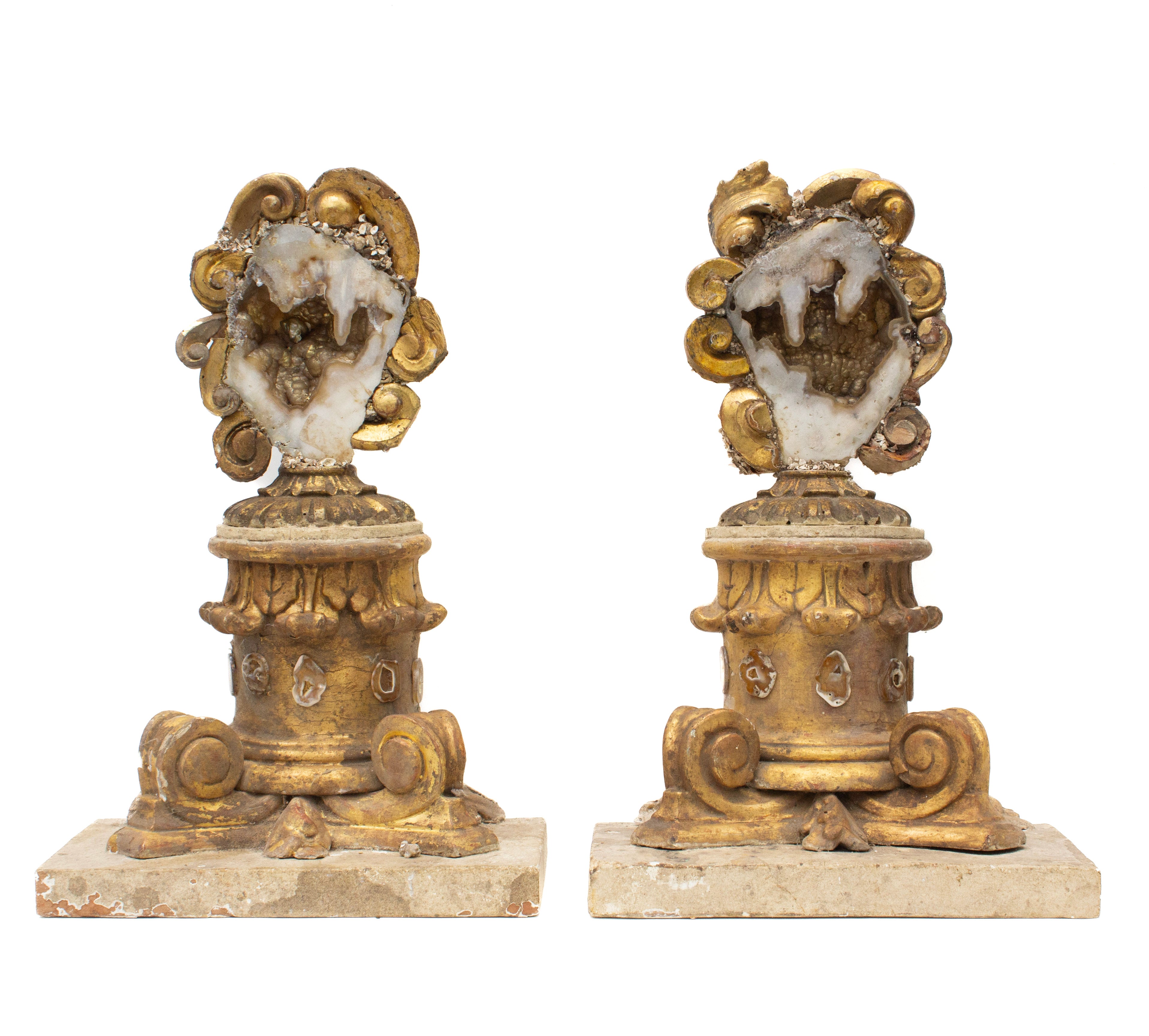 A pair of 18th century Italian gilded and hand-carved bases mounted with fossil agate coral and gilded scroll fragments and adorned with polished agate.