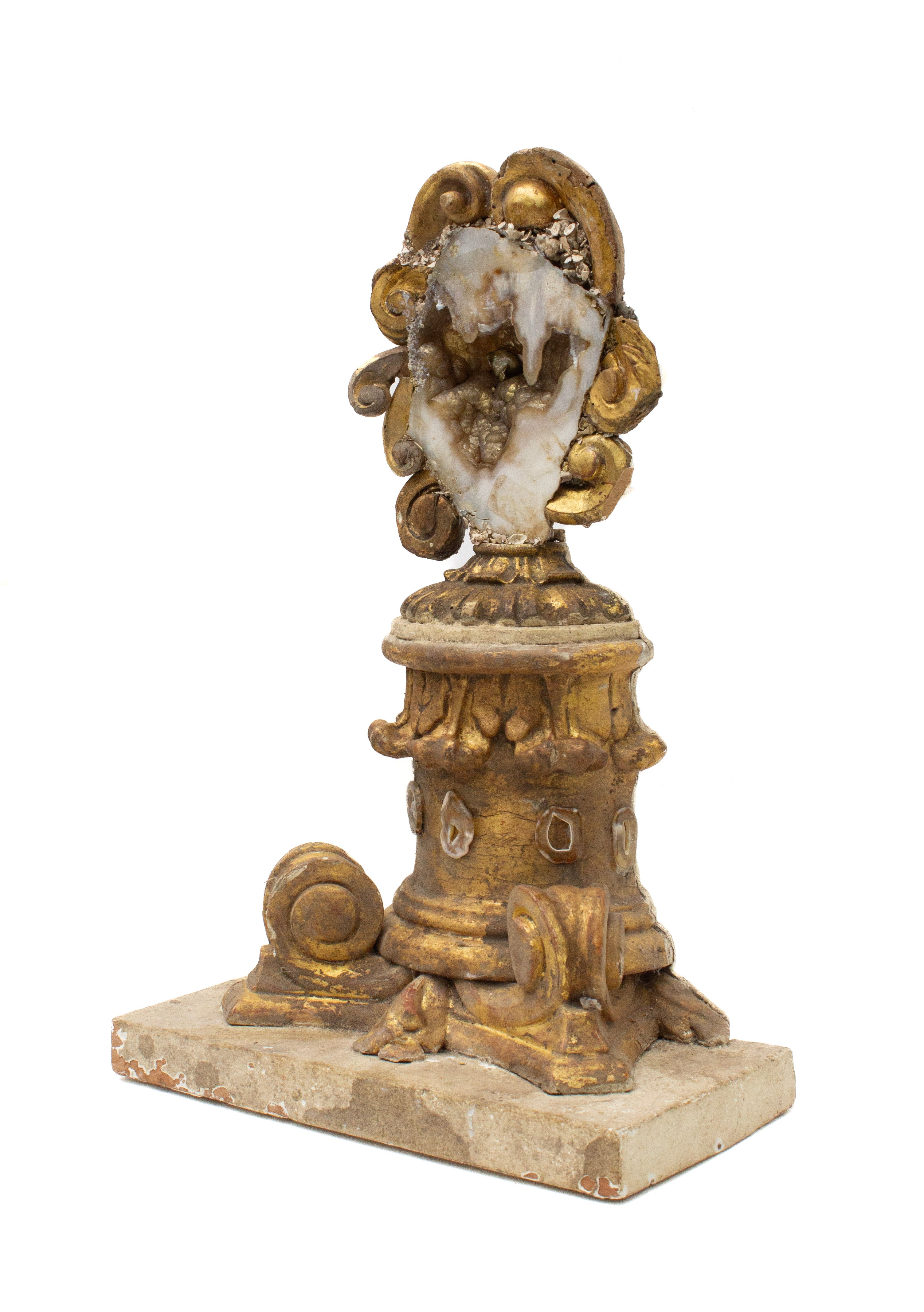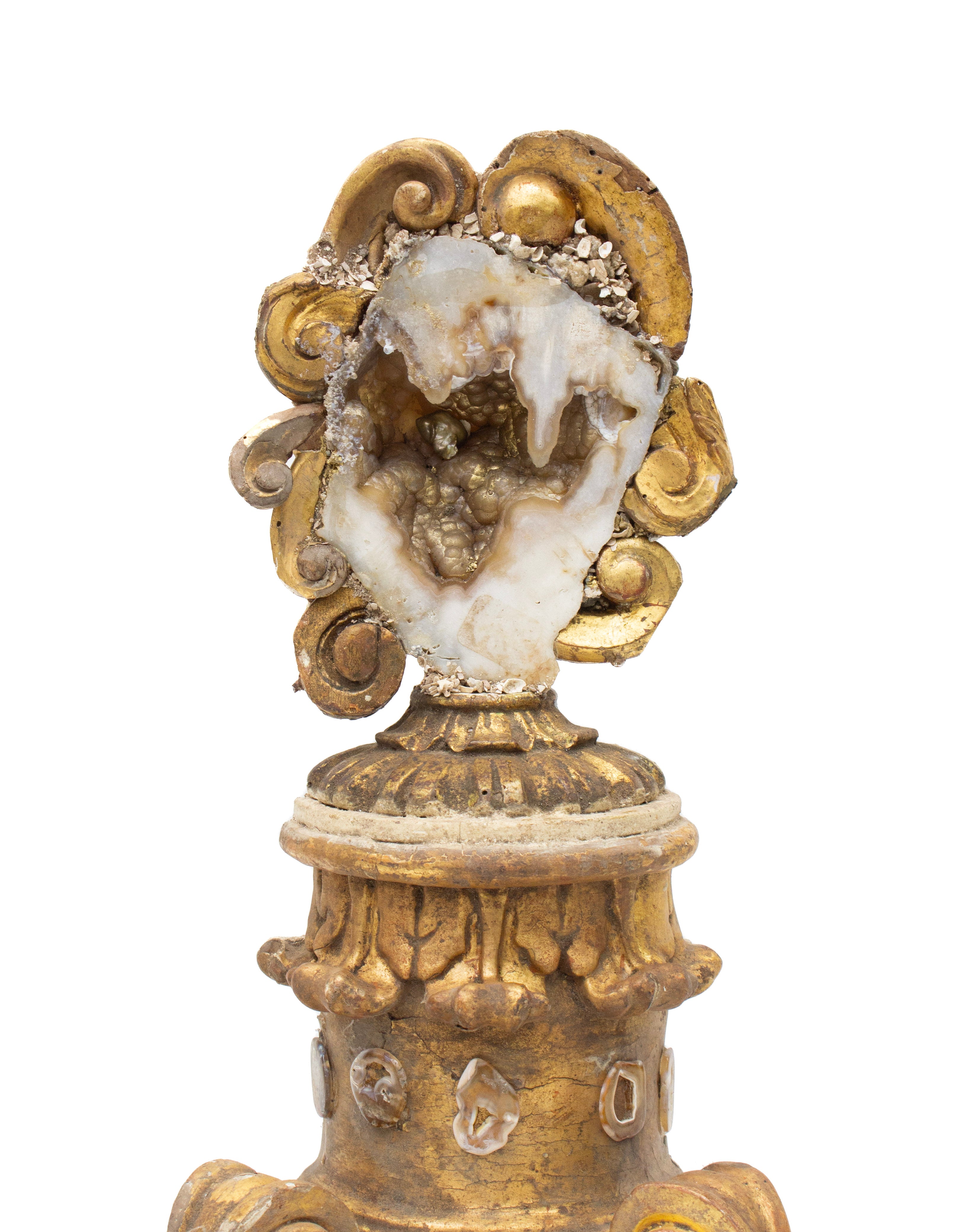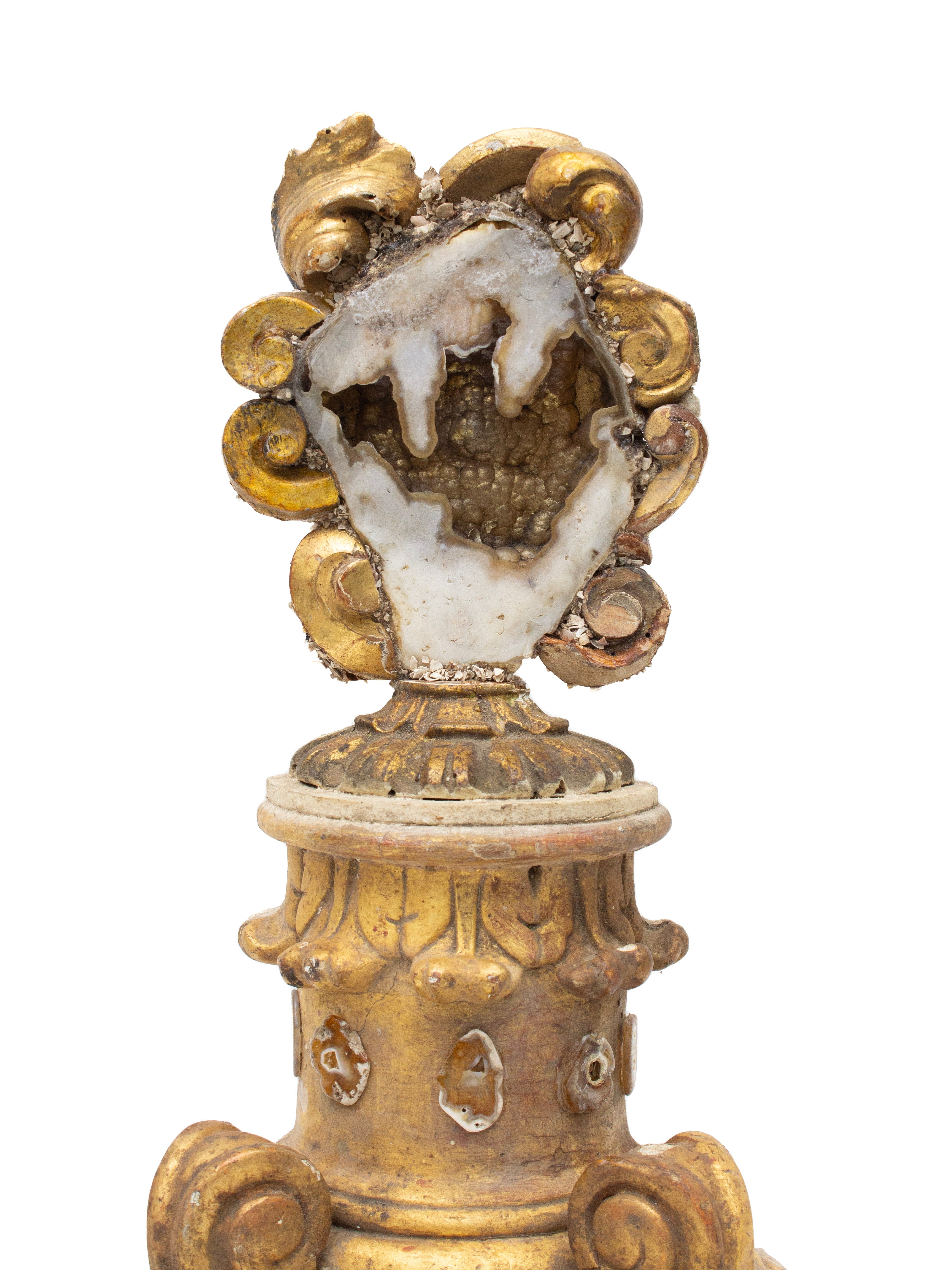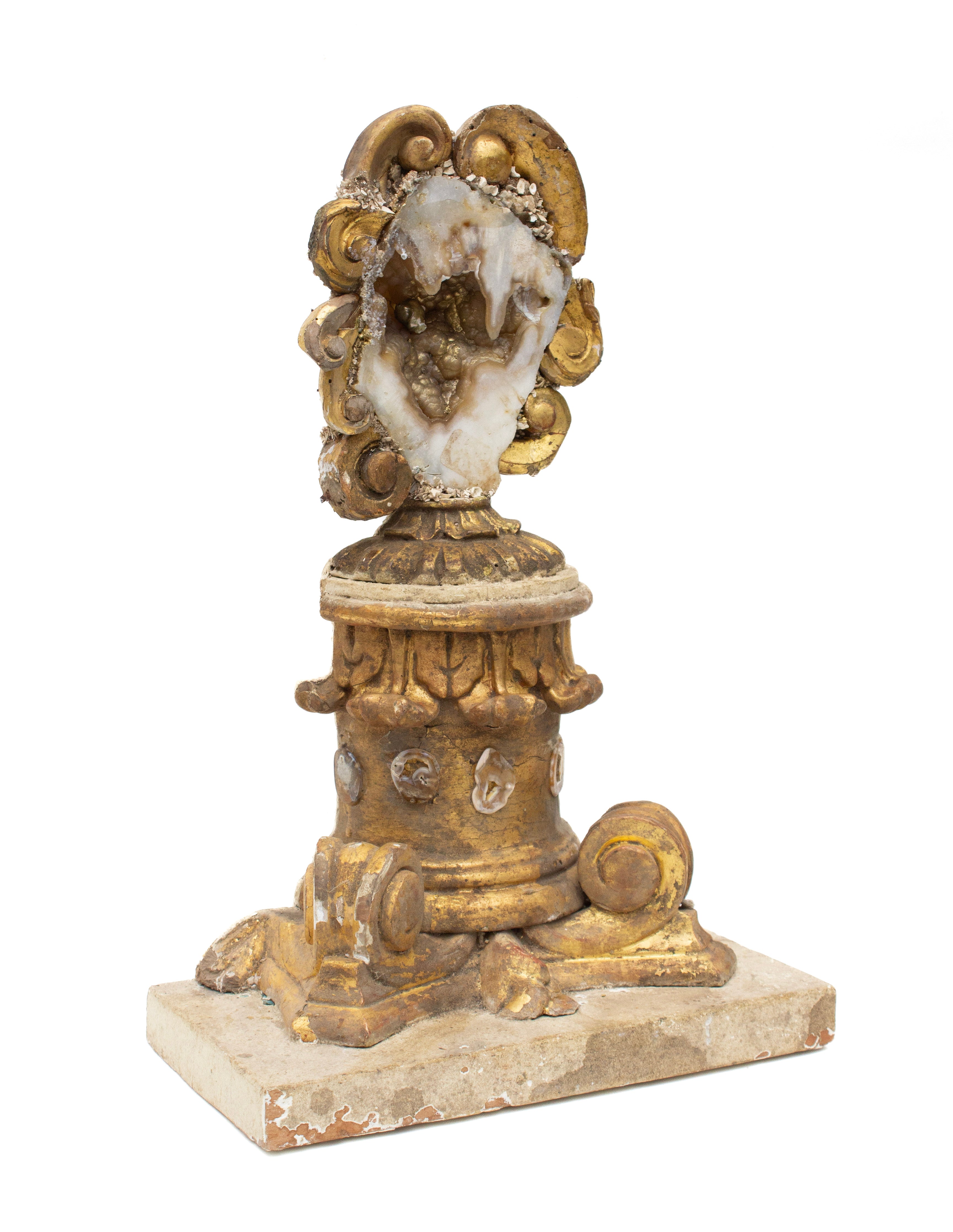 The gilded bases originally came from a pair of hand-carved vases from a historical church in Italy. They are mounted with a pair of fossil agate coral that are polished by hand. Agate coral is Florida's state stone and is known for its unique formation that can take place over 20 million years. It's a natural gemstone that is created when prehistoric coral is gradually replaced with agate. The gilded scroll fragments are 18th century and originally from Italy and adorn the fossil agate coral. Crushed fossil shells The polished agate slices also adorn the bases of the pair of artifacts.