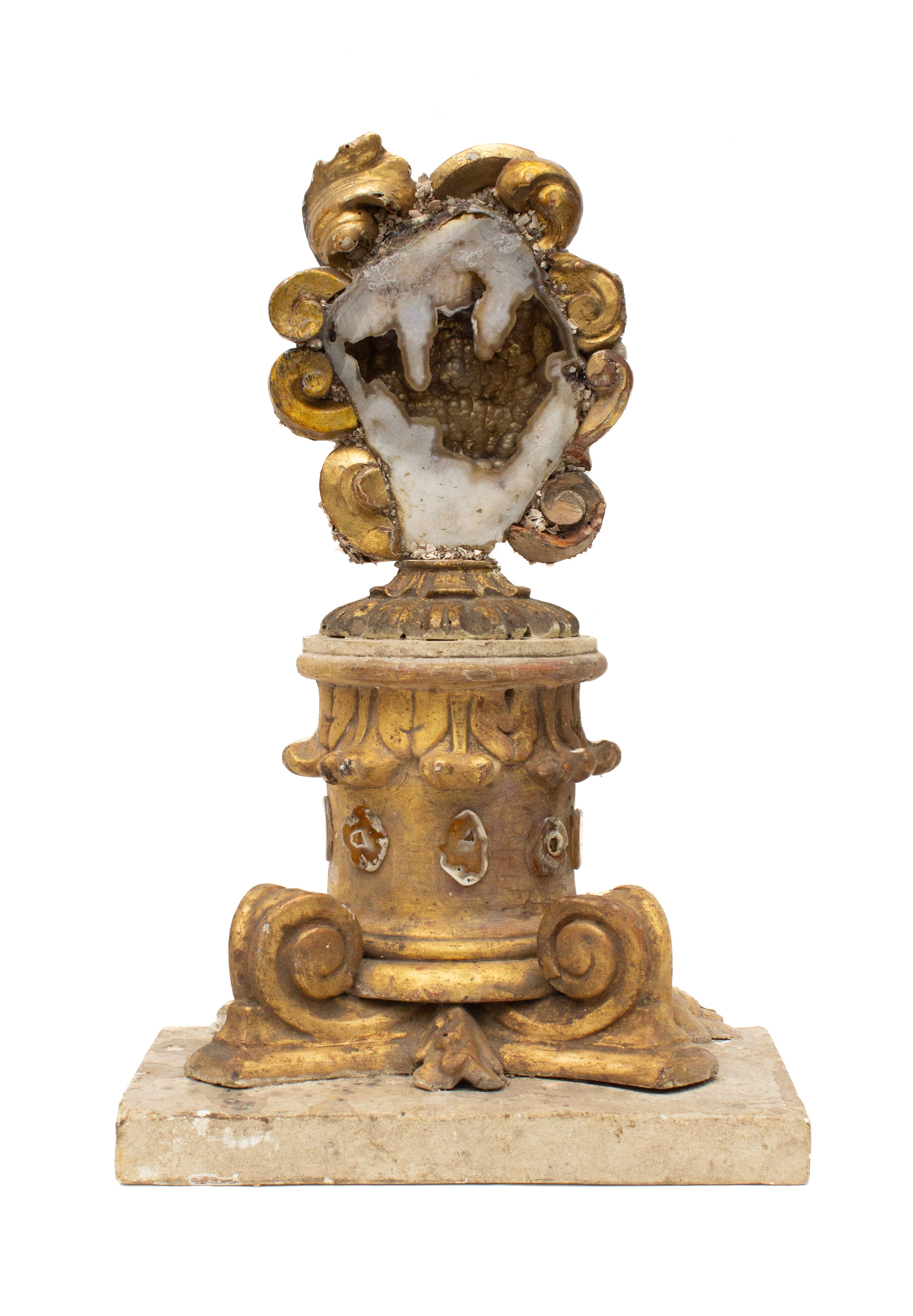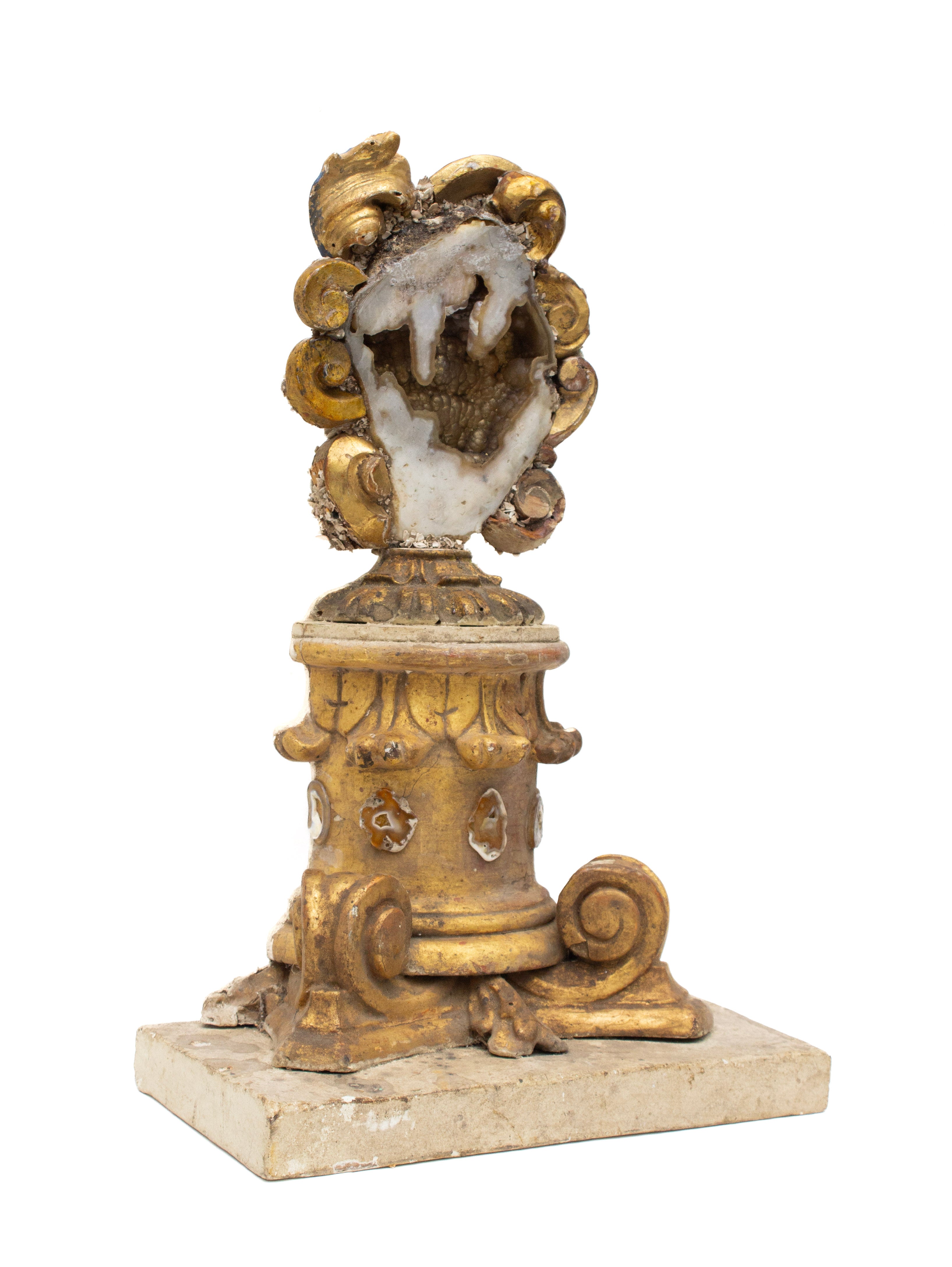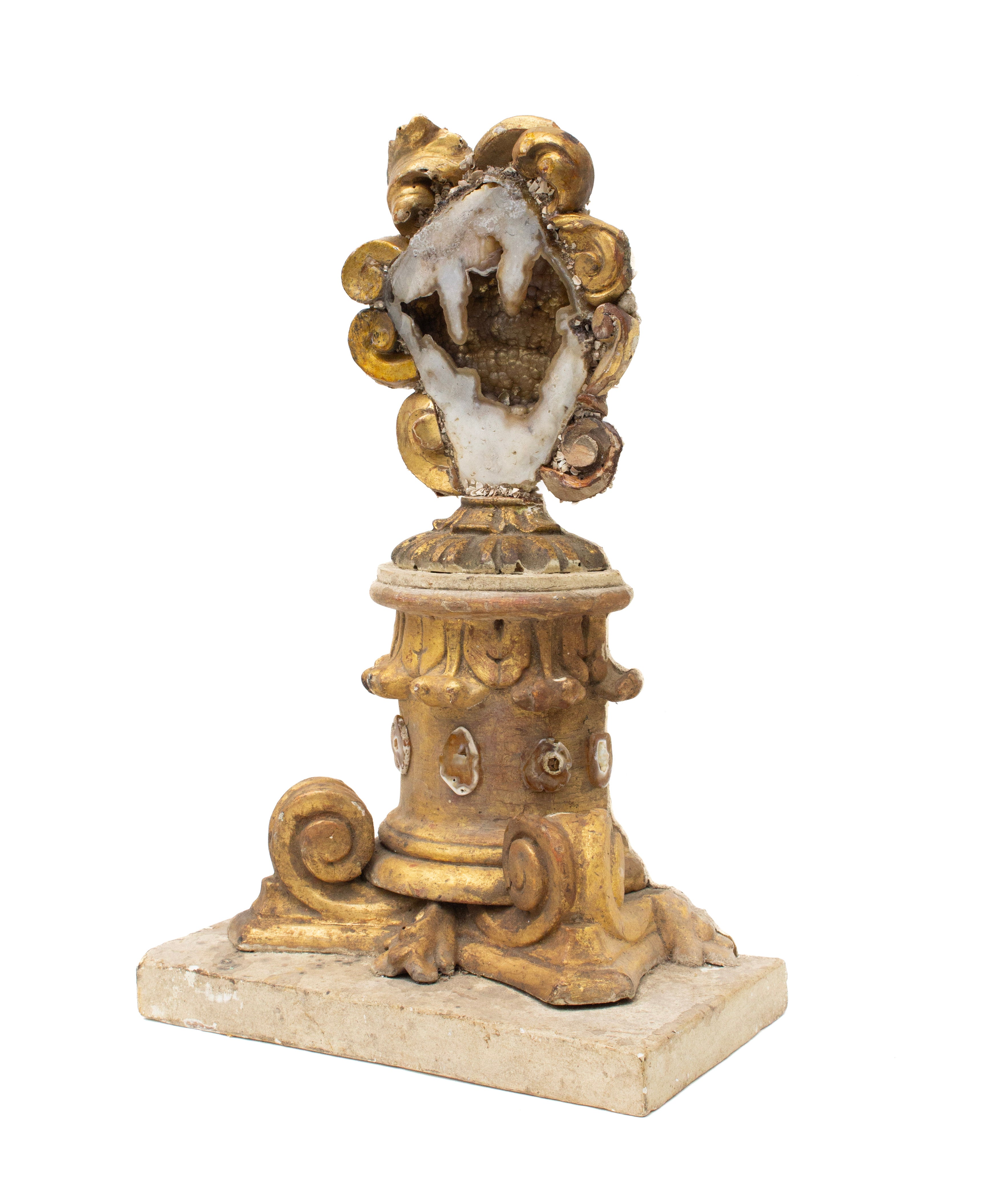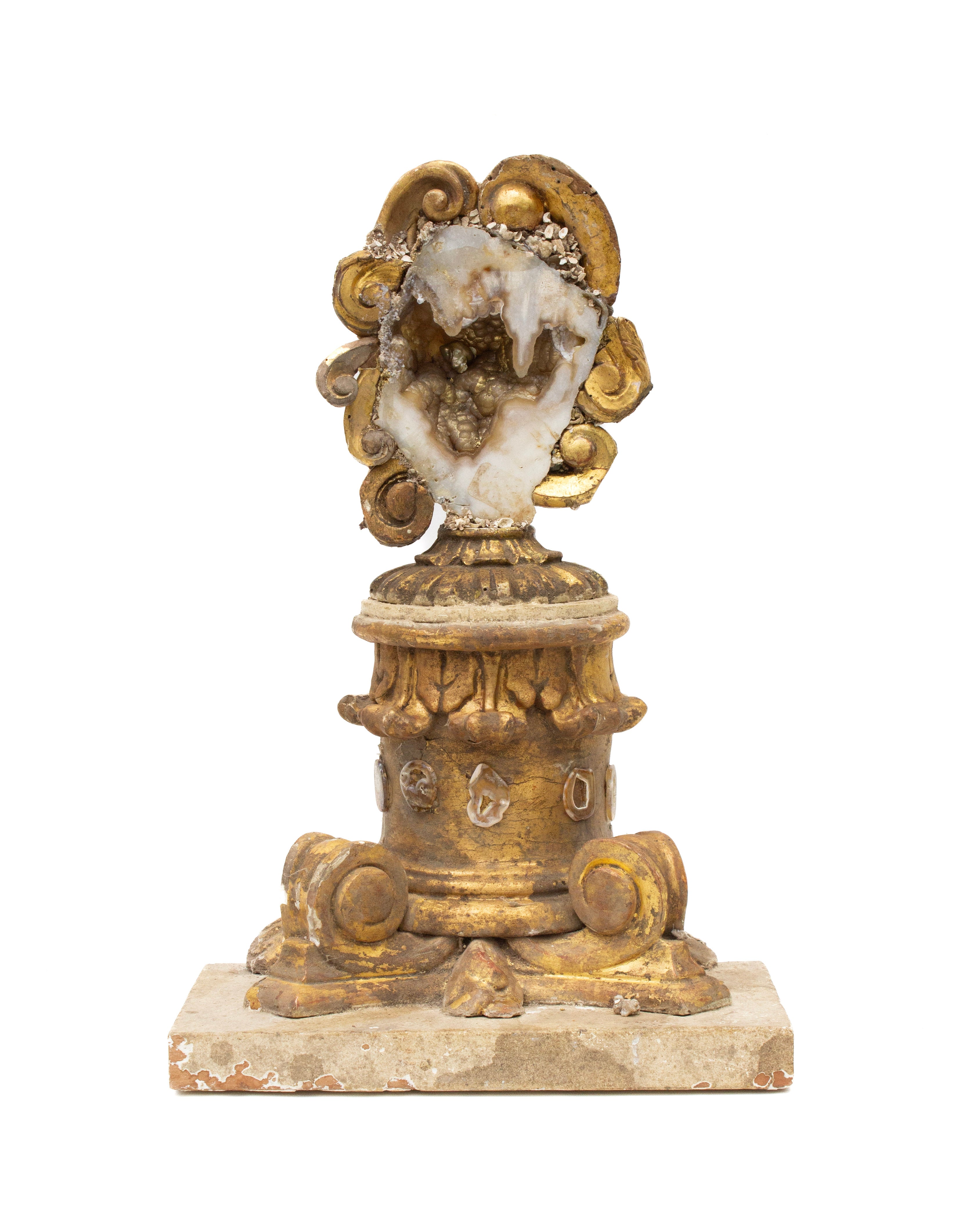 The gilded bases originally came from a pair of hand-carved vases from a historical church in Italy. They are mounted with a pair of fossil agate coral that are polished by hand. Agate coral is Florida's state stone and is known for its unique formation that can take place over 20 million years. It's a natural gemstone that is created when prehistoric coral is gradually replaced with agate. The gilded scroll fragments are 18th century and originally from Italy and adorn the fossil agate coral. Crushed fossil shells The polished agate slices also adorn the bases of the pair of artifacts.
