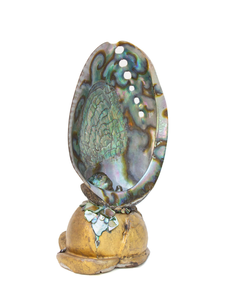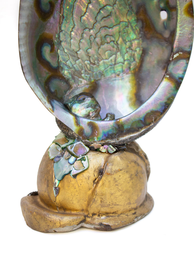 Iridescent abalone shell mounted on an 18th century Italian gilded and hand-carved base with baroque pearls.