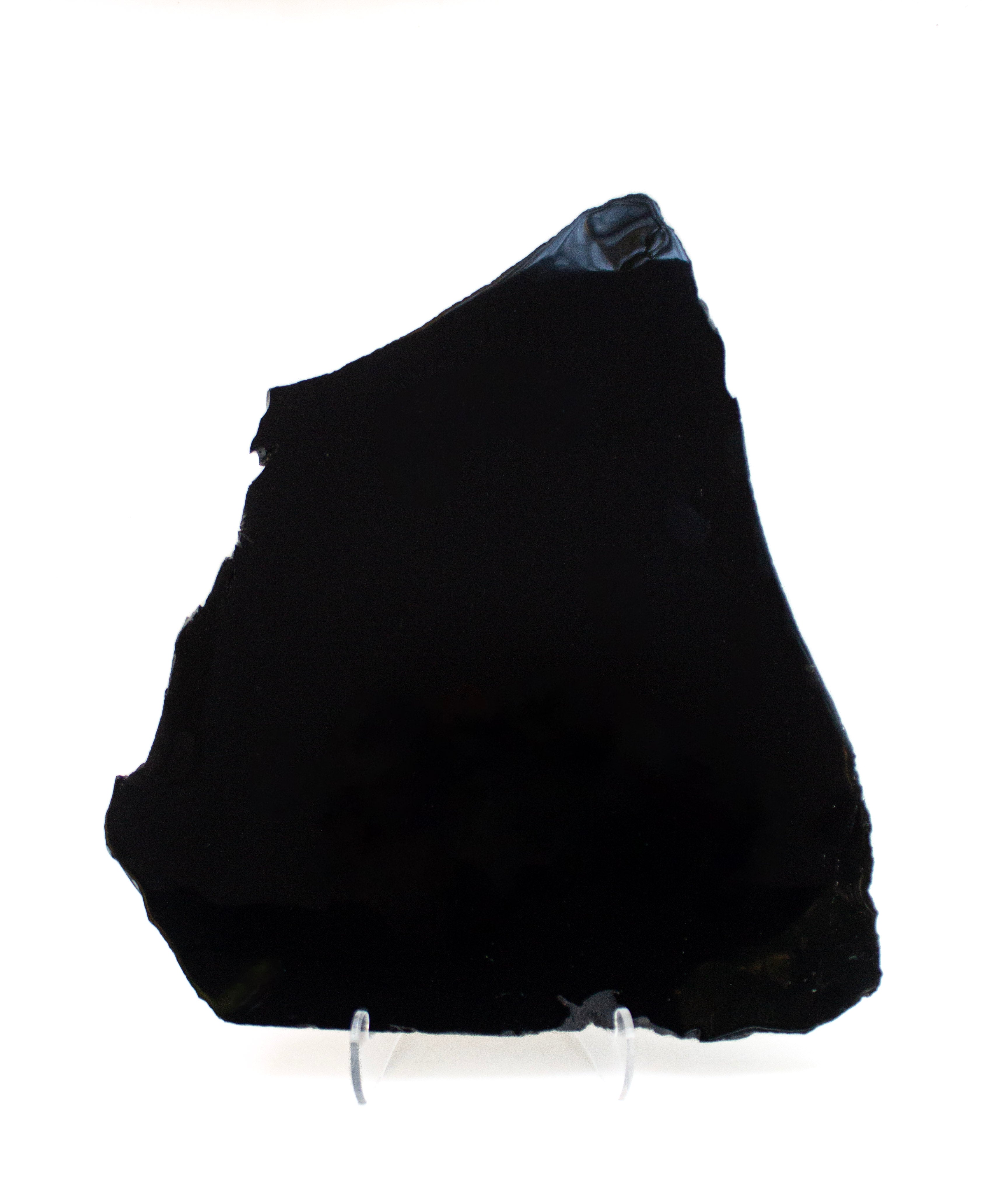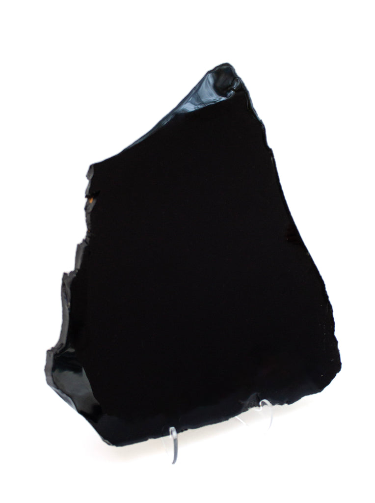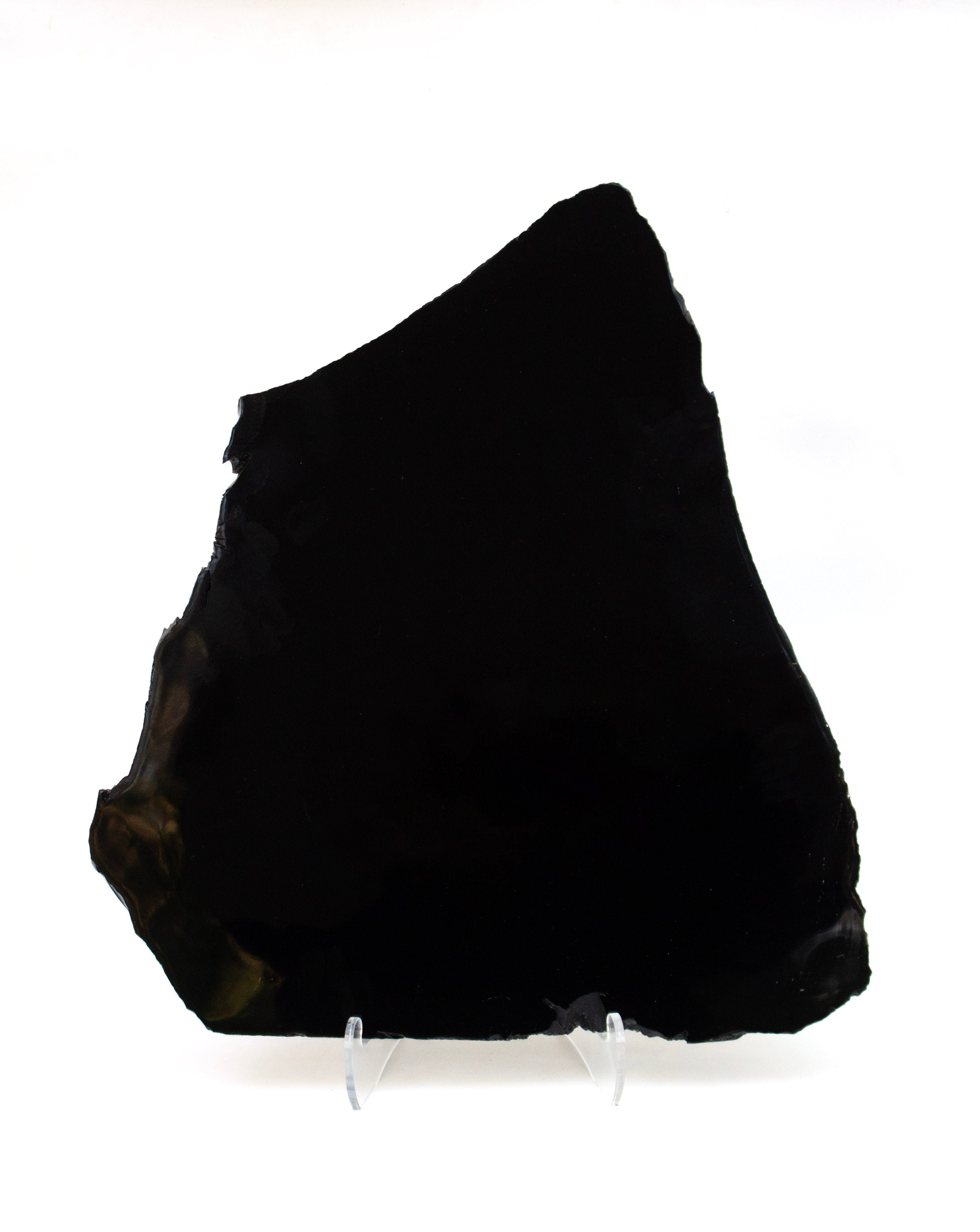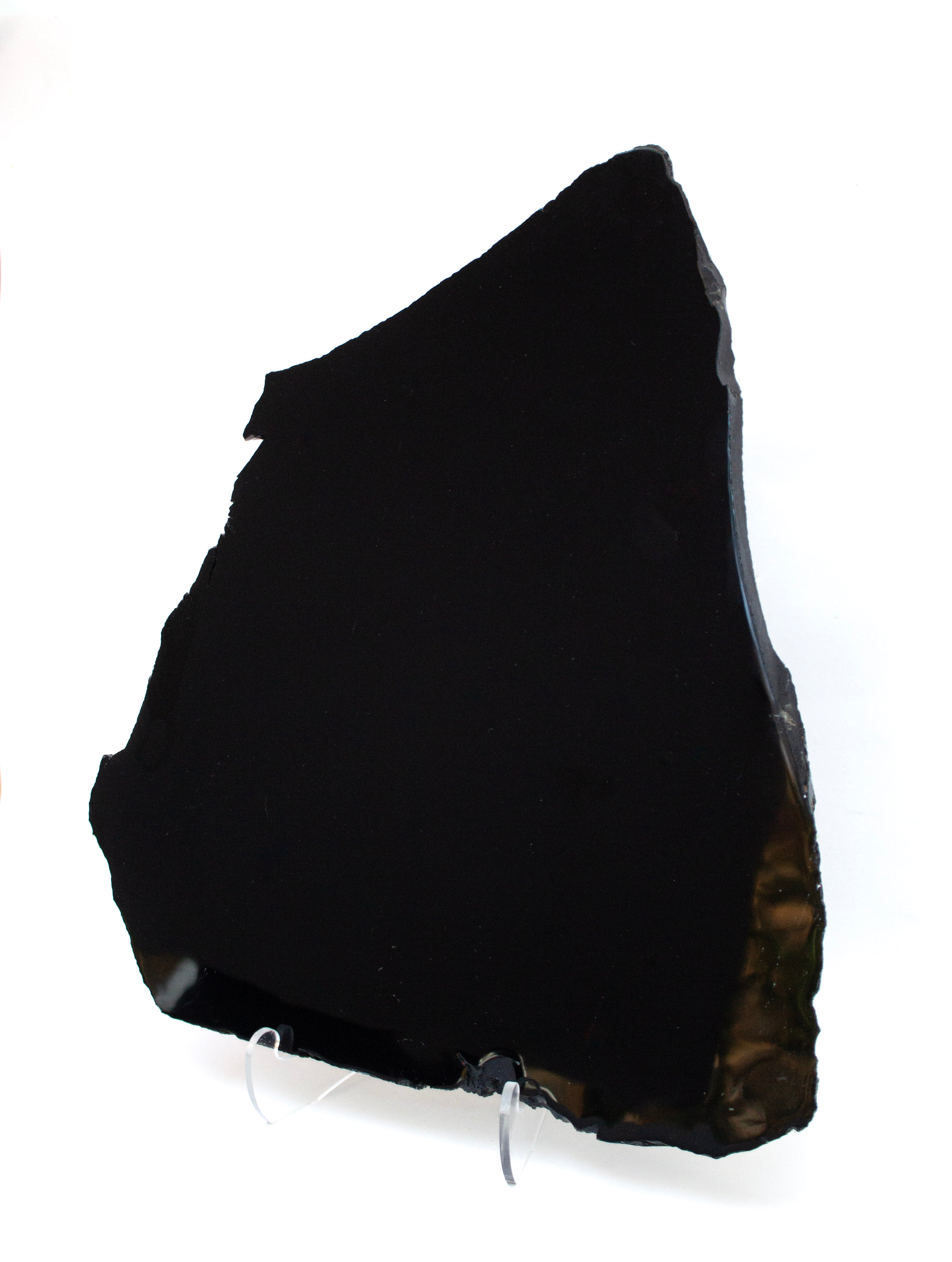 The obsidian has been polished to shine on its front facing side with the edges remaining in their natural raw form.