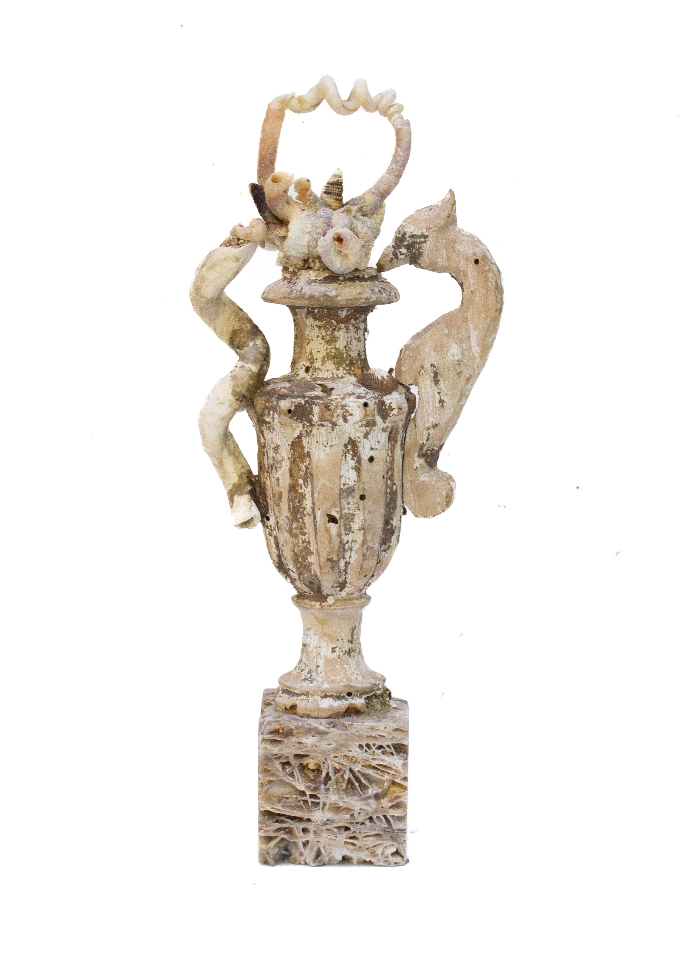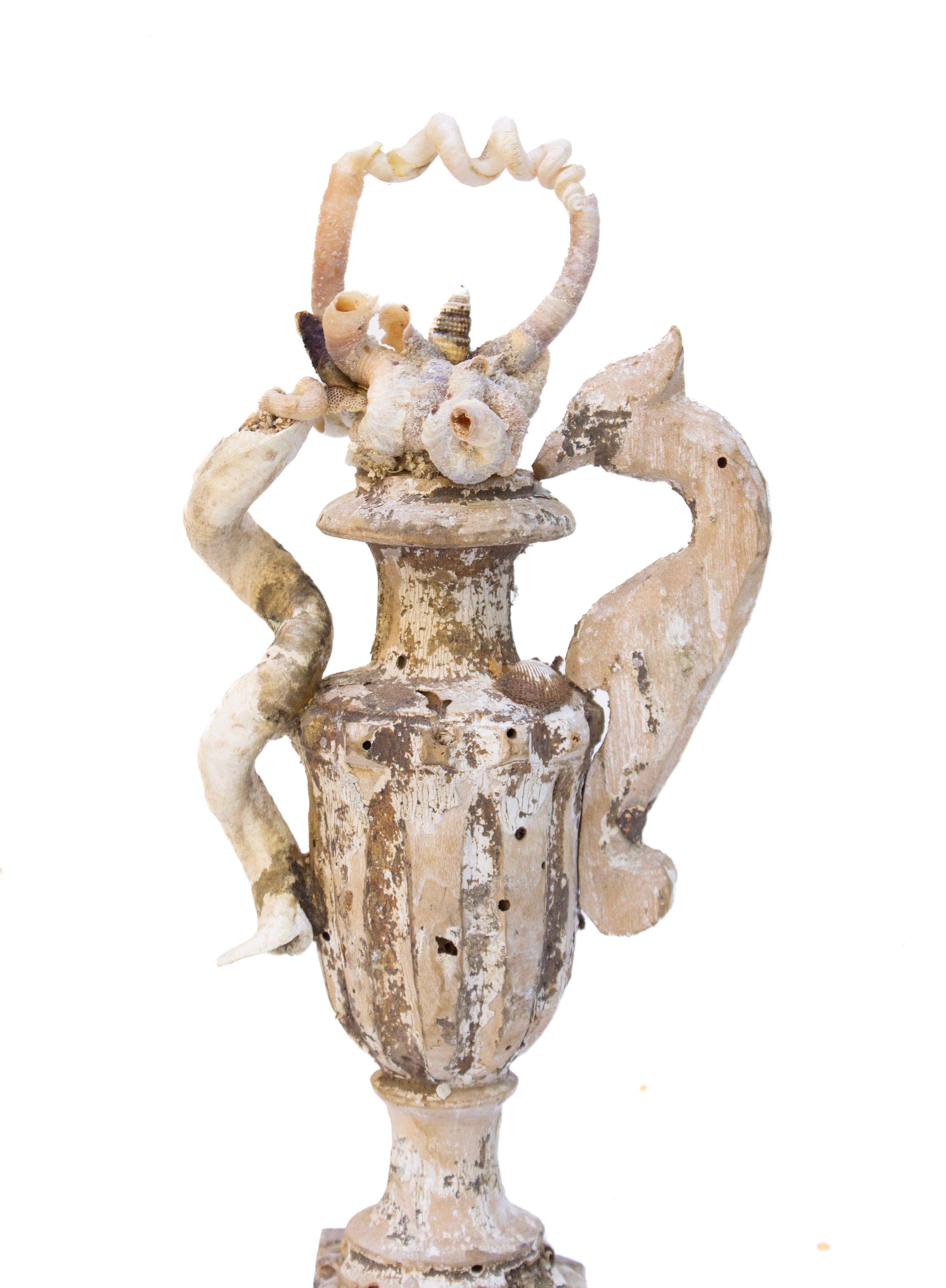 This fragment is from a church in Florence. It was found and saved from the historic flooding of the Arno River in 1966. There is still the original paint and silt left on the piece to uphold the integrity, craftsmanship, and history of the sculptural fragment. They are adorned with the rare serpulorbis imbricatus and siliquaria fossil shell formations which were discovered and collected in 1860 in Japan.