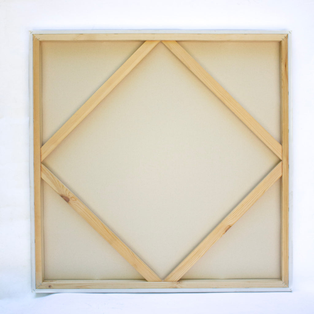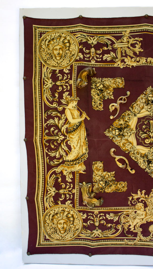 The scarf has been stretched and pressed to canvas with antique embossed fasteners. The elements create a work of art to grace any wall or space.