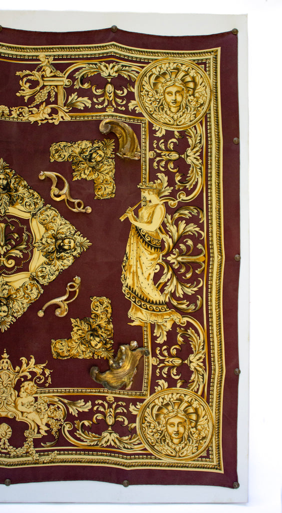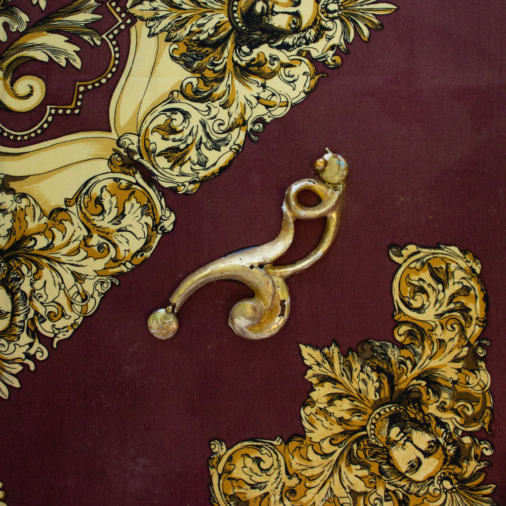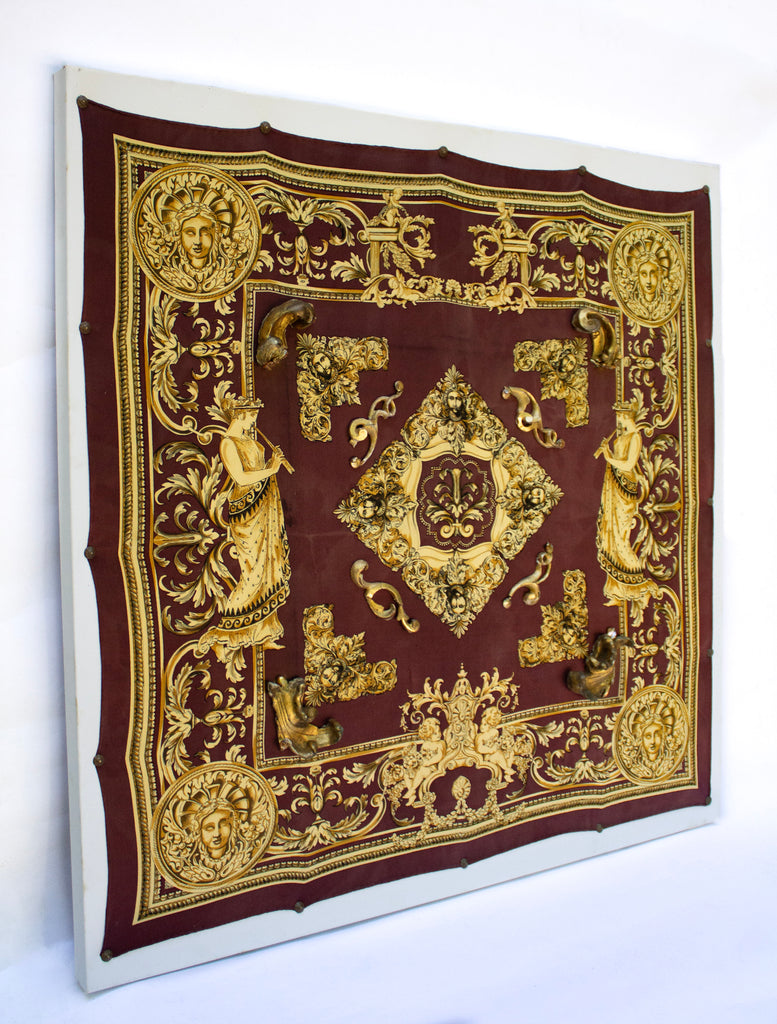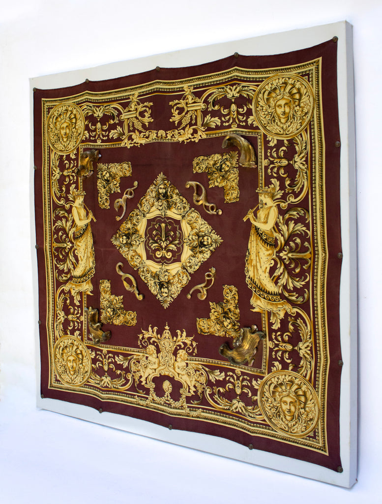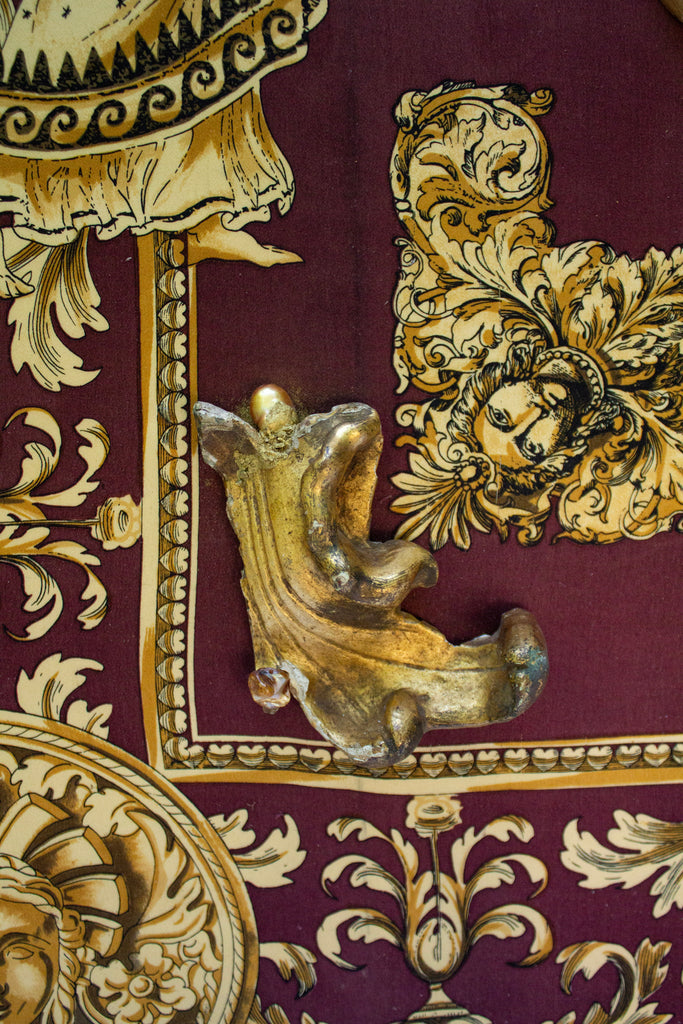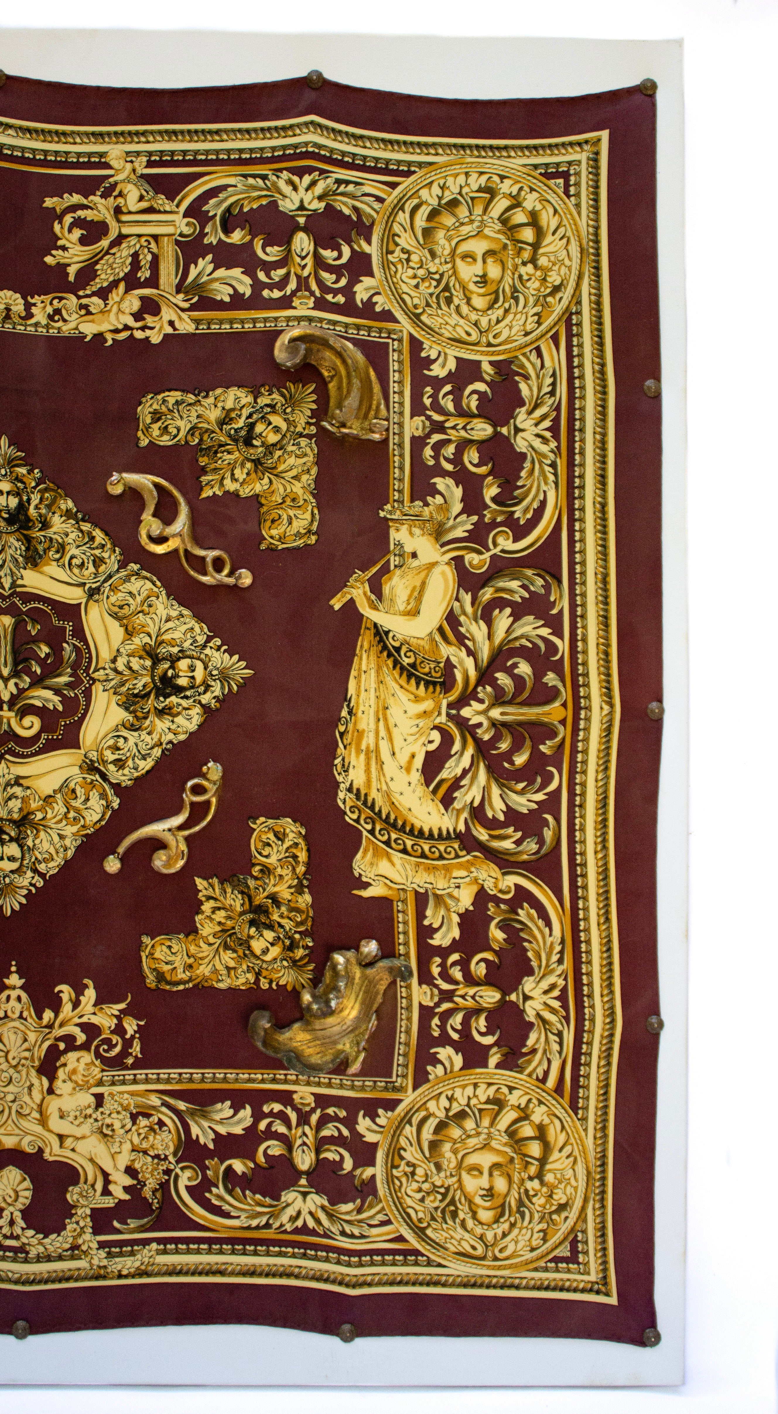 Vintage Italian rococo silk scarf with 18th century Italian gilded wood fragments and natural-forming baroque pearls on canvas.