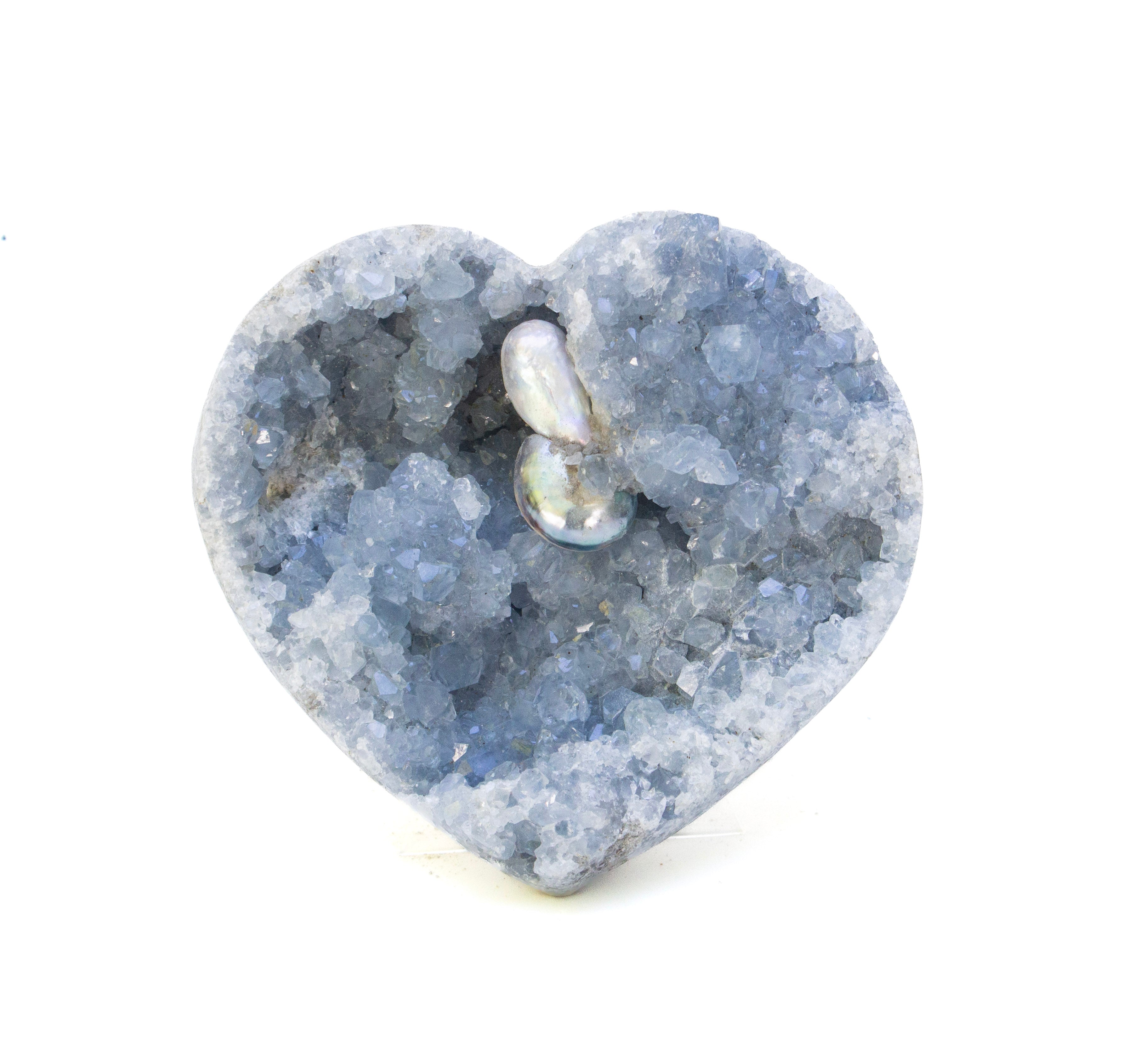Blue heart-shaped celestite geode adorned with coordinating naturally forming baroque pearls.