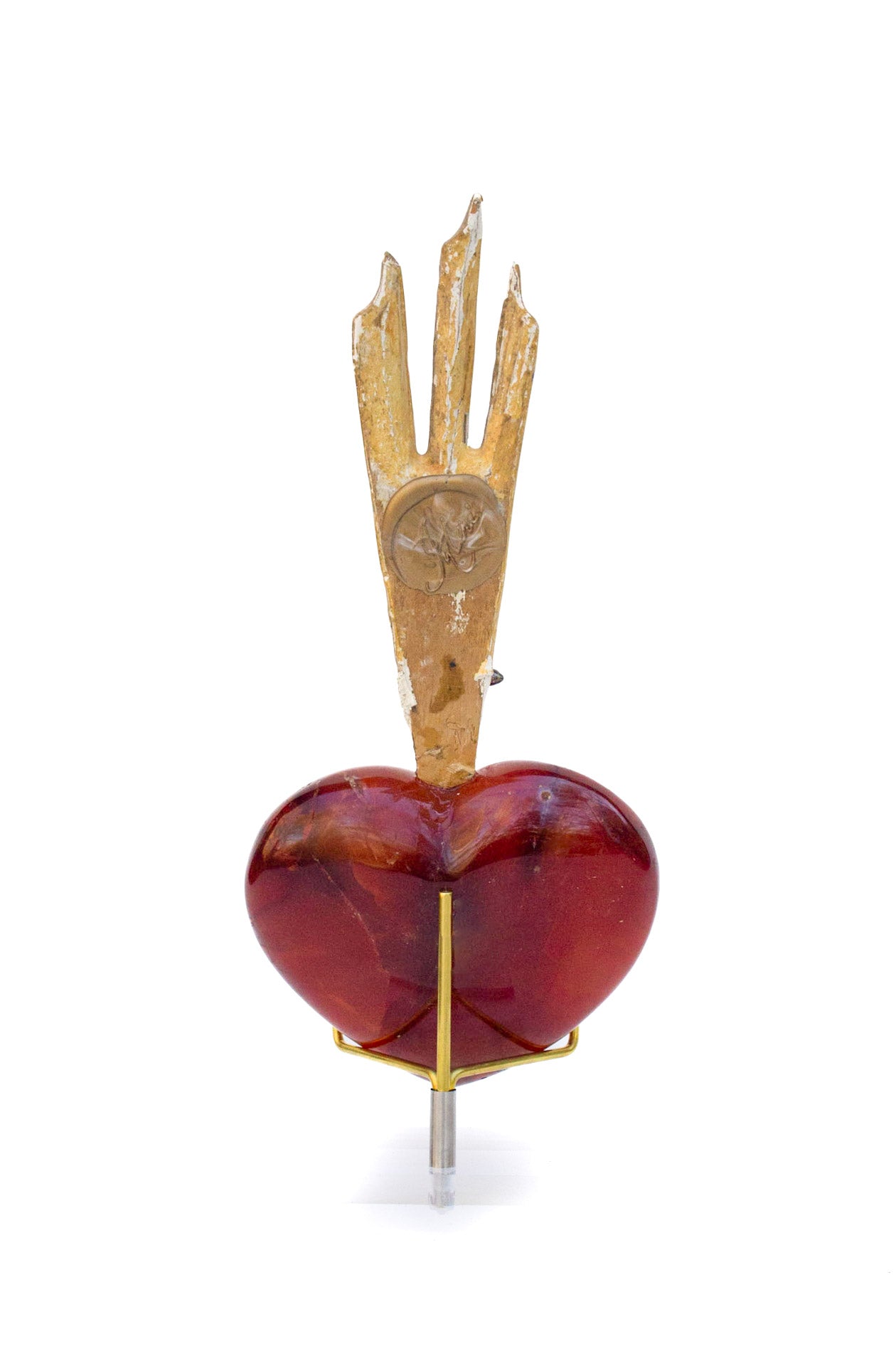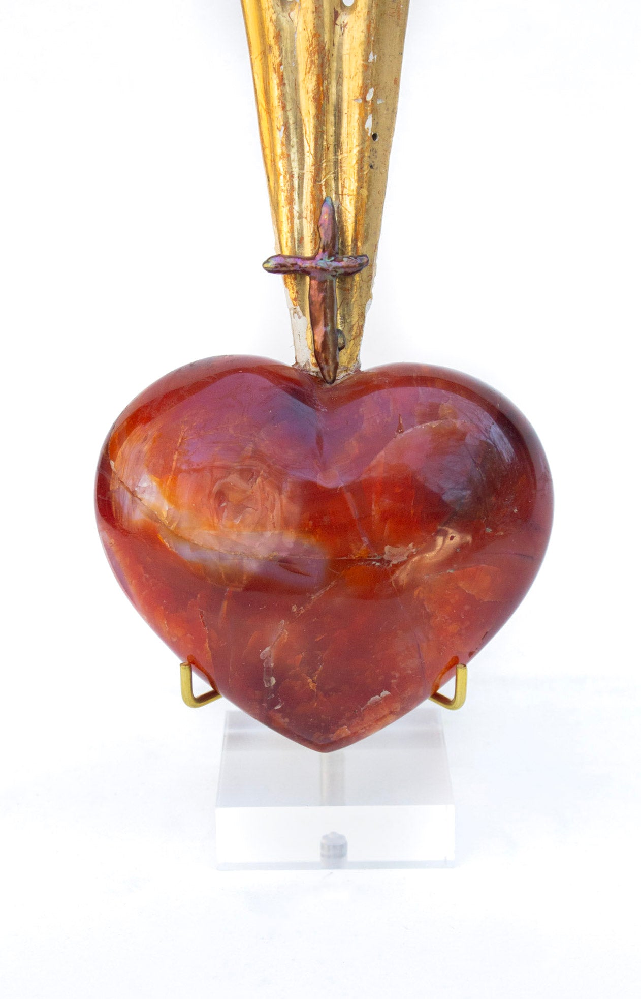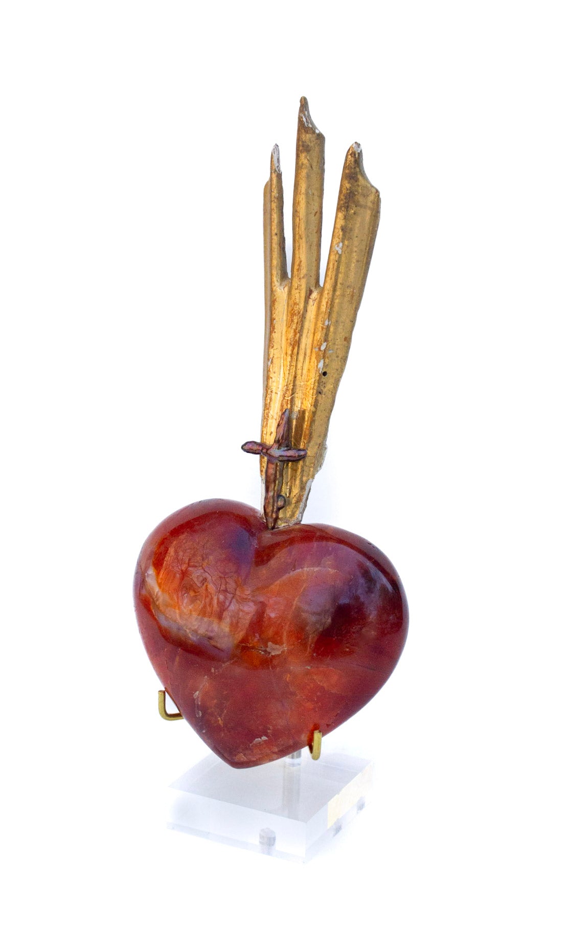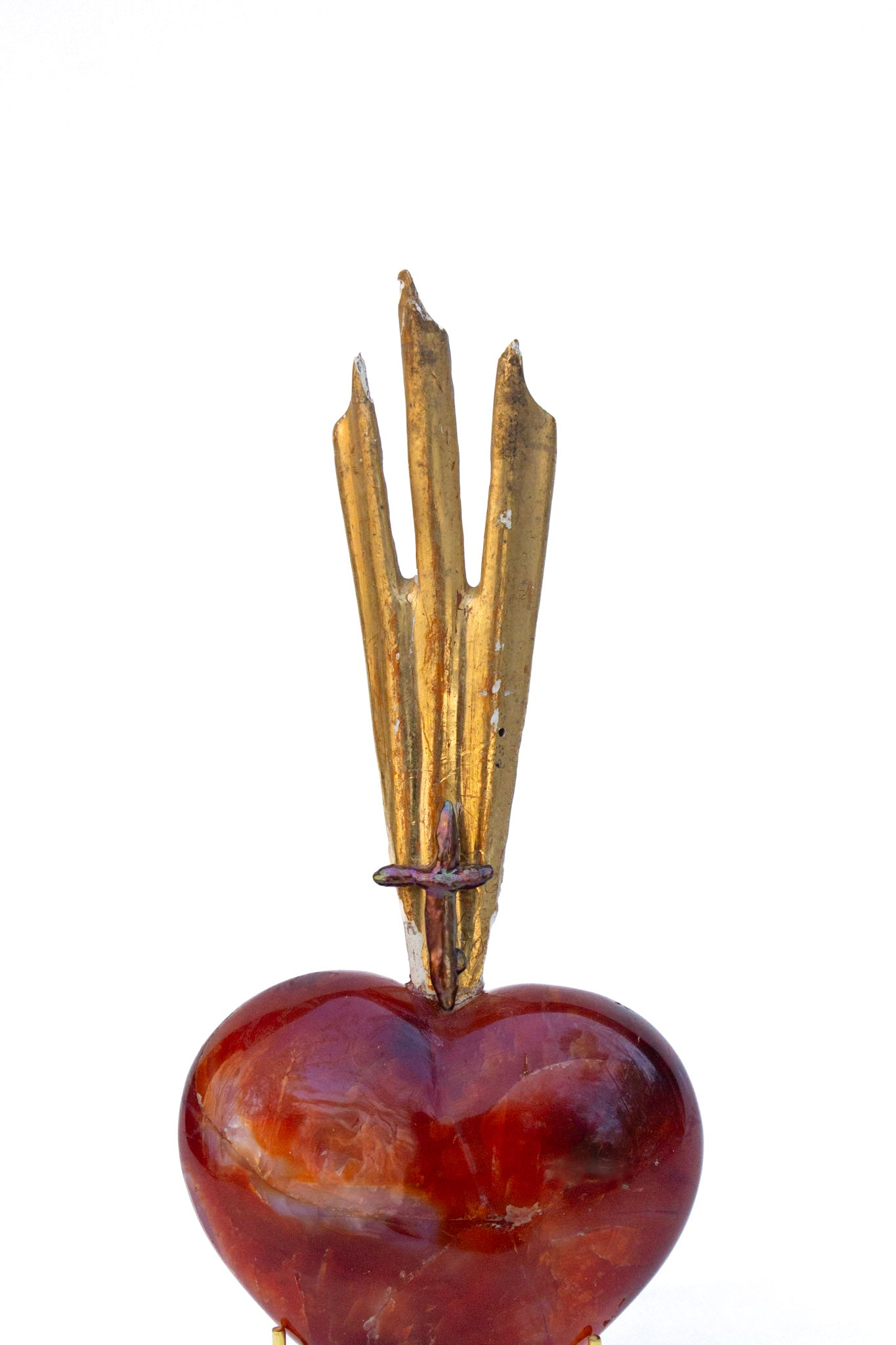 18th century Italian gilded sunray mounted on a polished red hematoid heart and adorned with a cross-shaped baroque pearl. The piece is inspired by "The Sacred Heart" in Catholic art history which symbolizes God's unconditional love for mankind. The sunray originally came from an heavenly depiction or halo motif from a historical church in Italy.