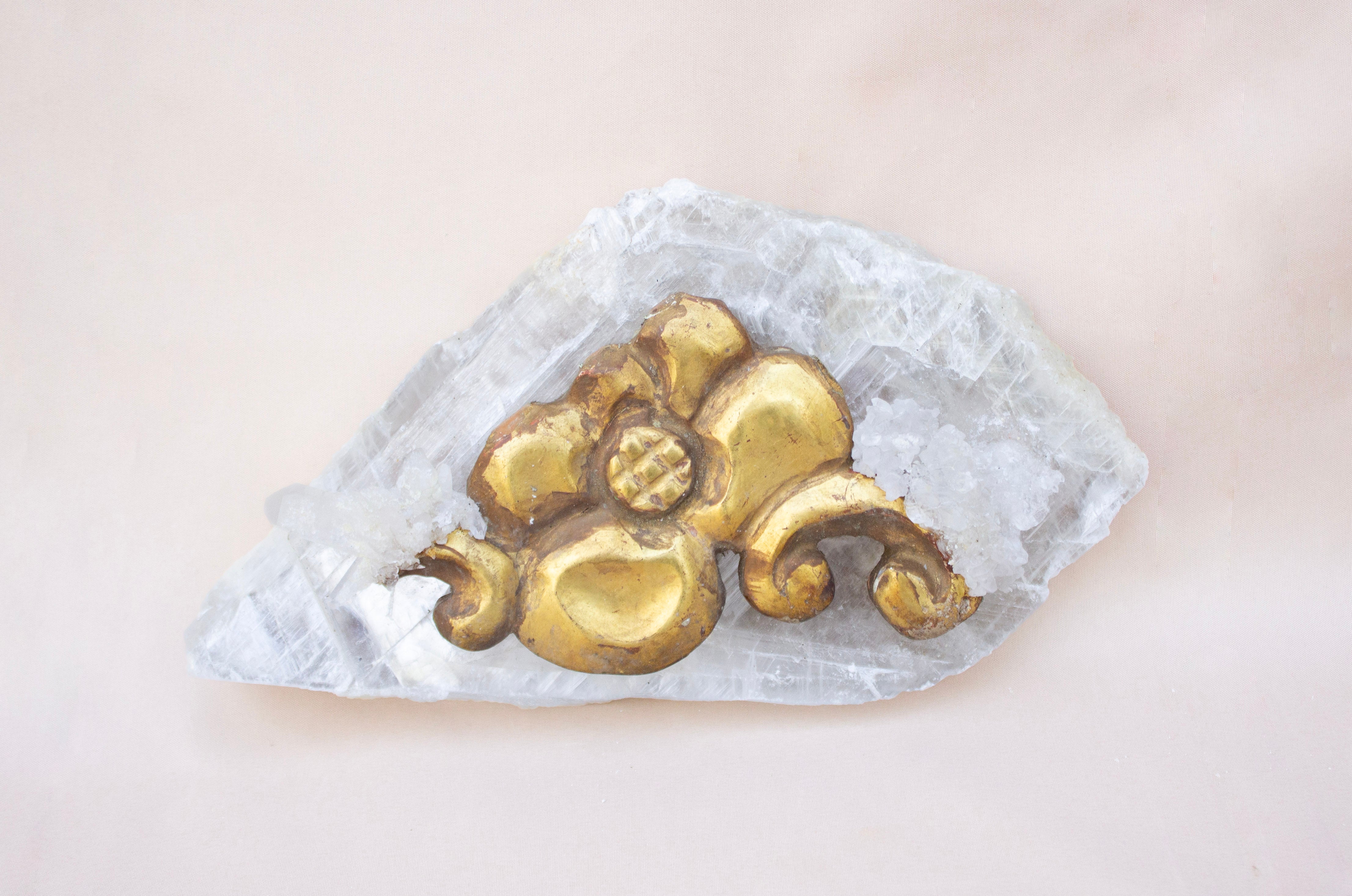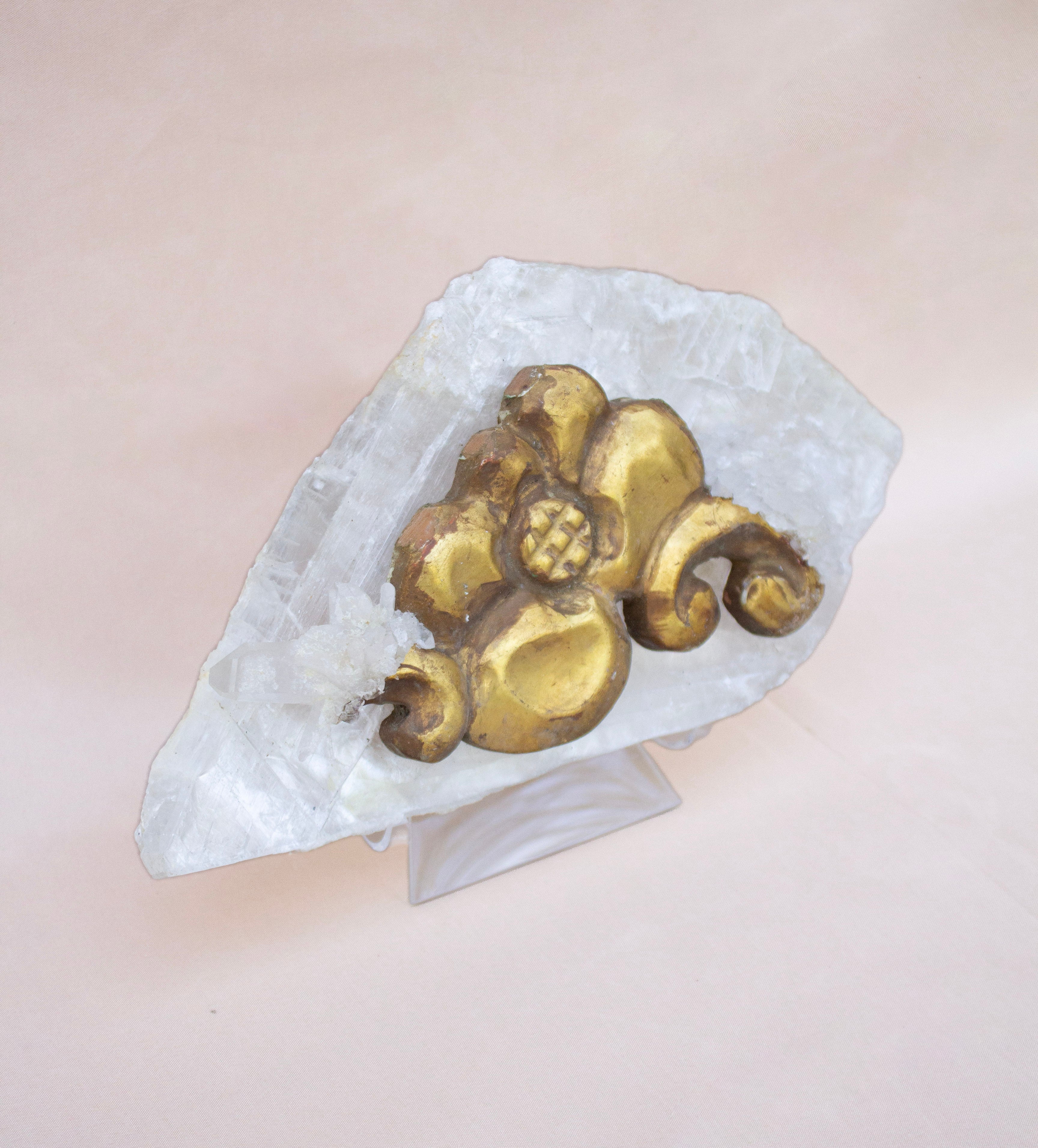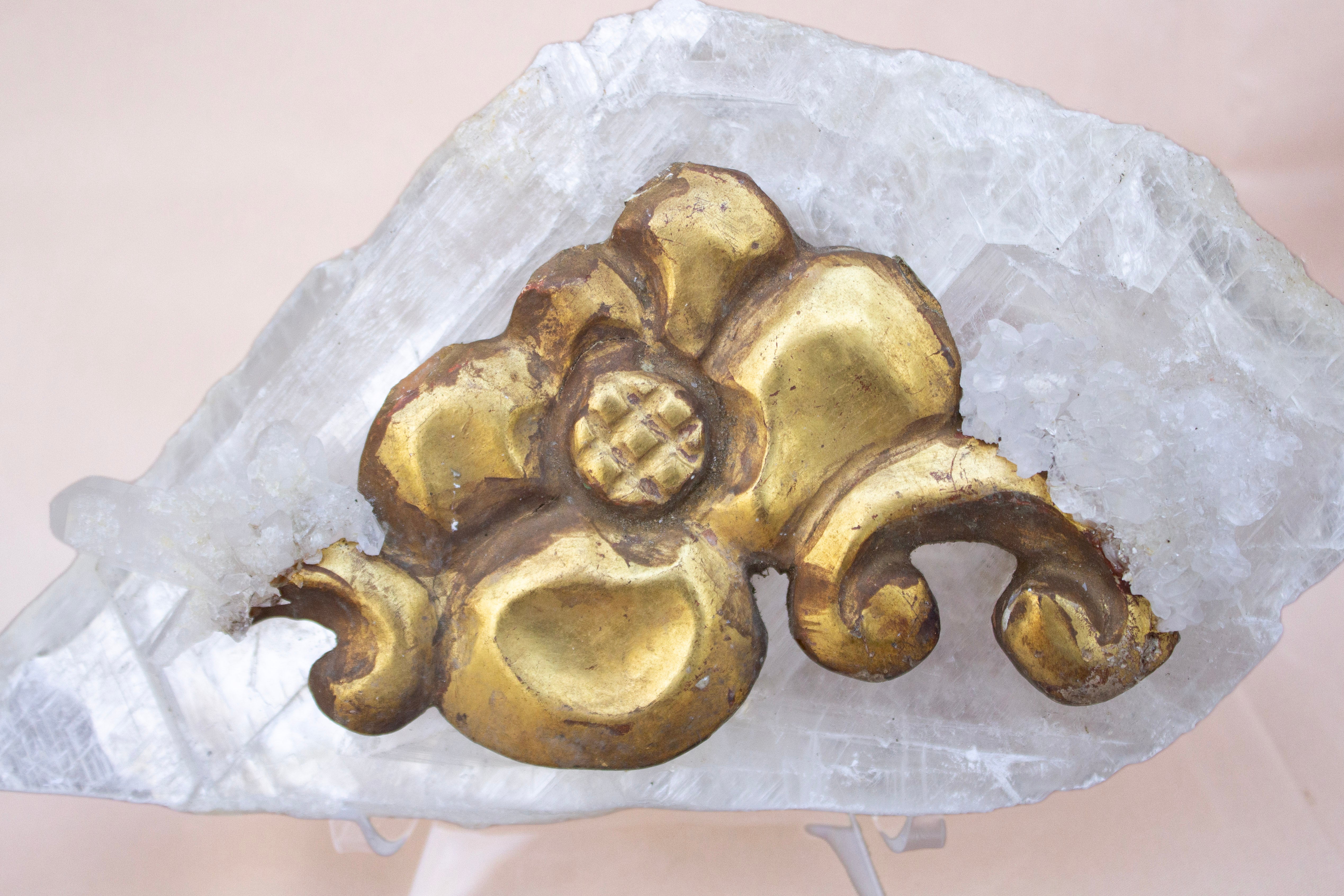 Sculptural 18th century Rococo Italian gilded leaf fragments with quartz crystals on a selenite slab.