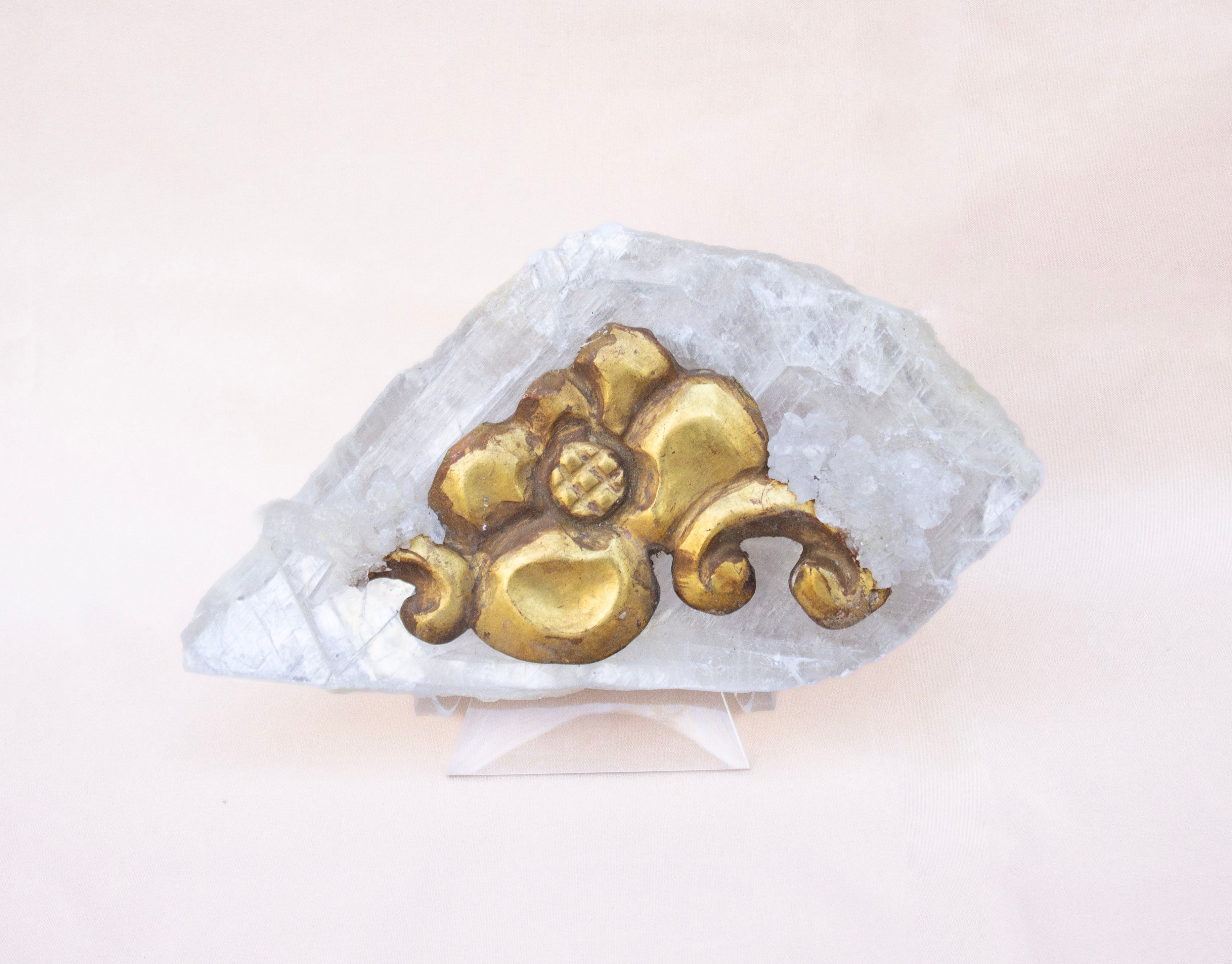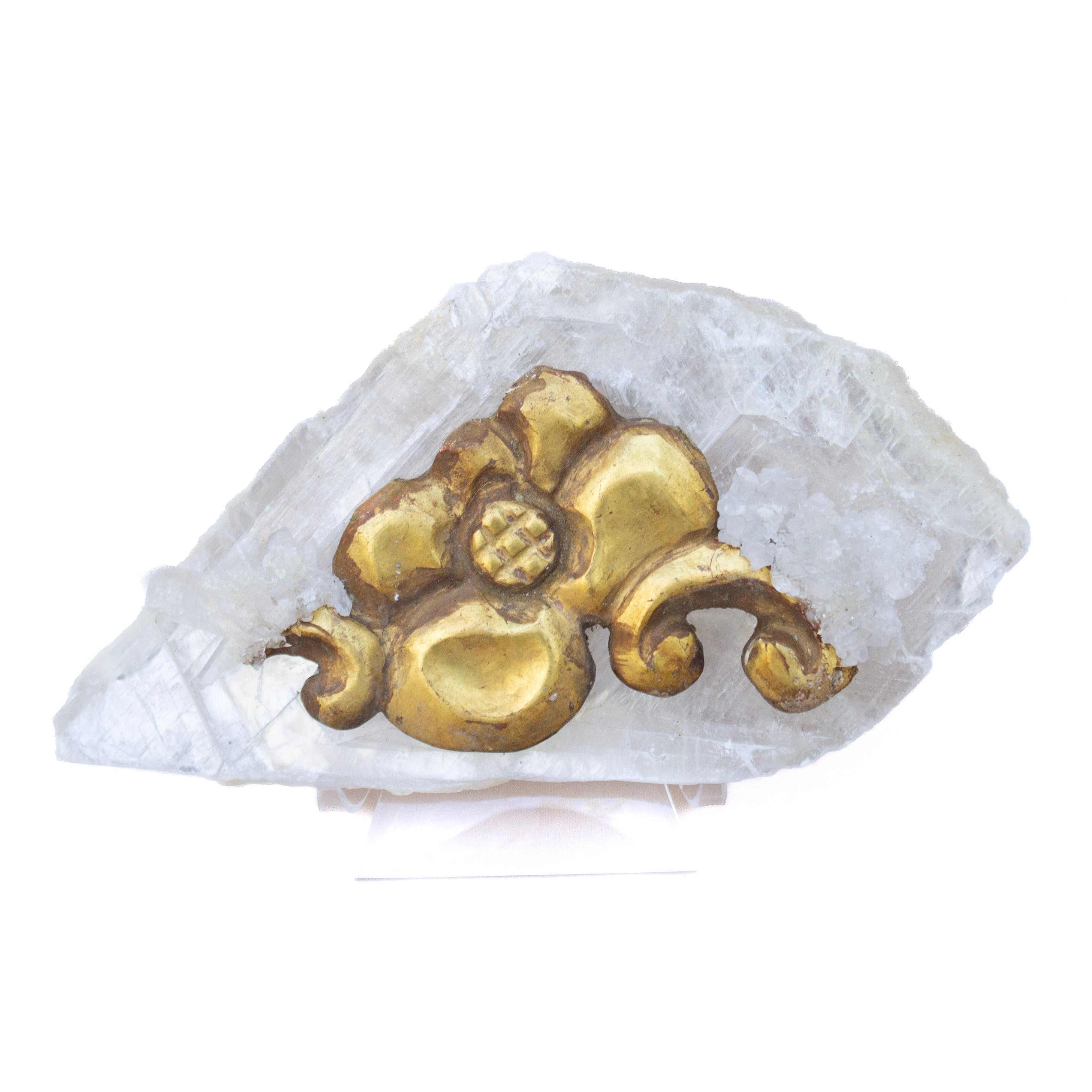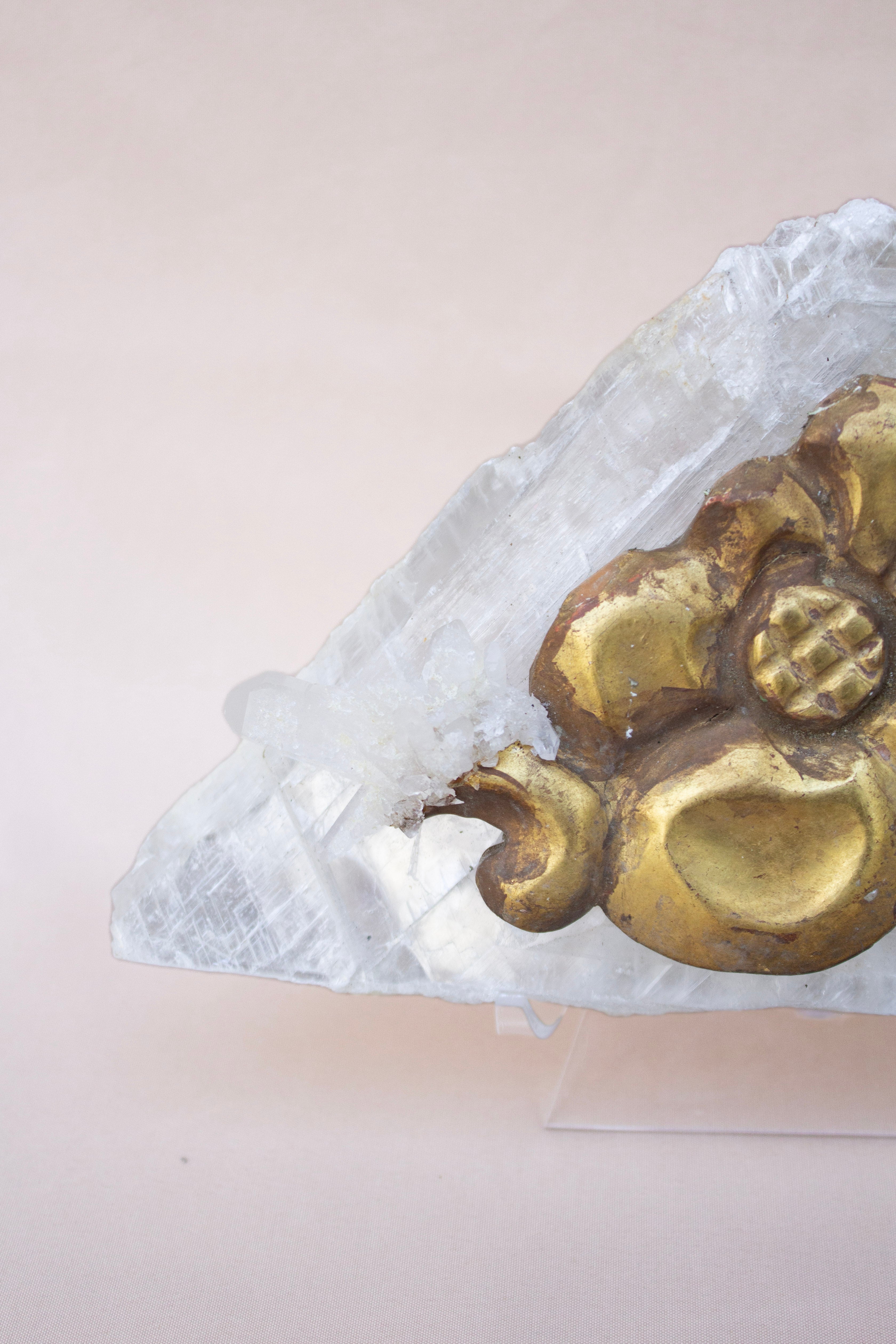Sculptural 18th century Rococo Italian gilded leaf fragments with quartz crystals on a selenite slab.