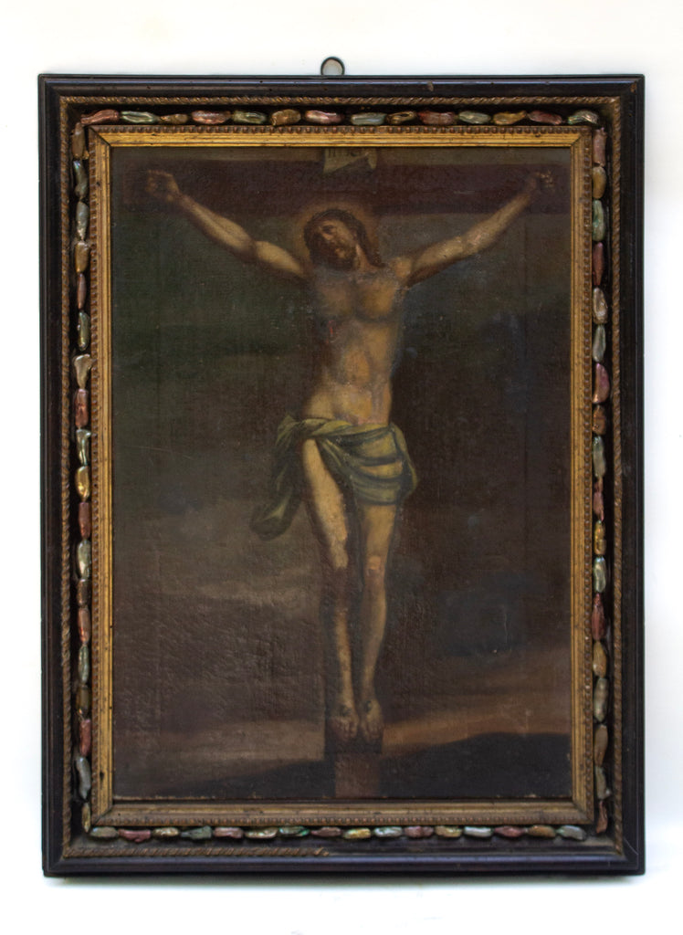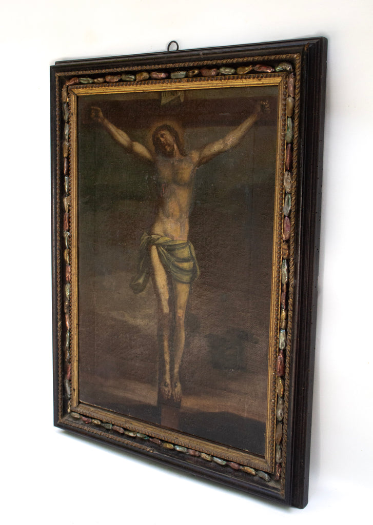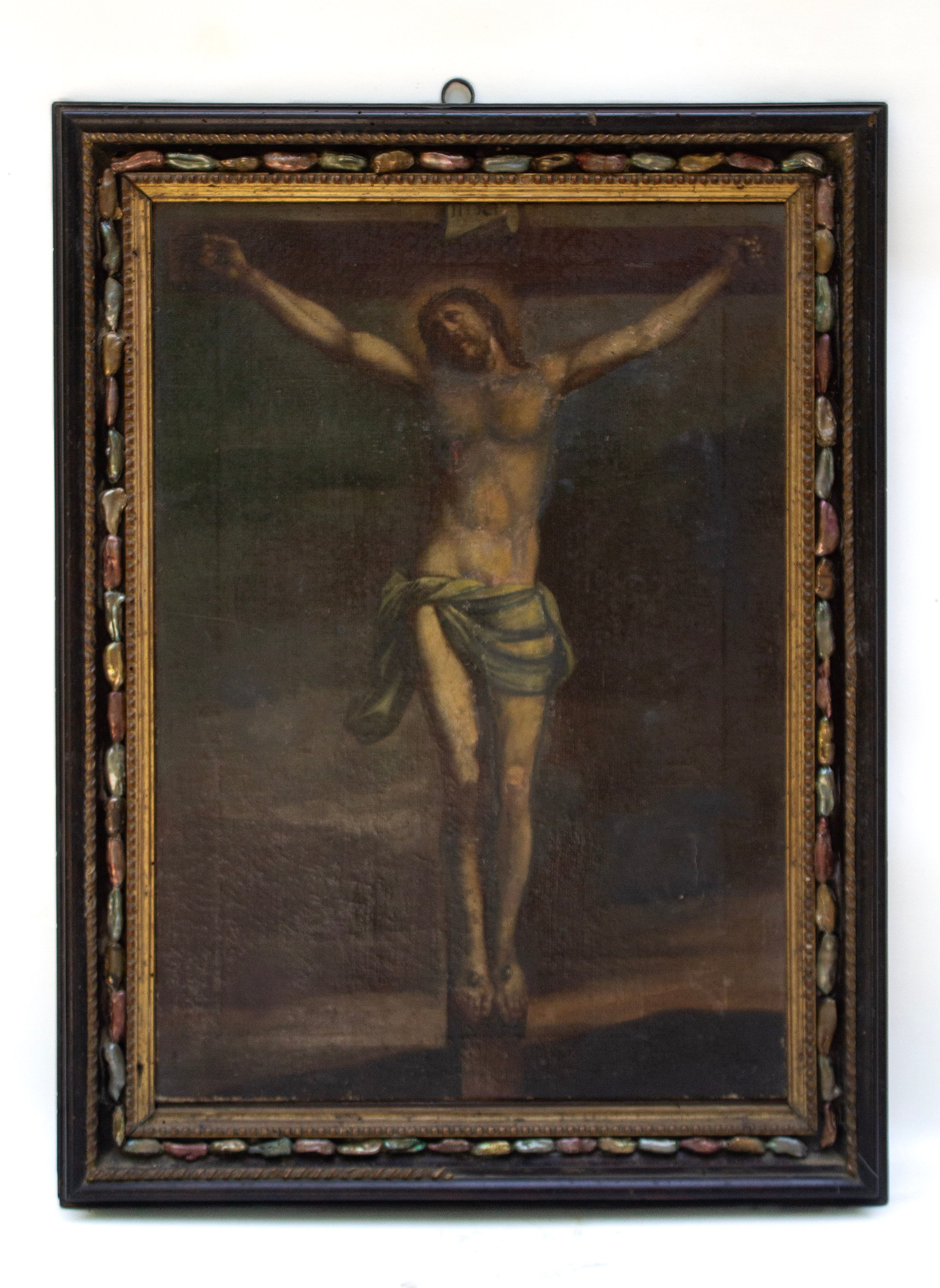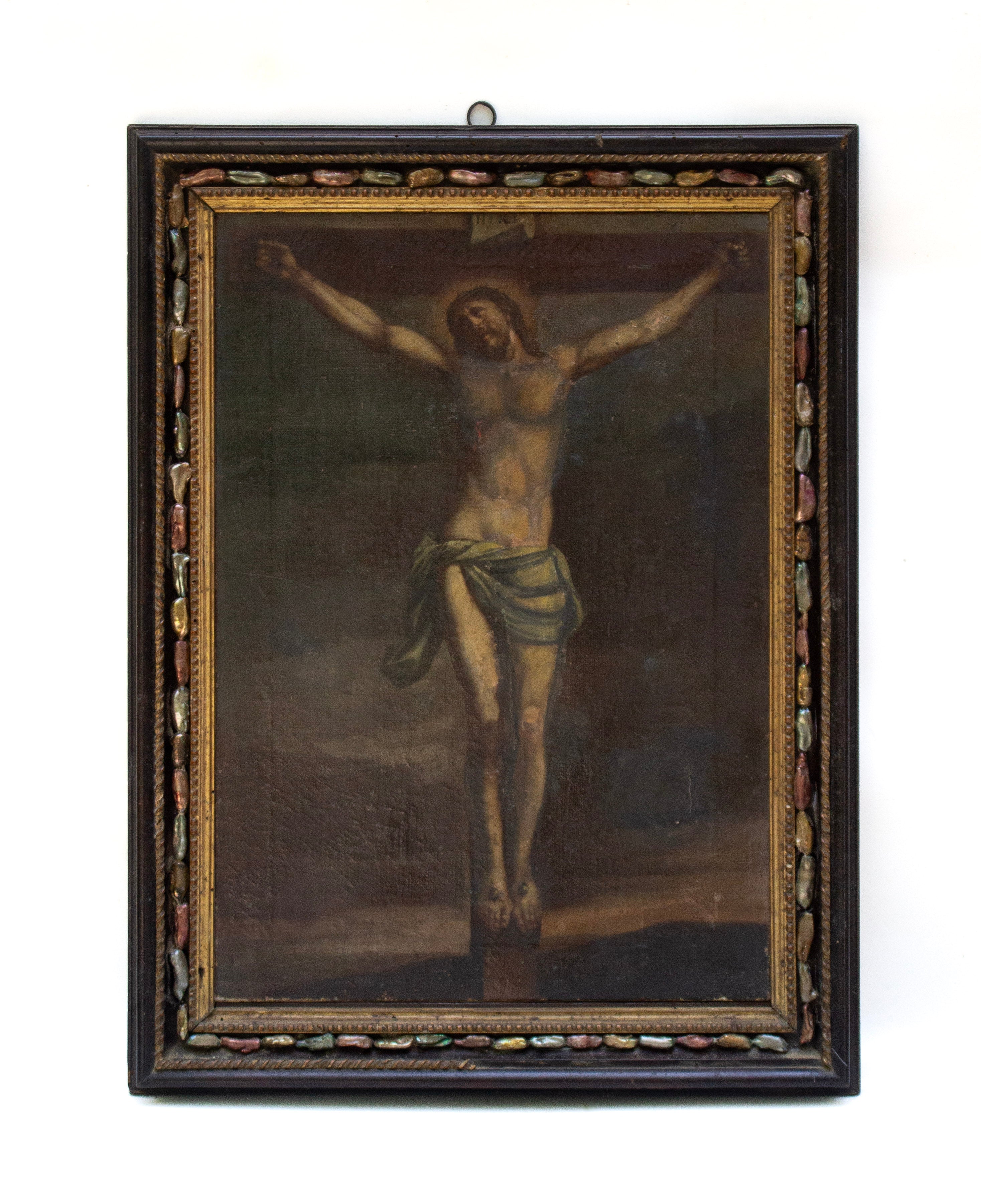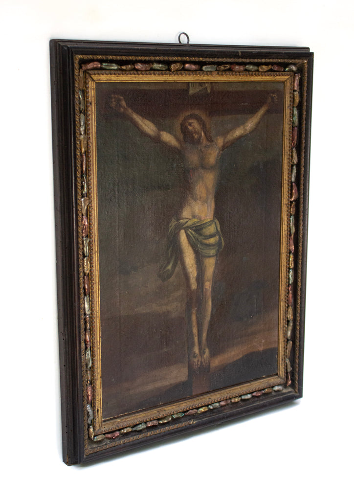17th century Italian painting of the crucifixion of Christ on canvas in its original wood frame and adorned with naturally formed coordinating baroque pearls.