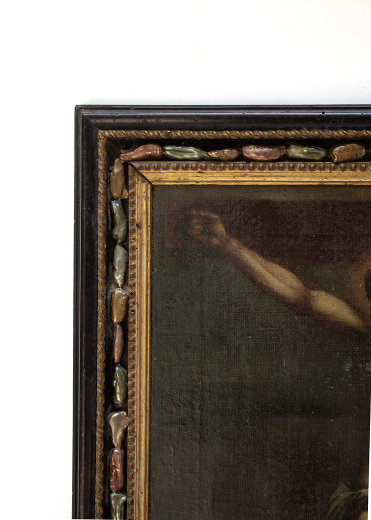 This historical piece embodies the traditional baroque style of the Renaissance with its dark color pallet and intense depiction of the crucifixion of Jesus. The original frame is accented by the pearls, highlighting the skin and cloth of Jesus.