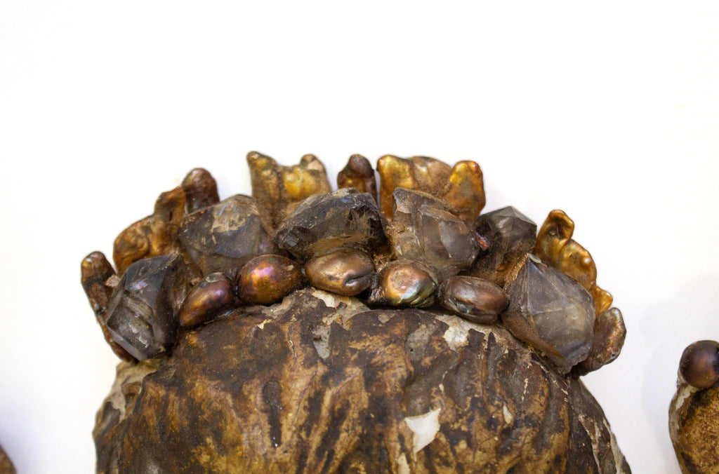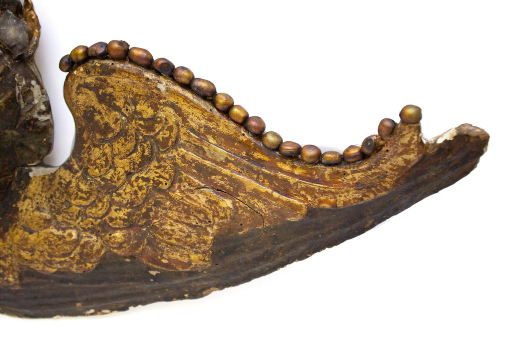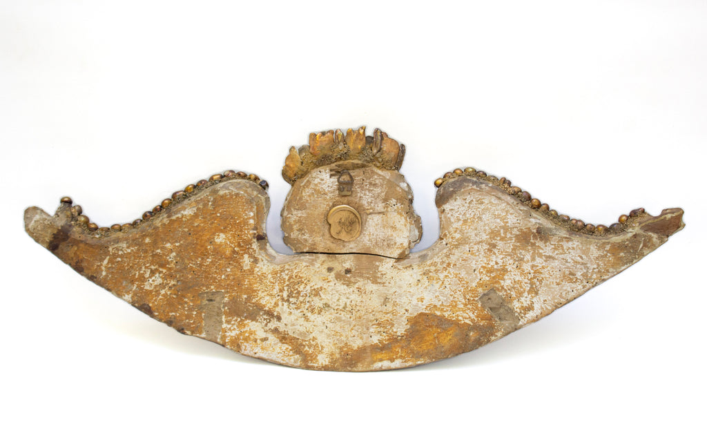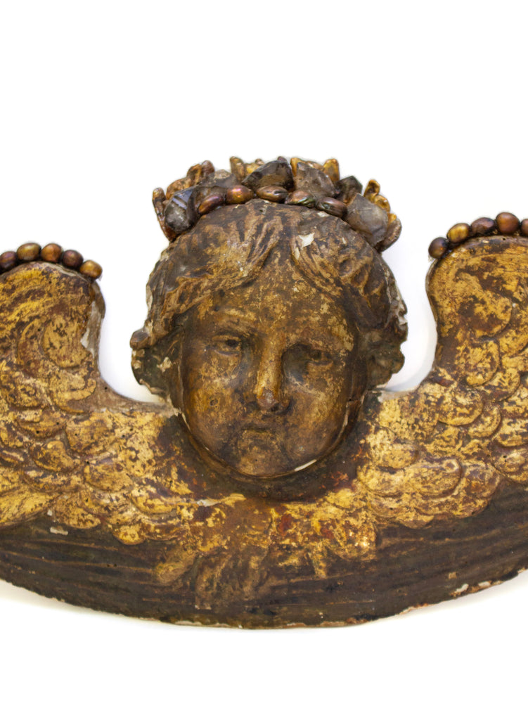 The angle artifact has been naturally distressed with age. The crown is made of faceted elestial crystal points and layered with baroque pearls above and beneath the faceted points, creating a natural forming crown adorning the angel head. Lining each wing of the angel is a row of coordinating baroque pearls.