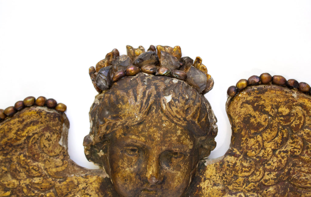 Early 18th century Italian angel wall piece with a crown of elestial crystal quartz and coordinating baroque pearls.