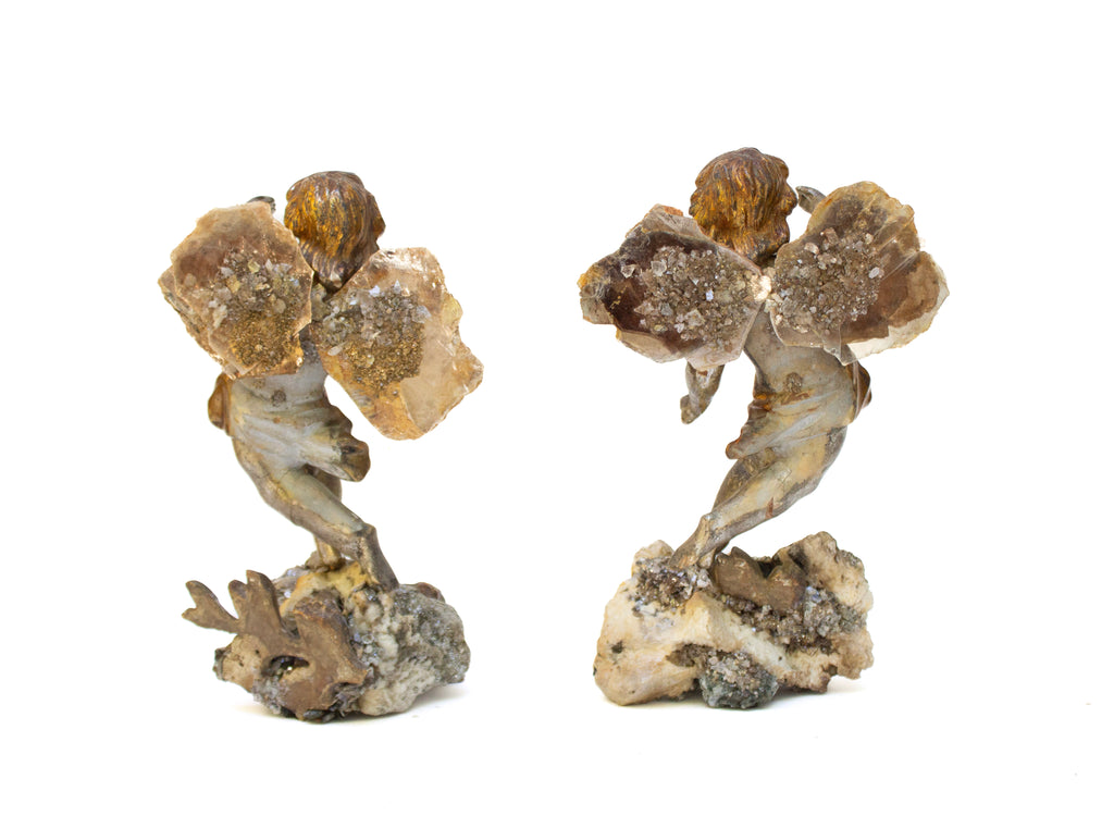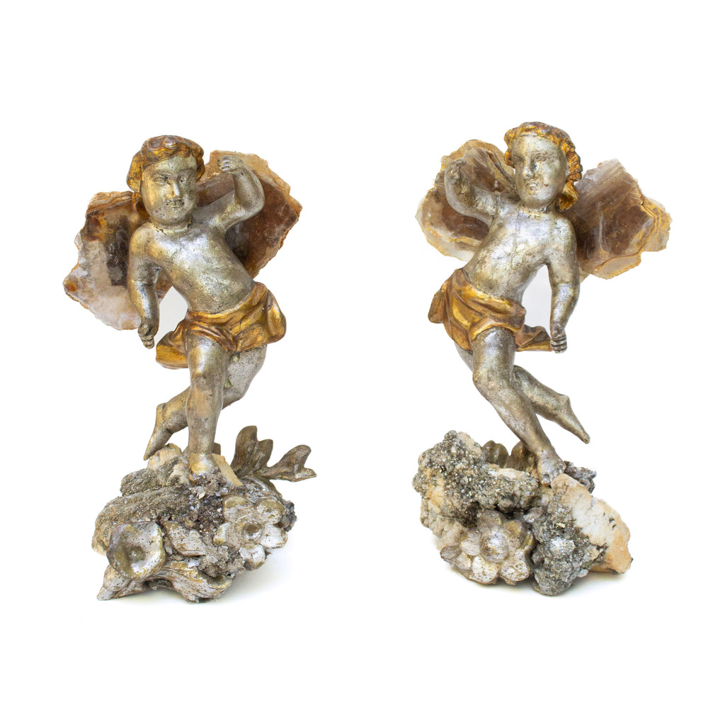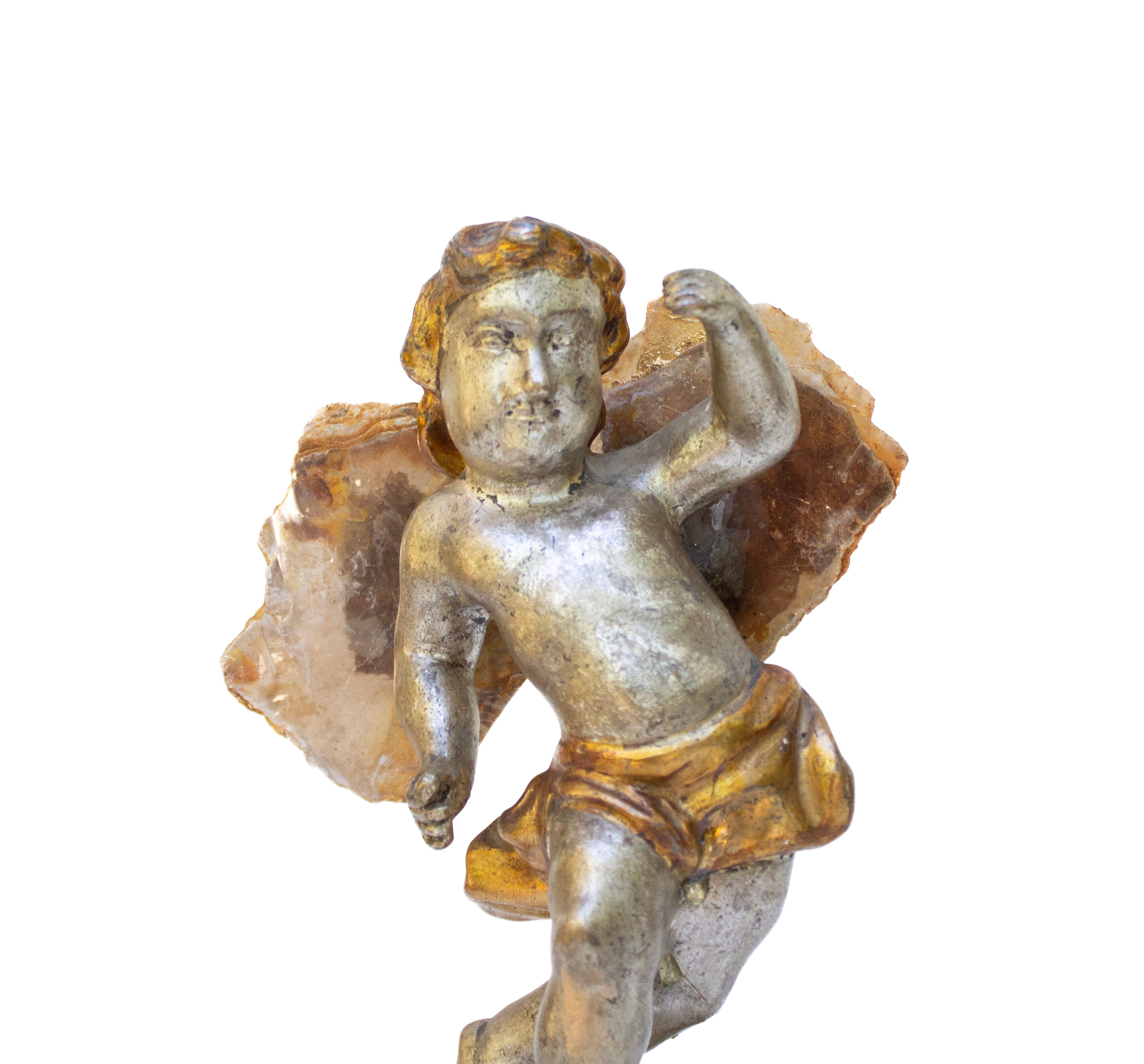 The angel artifacts are originally from a historical church in Italy. They are mounted on the mica in matrix formation which have 18th century Italian silver leaf flower fragments embedded into the mineral formation.