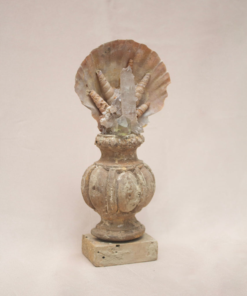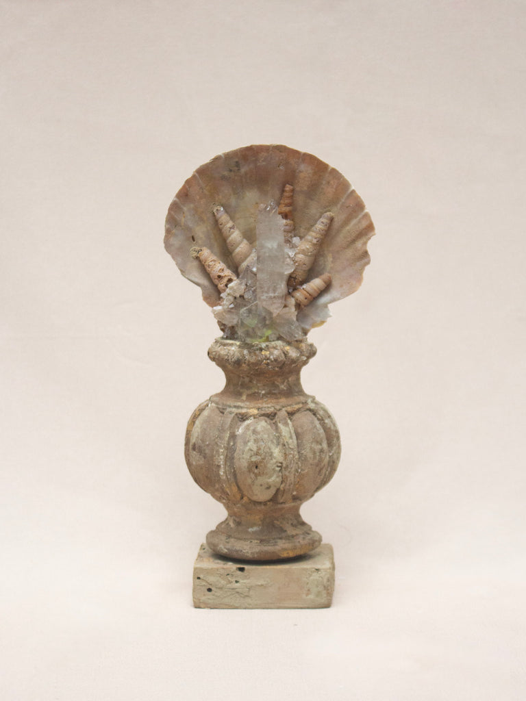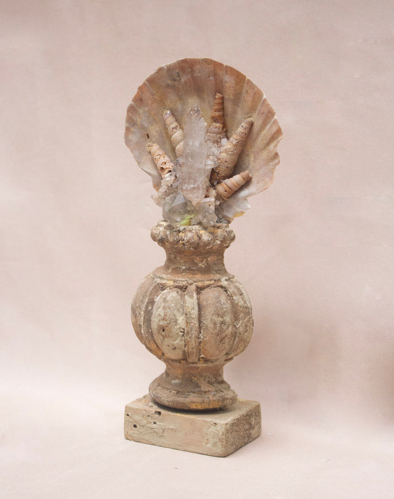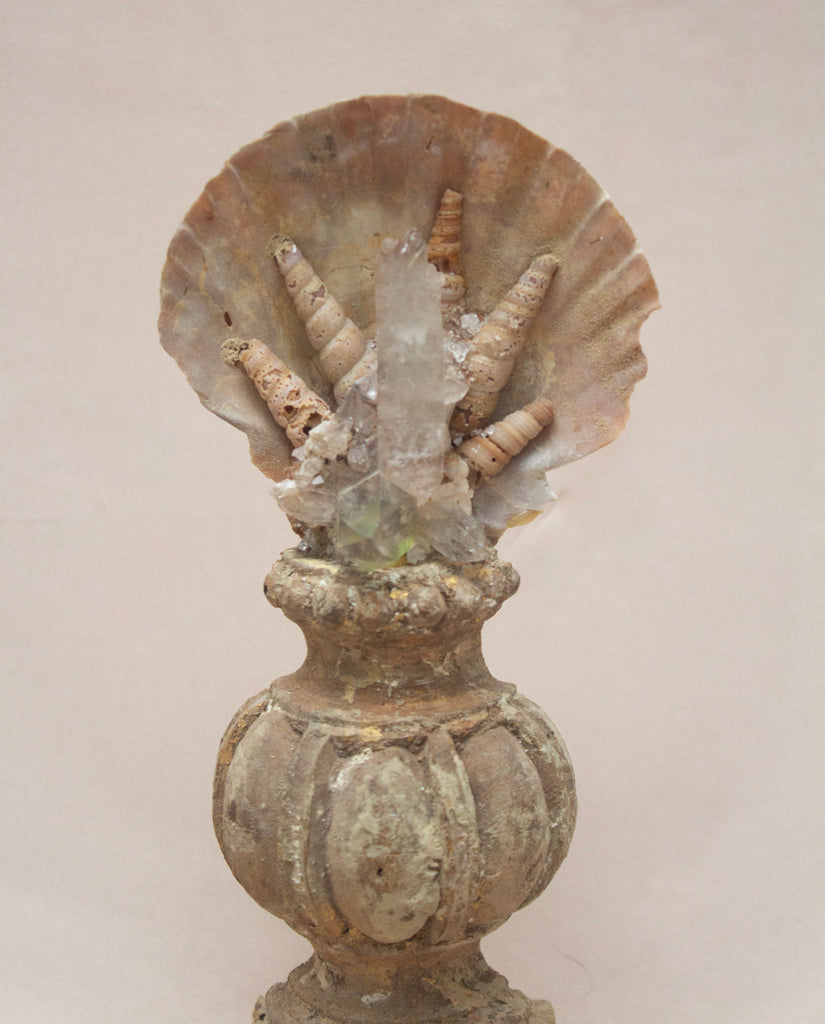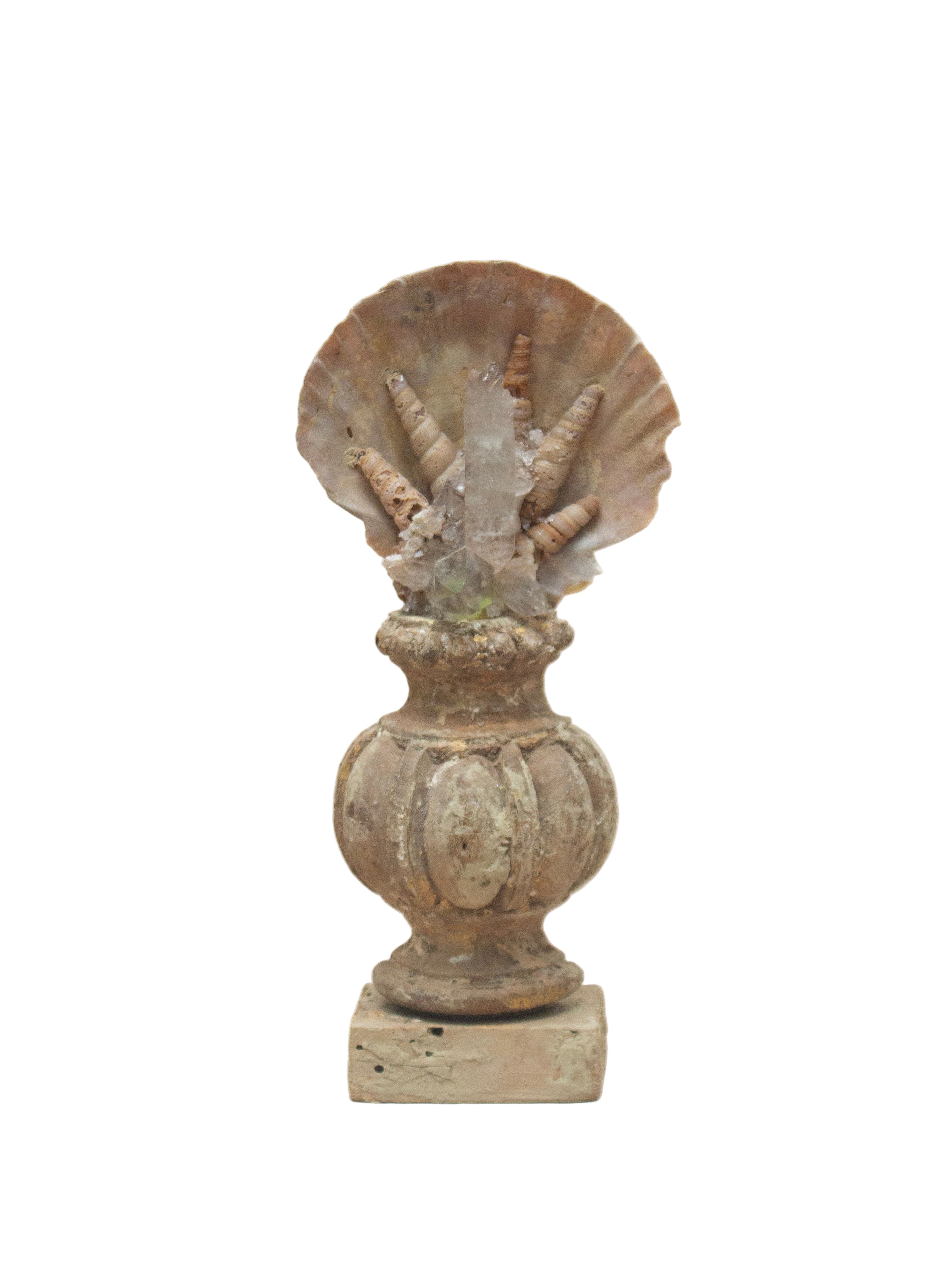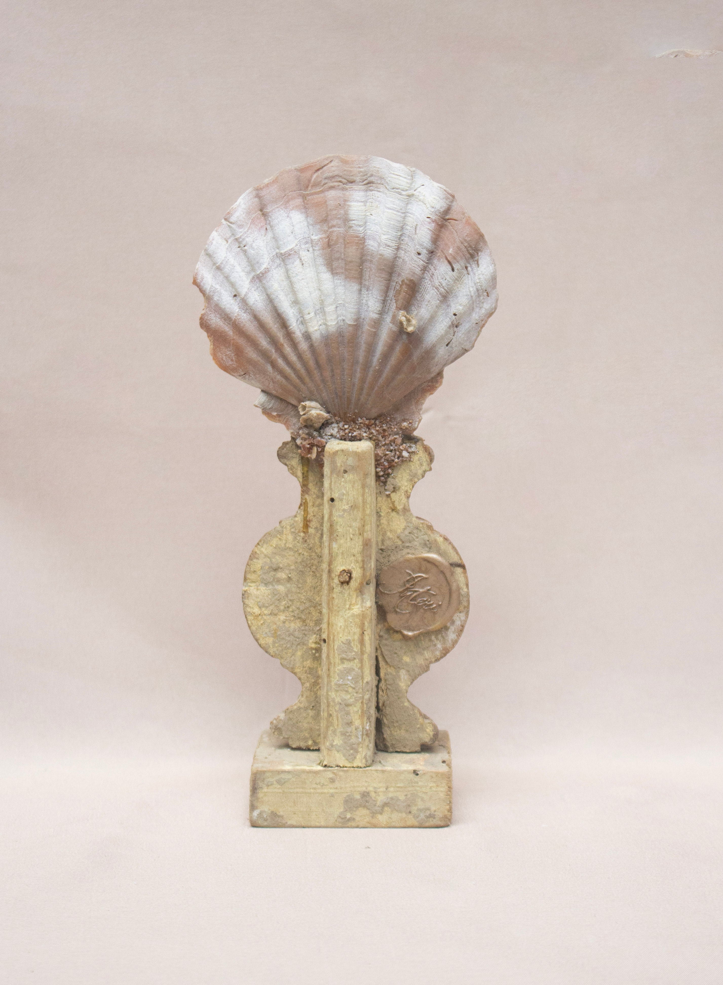 Sculptural 18th century hand-carved Florence Fragment with a chesapecten shell, turritellidae shells, and faden crystals.